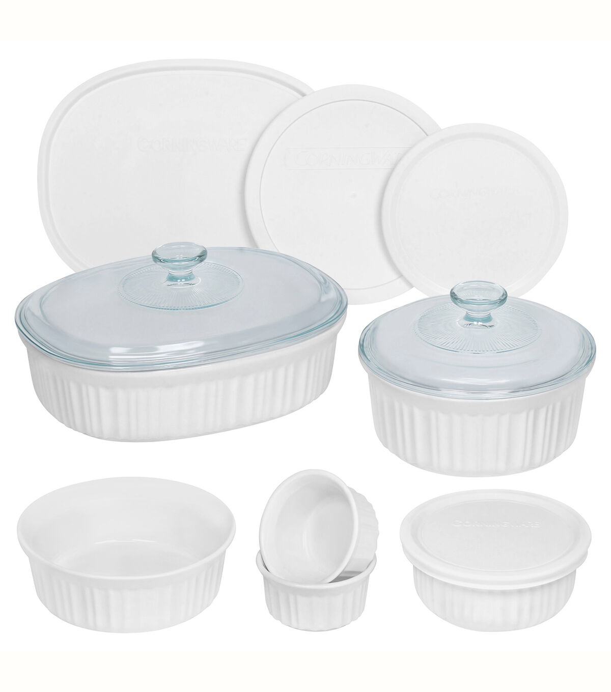 Durable stoneware construction provides even heating. Stoneware resists stains and does not absorb food odors or flavors. Plastic lids are top-rack dishwasher safe and microwave safe. Dishes are freezer microwave oven and dishwasher safe. Includes: Two 4oz Ramekins. 16oz Round Casserole dish (5.75'' Diameter). 24oz Round Casserole dish (6.5'' Diameter). 1.5qt Round Casserole dish (7.75'' Diameter). 2.5qt Oval Casserole dish (12.75''W x 9''D x 3.75''H). 2 Bakeware lids. 4 Storage lids.