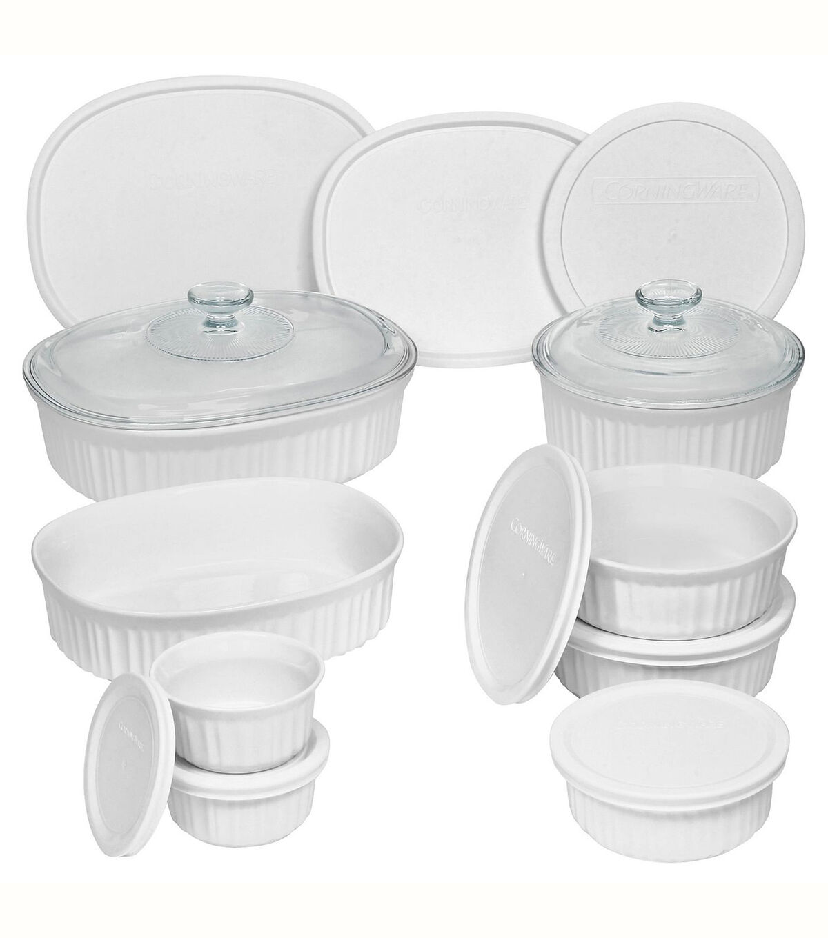 Durable stoneware for even heating. Resists stains and do not absorb food odors or flavors. Use the glass lids for cooking and plastic lids for storing leftovers. BPA-free plastic lids are top rack dishwasher safe. Dishes are dishwasher freezer microwave and preheated oven safe. Includes: 2.5qt Casserole dish (12.75''W x 9''D x 3.75''H). 1.5qt Casserole dish (10.75''W x 7.25''D x 3.5''H). 1.5qt Casserole dish (7.75'' Diameter 3.25'' High). Two 24oz Baking dish (6.5'' Diameter 2.25'' High). Two 7oz Ramekins with lids. 3 Bakeware lids. 5 Storage lids.