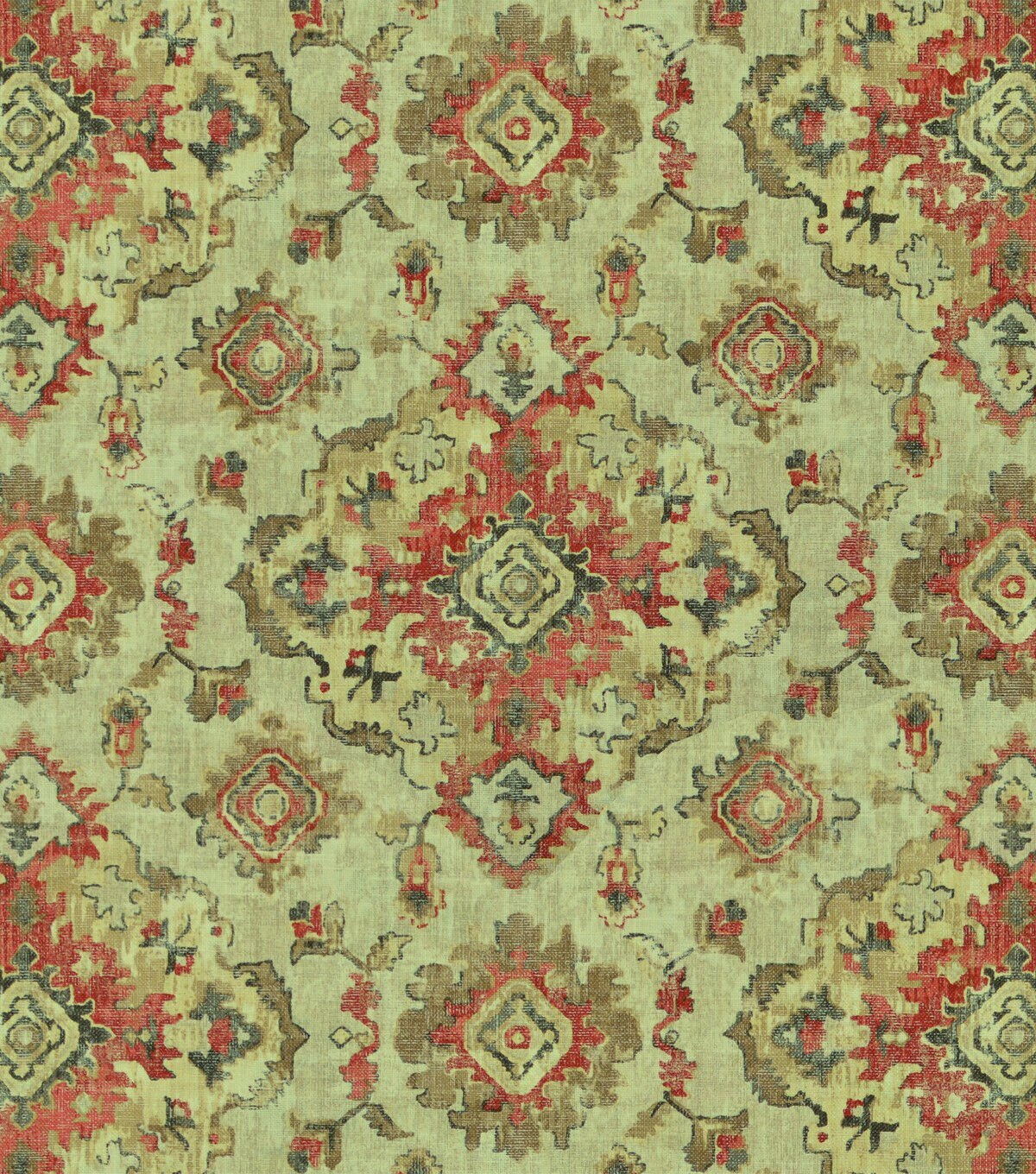 Featuring a globally medallion design, Kapoor was inspired by a antique carpet design. Printed on a cotton / linen base cloth, and with a distressed look, this pattern will enhance your room décor.