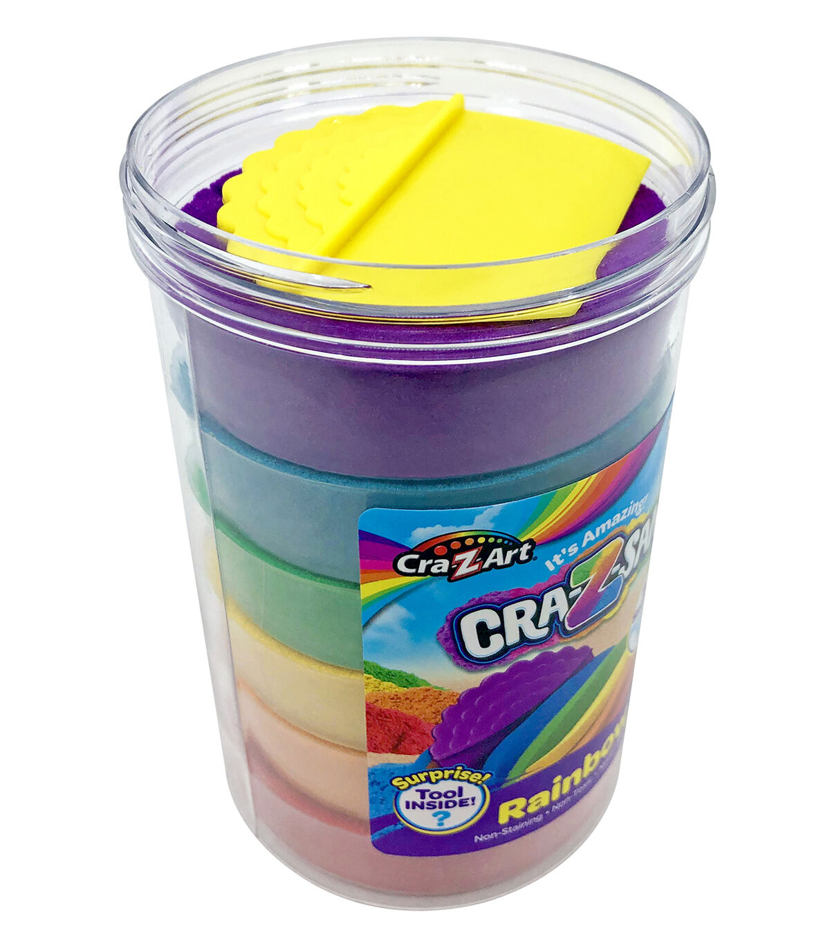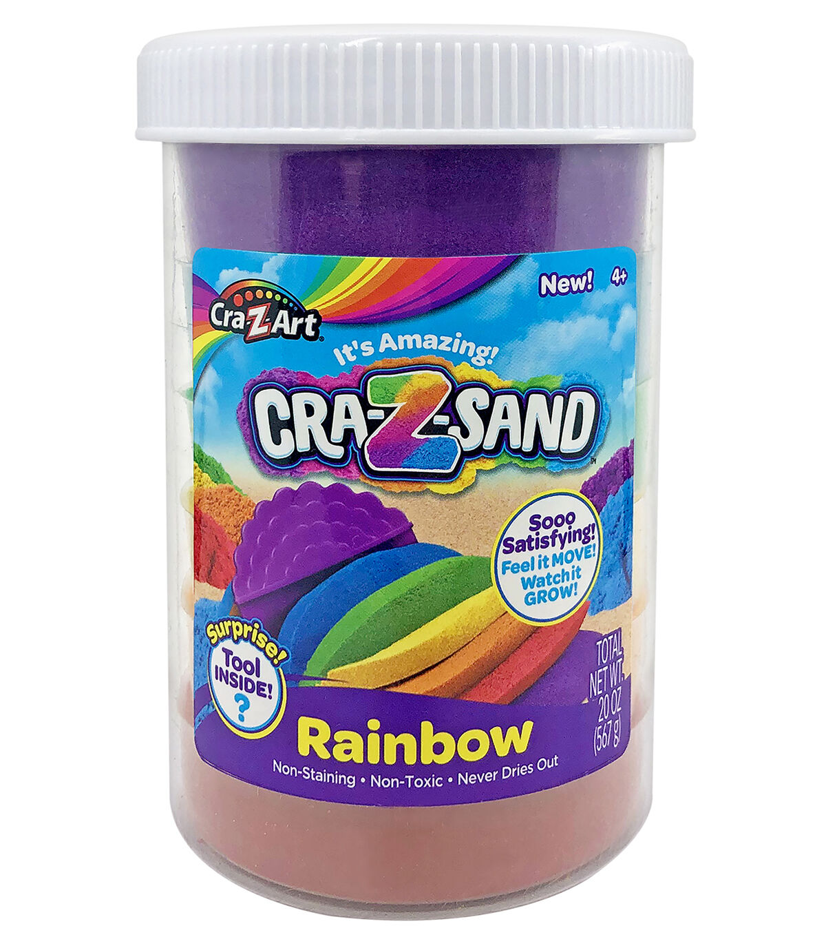 Looking for the perfect indoor or outdoor activity for kids ages 4 and up? You’ve found it with Cra-Z-Sand! This 19.2oz jar of Rainbow colored sand is super satisfying to play with. Kids will enjoy squeezing, molding, slicing, shaping, building, digging, and squishing Cra-Z-Sand. Rainbow jar of sand comes with 5 different colors of sand; red, yellow, green, blue and purple! The options are endless, Cra-Z-Sand has an amazing texture to it that allows you to feel the sand move and see it grow! The first fun Cra-Z-Sand adventure will be digging for the hidden bonus sand tool that comes in each 19.2oz jar. Use that tool to create endless play scenes and play patterns. Another great feature of Cra-Z-Sand is it’s easy and mess free cleanup. Cra-Z-Sand only sticks to itself which makes cleanup quick and easy for everyone. Cra-Z-Sand Rainbow Jar is re-useable making it great for storage. Kids will love the sensory play patterns as they watch the sand grow and move right before their eyes. Cra-Z-Sand is so fun to mold and squeeze. Cra-Z-Sand. Cra-Z-Sand is safe and non-toxic and is great for ages 4 and up. Cra-Z-Sand, It’s Amazing!