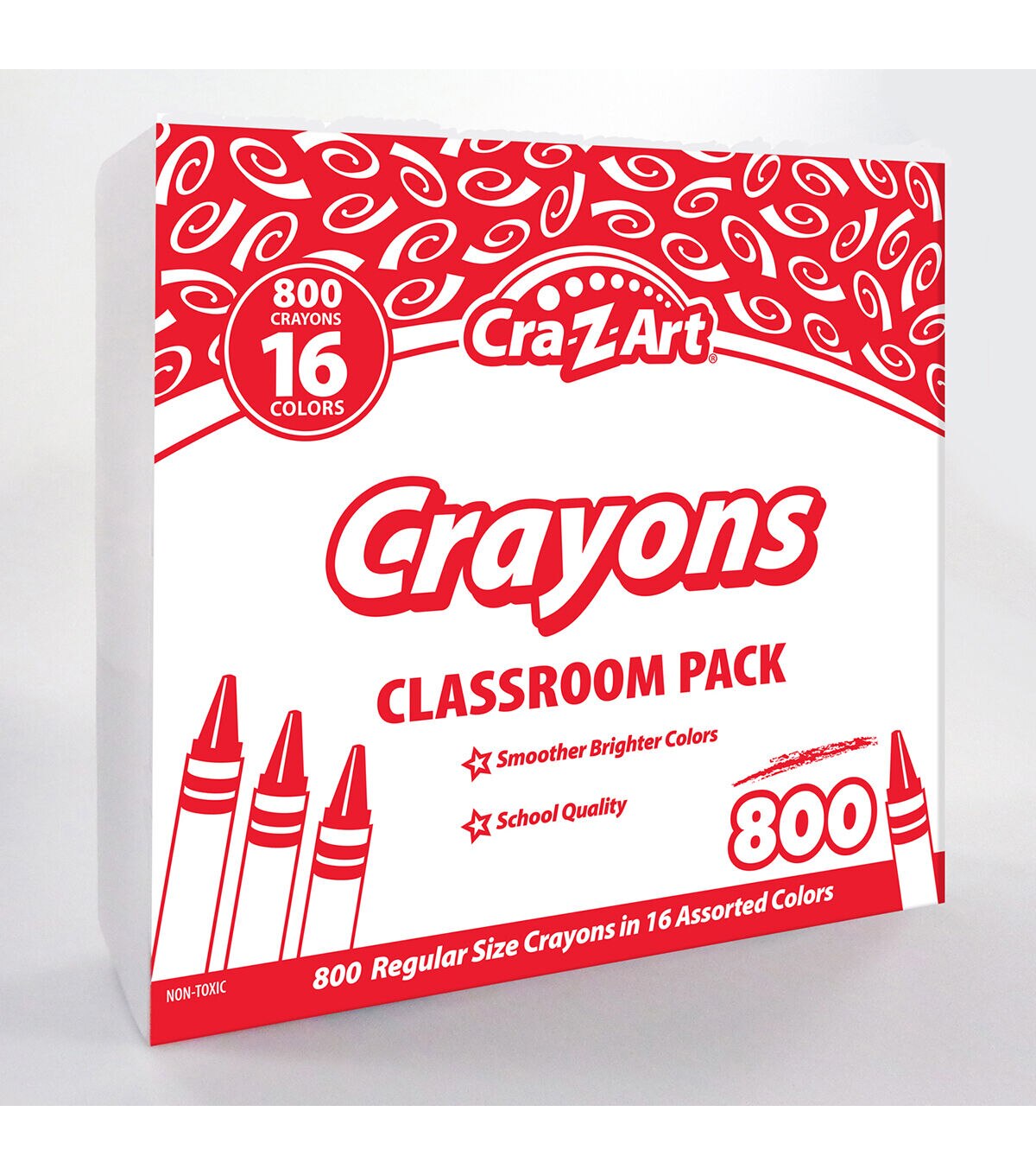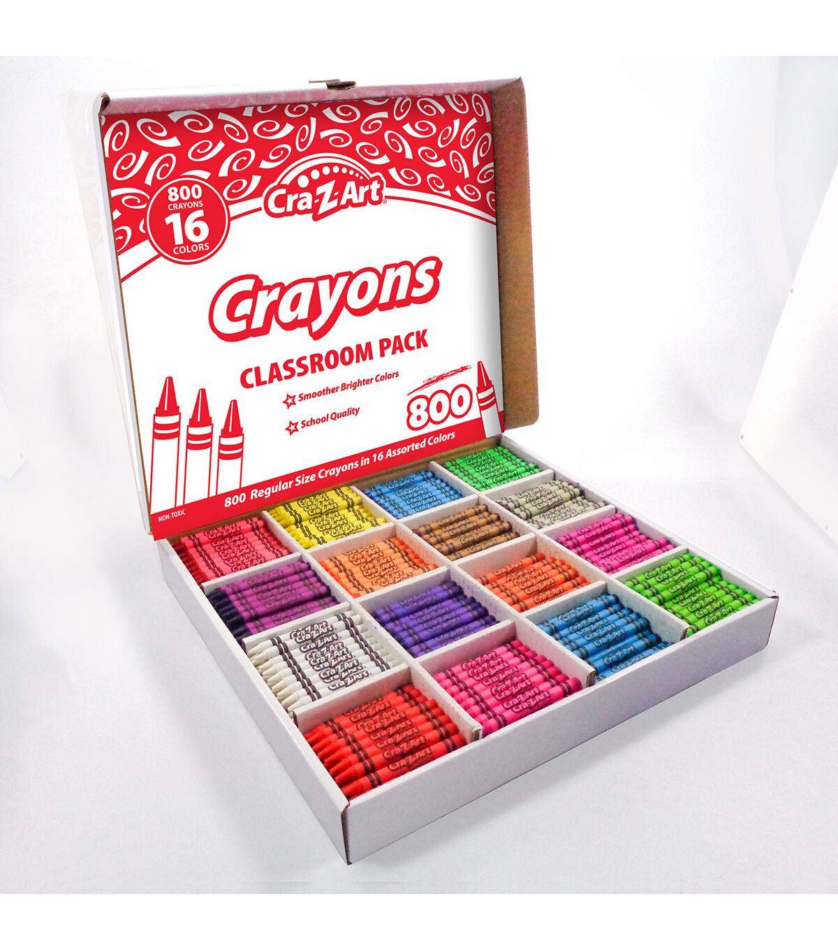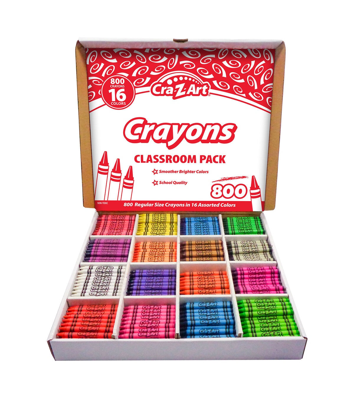 Cra-Z-Art's crayon multi-pack has 16 different colors for endless creativity. The crayons are smooth and bright. The box has an easy open and close lid featuring a compartment for each color. The crayons are school quality and non toxic. Perfect for classrooms! Each box includes 800 crayons in 16 colors.