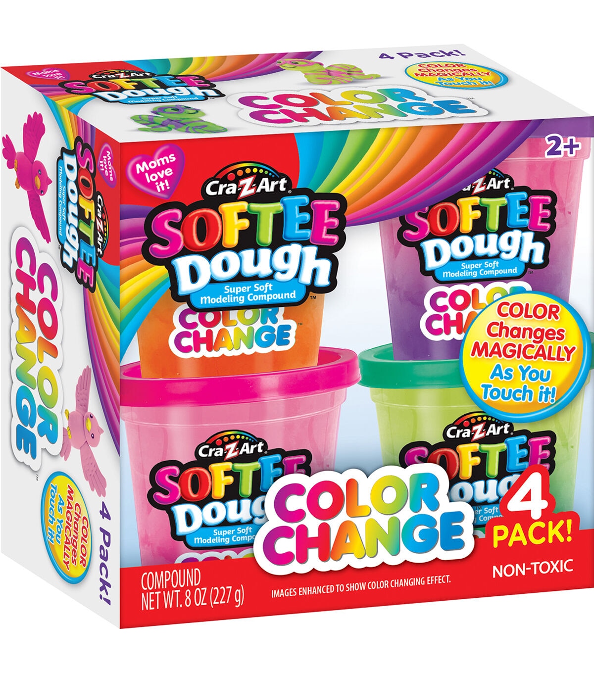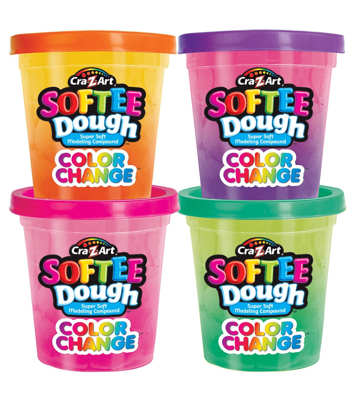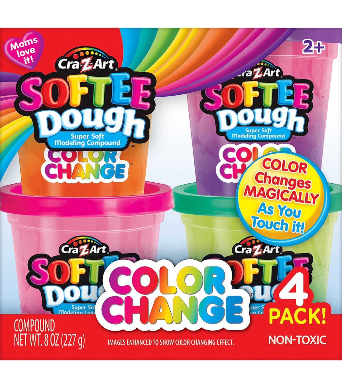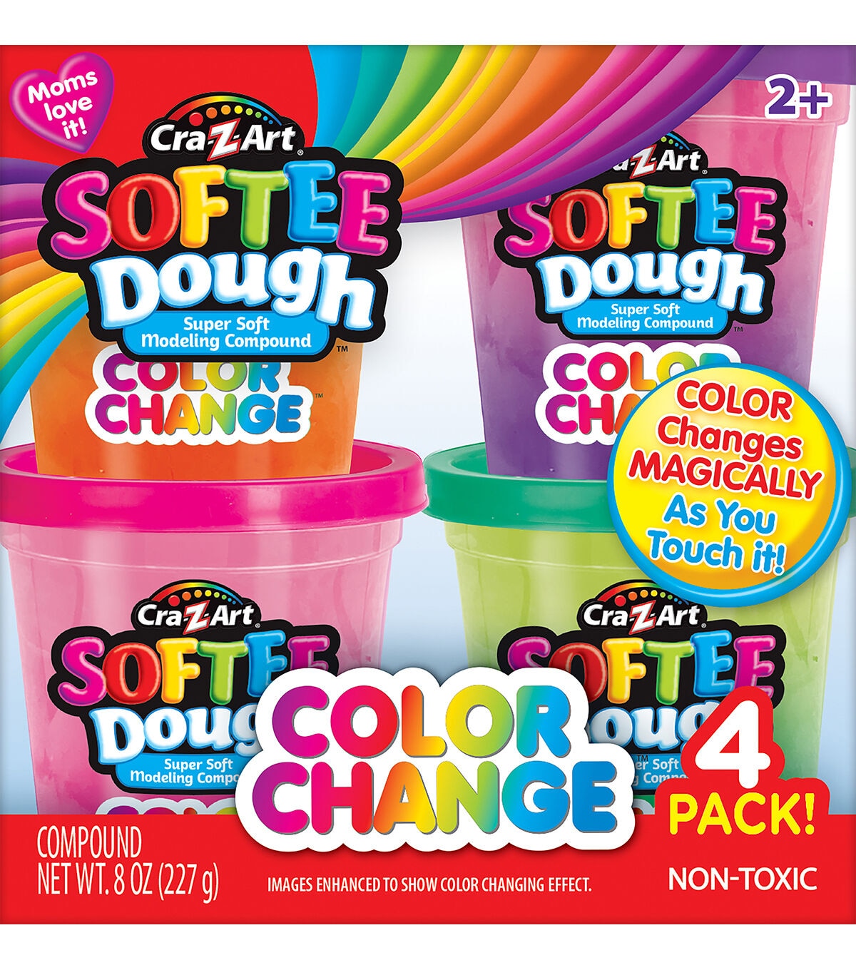 Color change dough is a unique sensory experience, this Softee Dough changes color with the warmth of your hand! Includes 4 containers of dough which provides you 8 different colors of Softee Dough. Place the dough in the fridge for quick color change! Classic Softee Dough with a unique twist! Mold it, roll it, stamp it, and more! Perfect for creative little hands! Stay always creative with Cra-Z-Art!