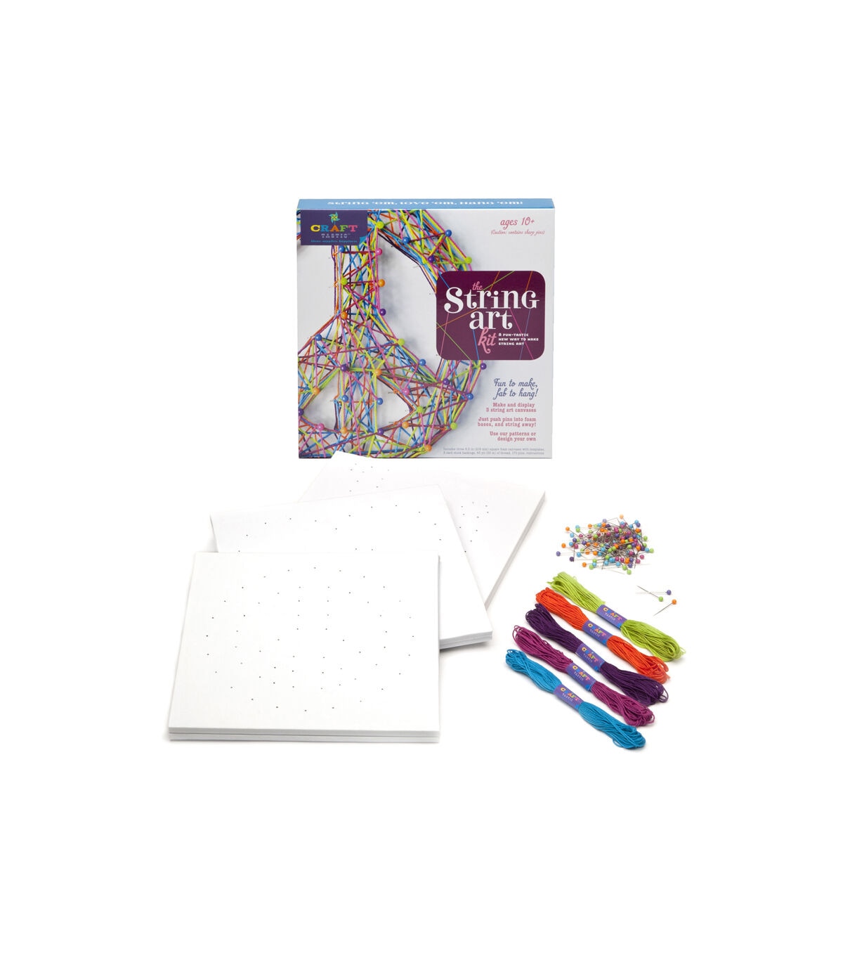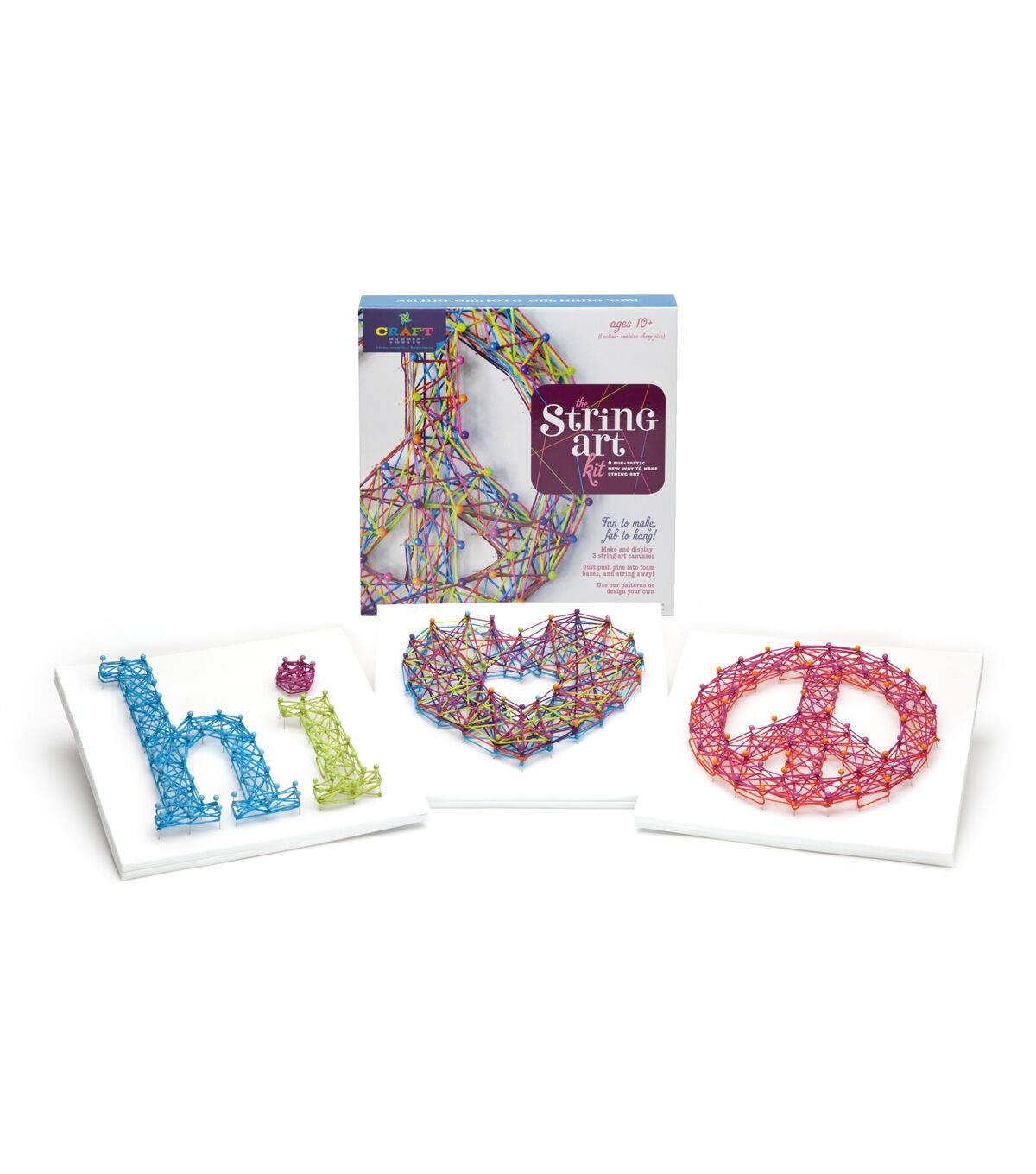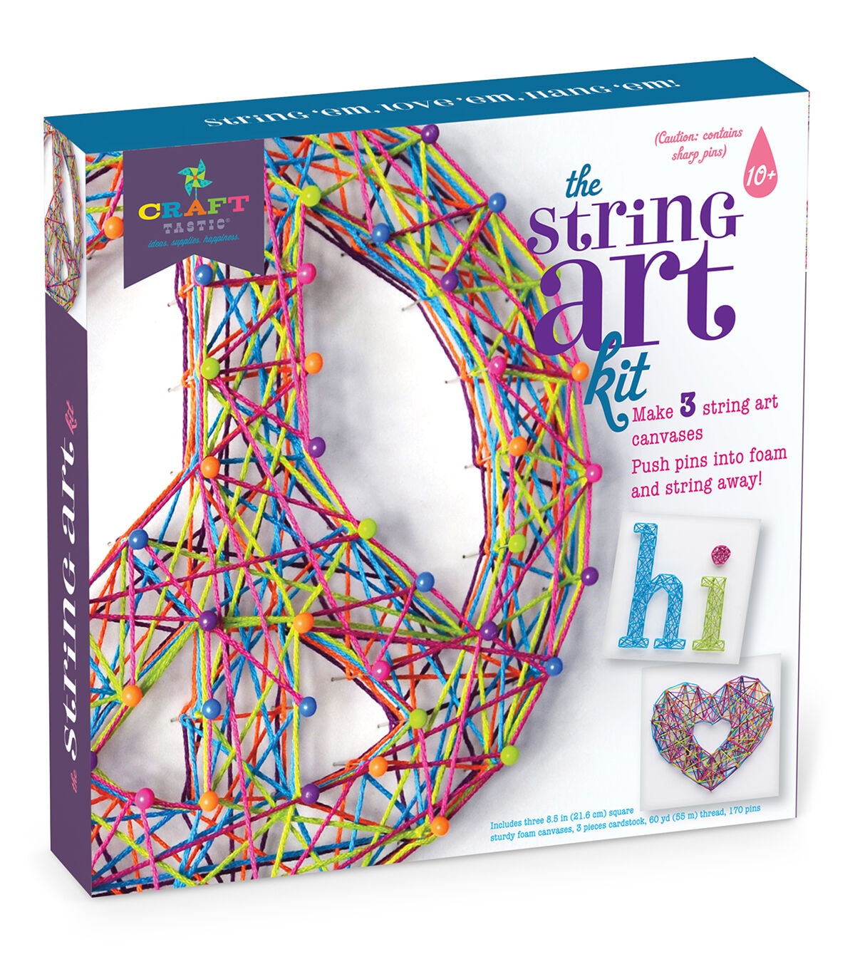 Includes 3 sturdy foam canvases (each 8.5" square and .5" thick) plus plenty of multi-colored pins and threads to complete the project.