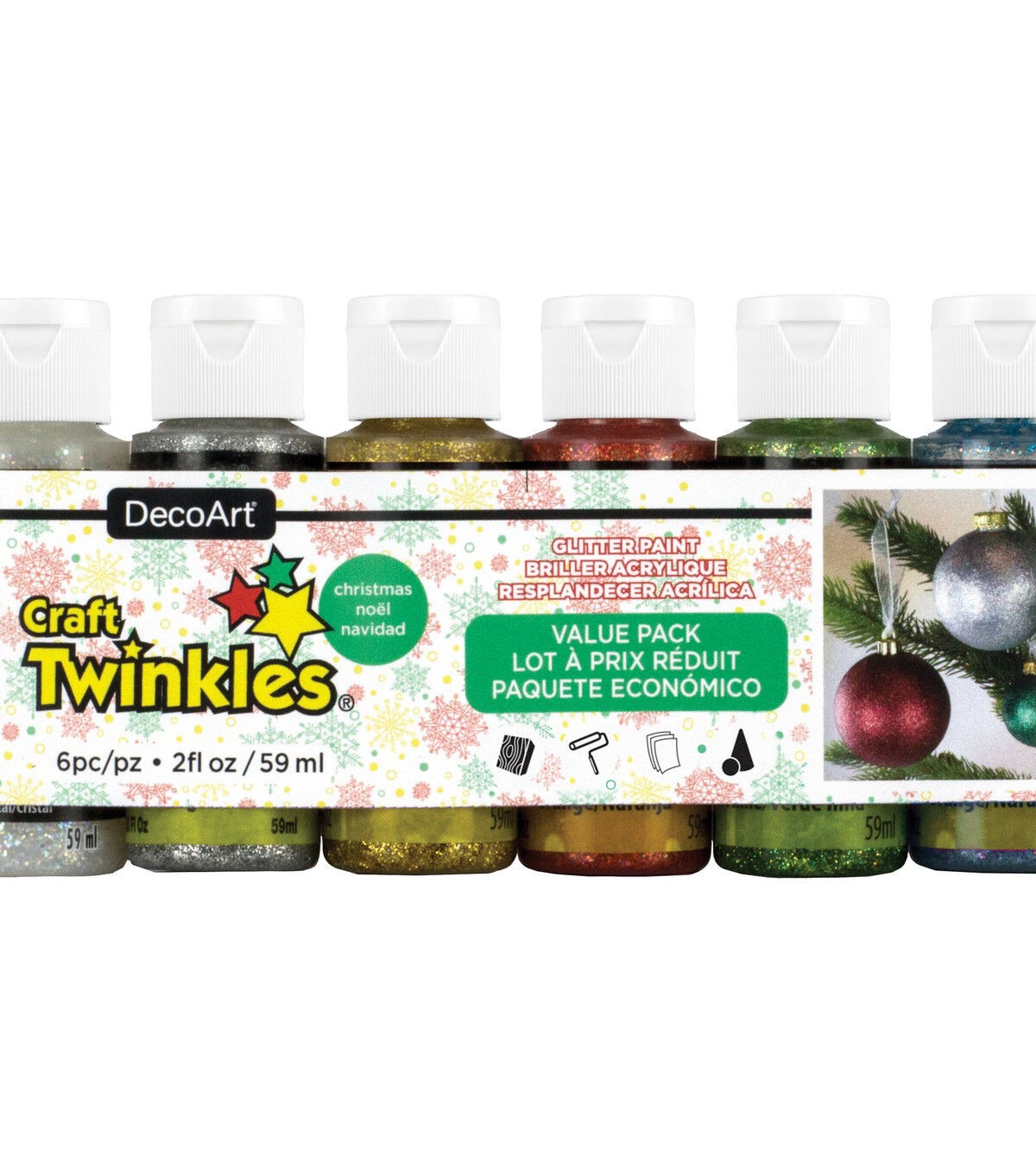 Craft Twinkles Glitter Paint is an acrylic paint loaded with flakes of bright, shiny glitter. This brush-on glitter is the easiest and most convenient way to add sparkle to any project. The clear base makes it easy to see brush results and is less messy and more accurate than sprinkle-on glitter. Use on virtually any craft surface such as frames, lamps, vases, candles and ornaments. Value pack contains six 2oz bottles of Craft Twinkles Glitter Paint in Crystal, Silver, Gold, Christmas Red, Christmas Green and Galaxy Blue. Conforms to ASTM D4236. Imported.