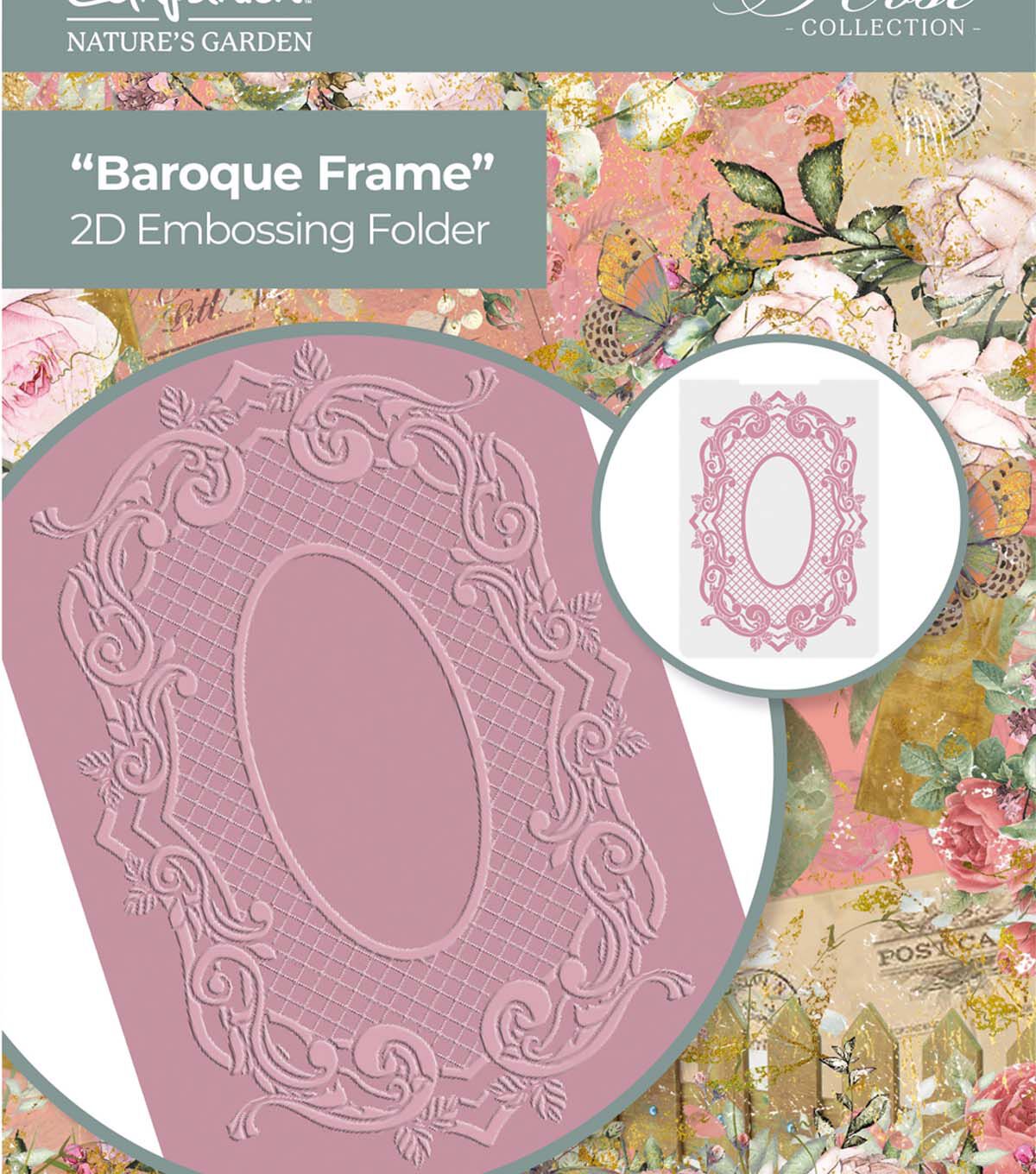 The Vintage Rose Baroque Frame 2D Embossing Folder creates a raised and embossed design of an oval frame, filled with swirls, filigrees and a trellis pattern. It’s the perfect backdrop for elegant cards, event stationery or keepsake gifts.