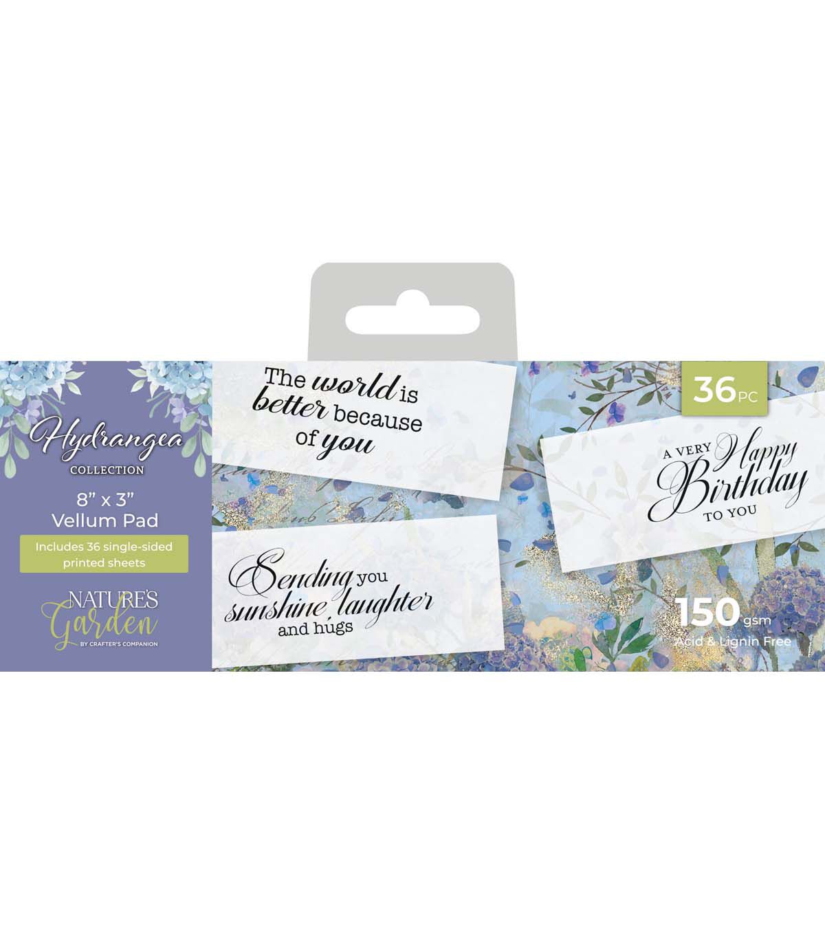The Nature’s Garden Hydrangea 8” x 3” Vellum Pad includes 24 sheets of softly translucent vellum, printed with 12 uplifting and thoughtful messages, each sized to decorate and top your cards and crafts