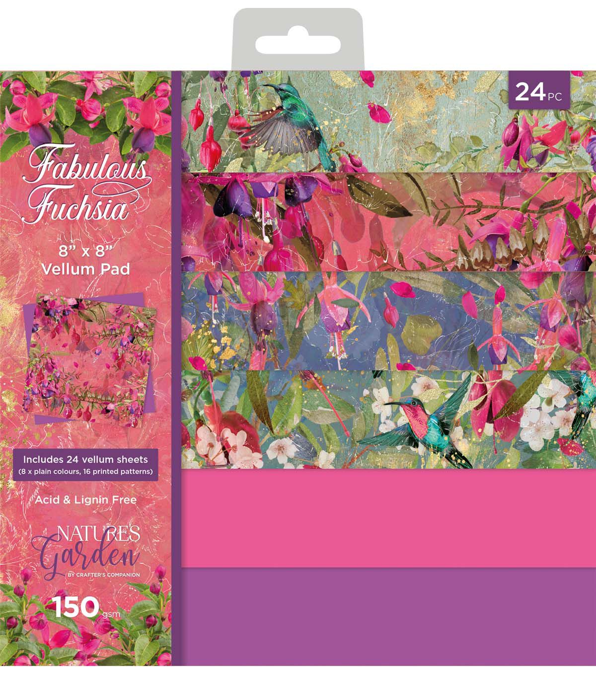 The Nature’s Garden Fabulous Fuchsia 8” x 8” Vellum Pad includes 24 sheets of patterned vellum. Subtly translucent, vellum is perfect for creating projects with stunning overlays, windows, lanterns and so much more.