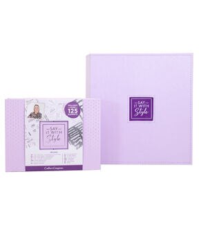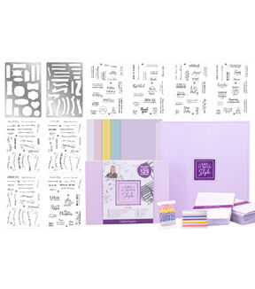The perfect start to your next scrapbooking project! This package contains (2) 5.75x8.75 inch dies, (8) 5.75x8.75 inch stamps, (1) 5.75x5.59 inch stamp, (1) 5.75x3 inch stamp, (50) pastel coloured card, (1) project pocket wallet, (1) magnetic die panel, (2) die storage wallet, (5) 1m satin ribbon, (5) 2m baker's twine, (25) card blanks, (25) envelopes, (5) stamp panels, (1) binder.