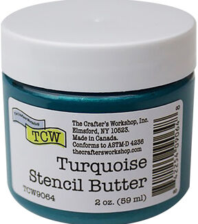 Delicious spreadable Stencil Butter has a shimmer and shine, that spreads easily with a palette knife. It has the body of a soft modeling paste that holds its peaks and valleys for texture and interest and cleans easily with water (be sure to rinse your tools immediately after use). Perfect for spreading through stencils, finger-painting, brush-painting and much more. These colors blend beautifully with each other as well as with all of our Mixed Media Goodies, including our Metallic Pastes! TCW Stencil Butters coordinate beautifully with our ColorSparx Powders. You can even mix the dry powder into the Stencil Butter to create additional unique color tones. Available in easy to use 2 ounce jars. Dries in 15-30 minutes depending on how thickly applied. Great for use on Watercolor Paper, Mixed Media Boards, Canvas, Wood and more.