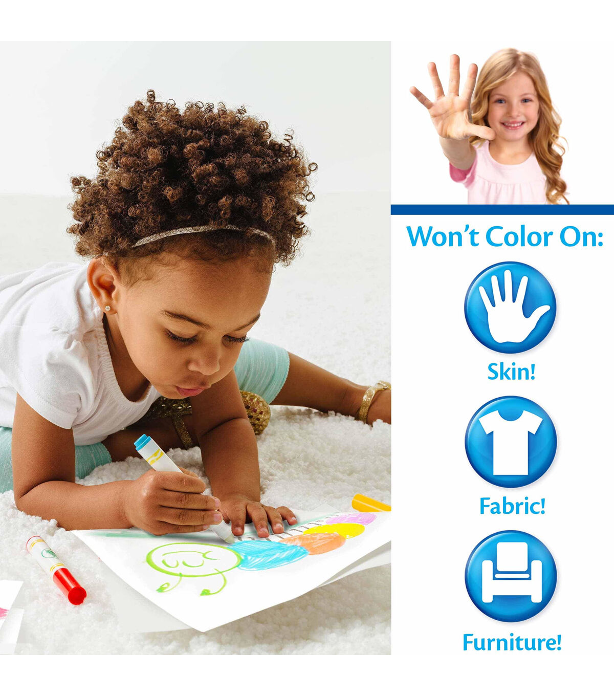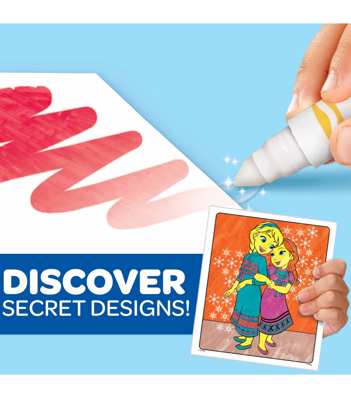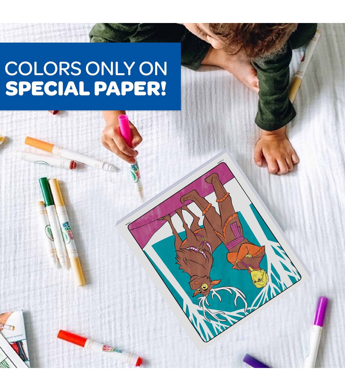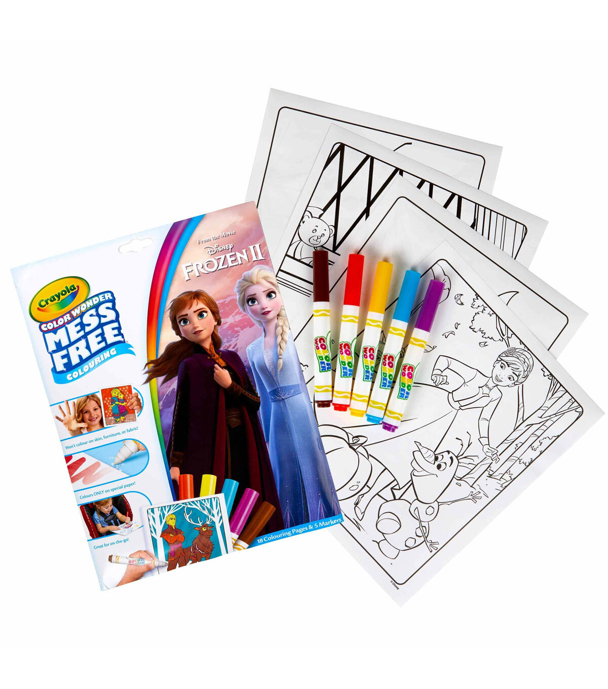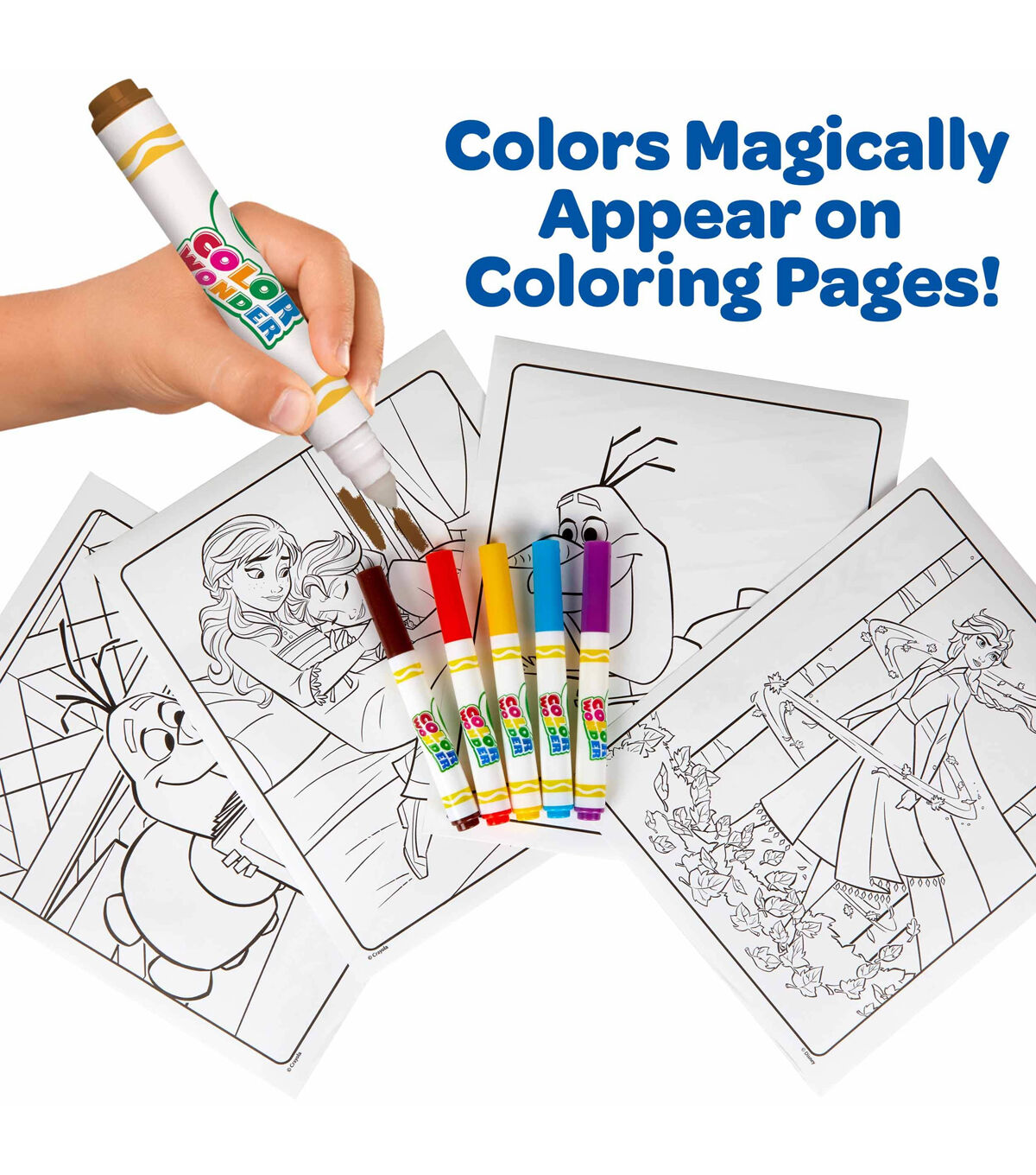 Crayola-Color Wonder Disney Frozen. Colors magically appear only on color wonder paper! They will not color on skin, furniture or fabric. This package contains eighteen 10x8-1/2 coloring pages and five color wonder markers. Recommended for ages 3 and up. WARNING: Choking Hazard-small parts. Not for children under 3 years. Conforms to ASTM D 4236. Non-toxic. Made in USA.