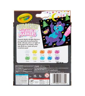 Crayola Broad Line Markers are essential kid art supplies both in and outside the classroom, and now with Bright & Bold Crayola Colors, they make a statement on light and dark paper. Perfect for beginner artists, this washable marker set washes away from skin, most washable clothing, and furniture. Whether kids are coloring in their favorite coloring pages or drawing pictures for class, each marker features a conical tip that can be used for thick or thin lines. Pair these kids markers with other Bold & Bright products including Construction Paper, Twistables Colored Pencils, and Crayons (each sold separately) for a fun bundled gift idea.