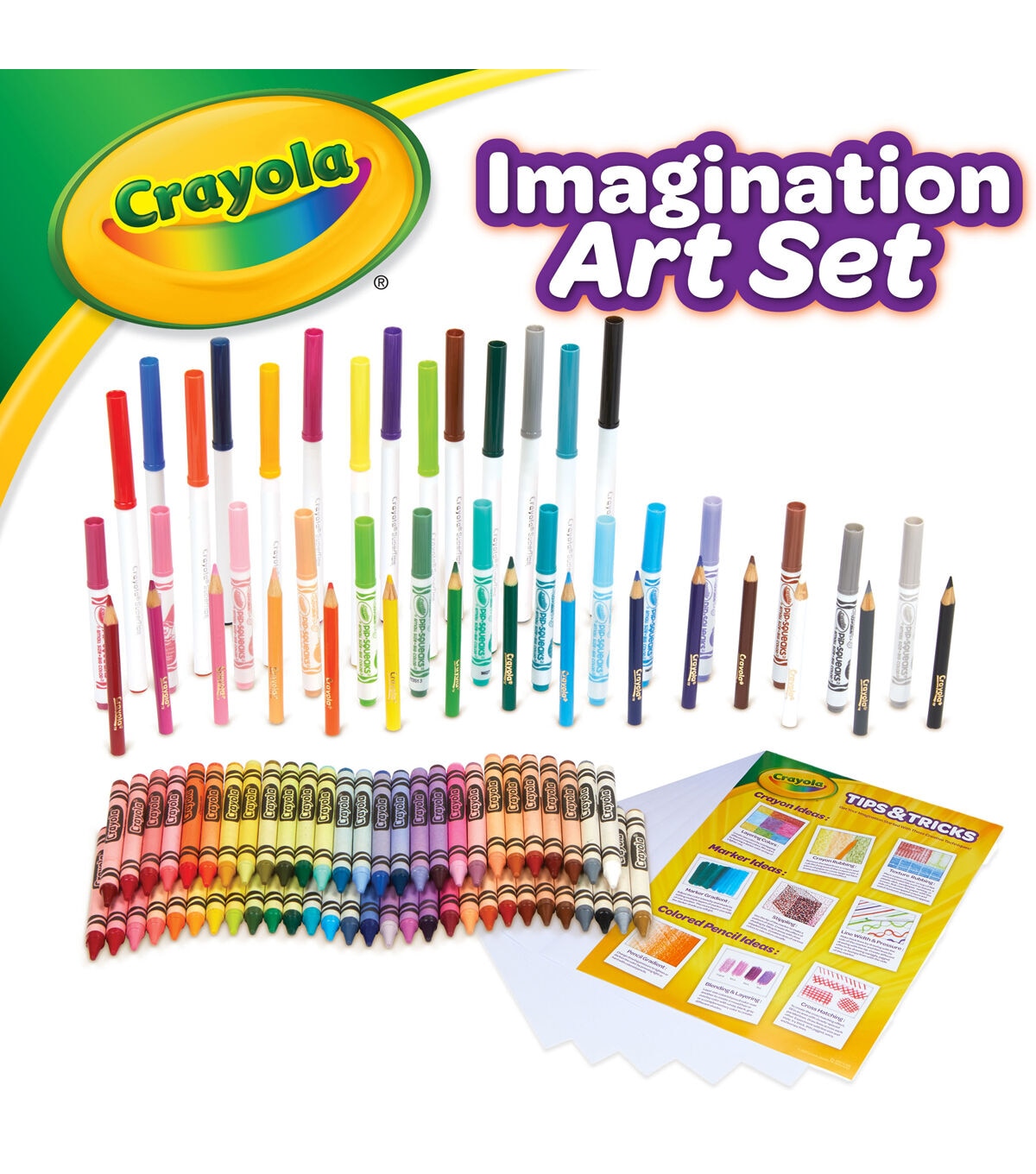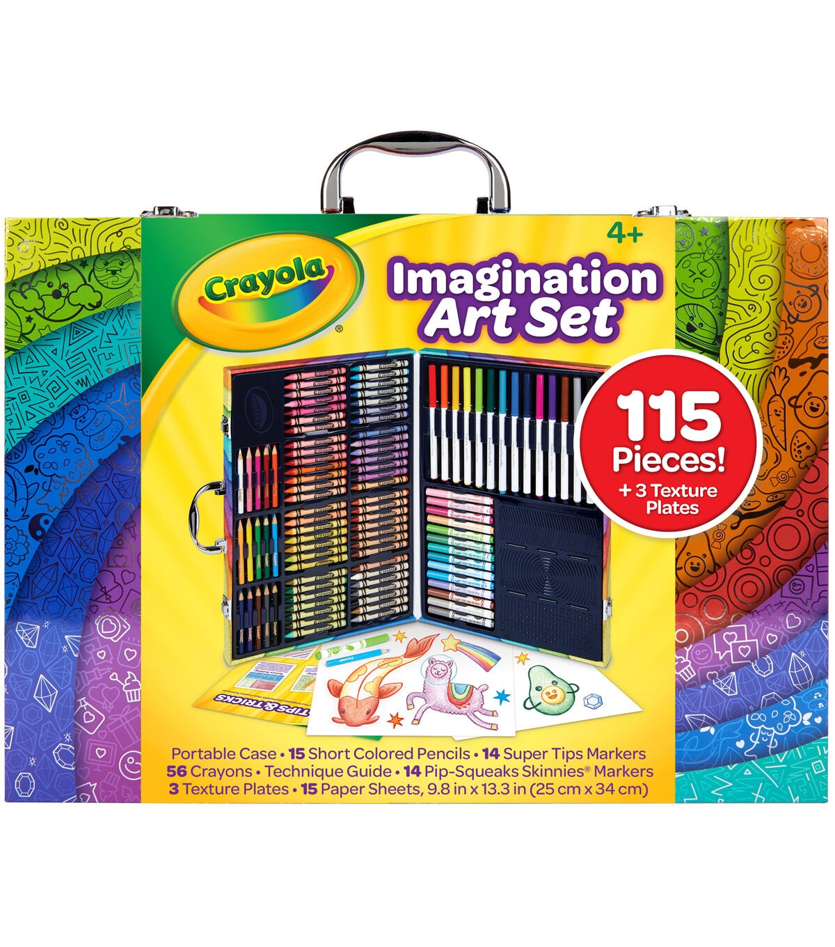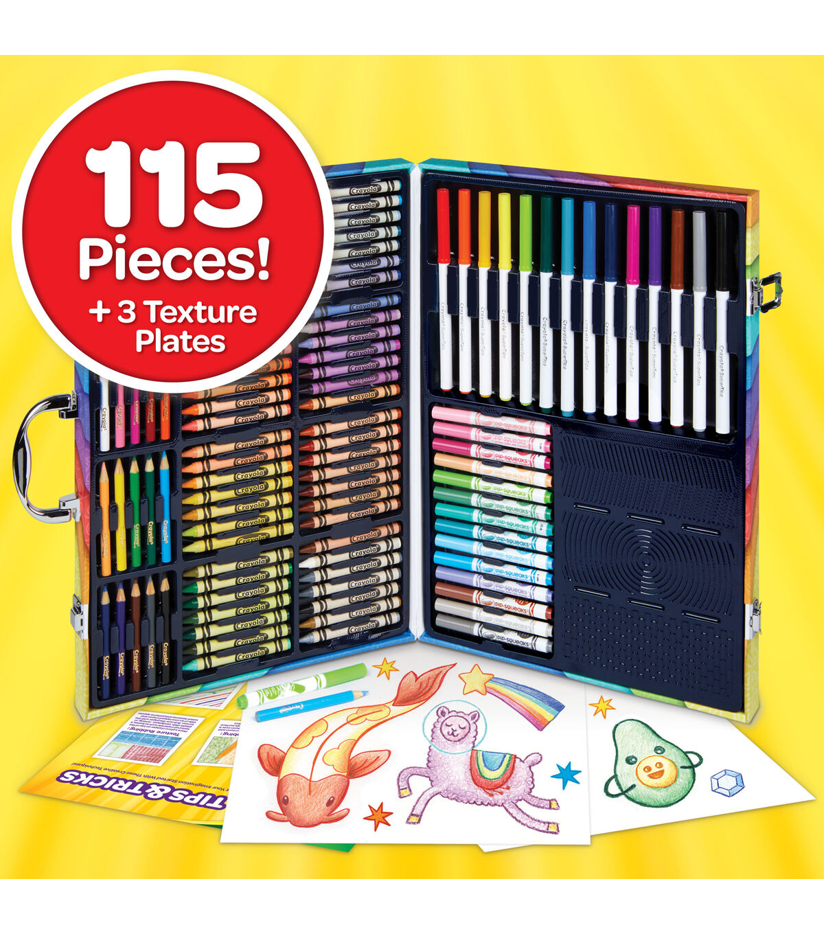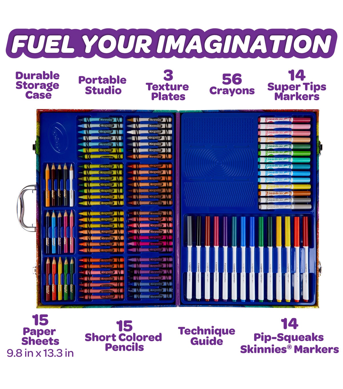 - Features 115 Pieces in a Storage Case, including 14 Super Tips Markers, 15 Short Colored Pencils, 14 Pip Squeaks Skinnies Markers, 56 Crayons, 15 Large Sheets of Paper, 3 Rubbing Plates, and How to Guide.