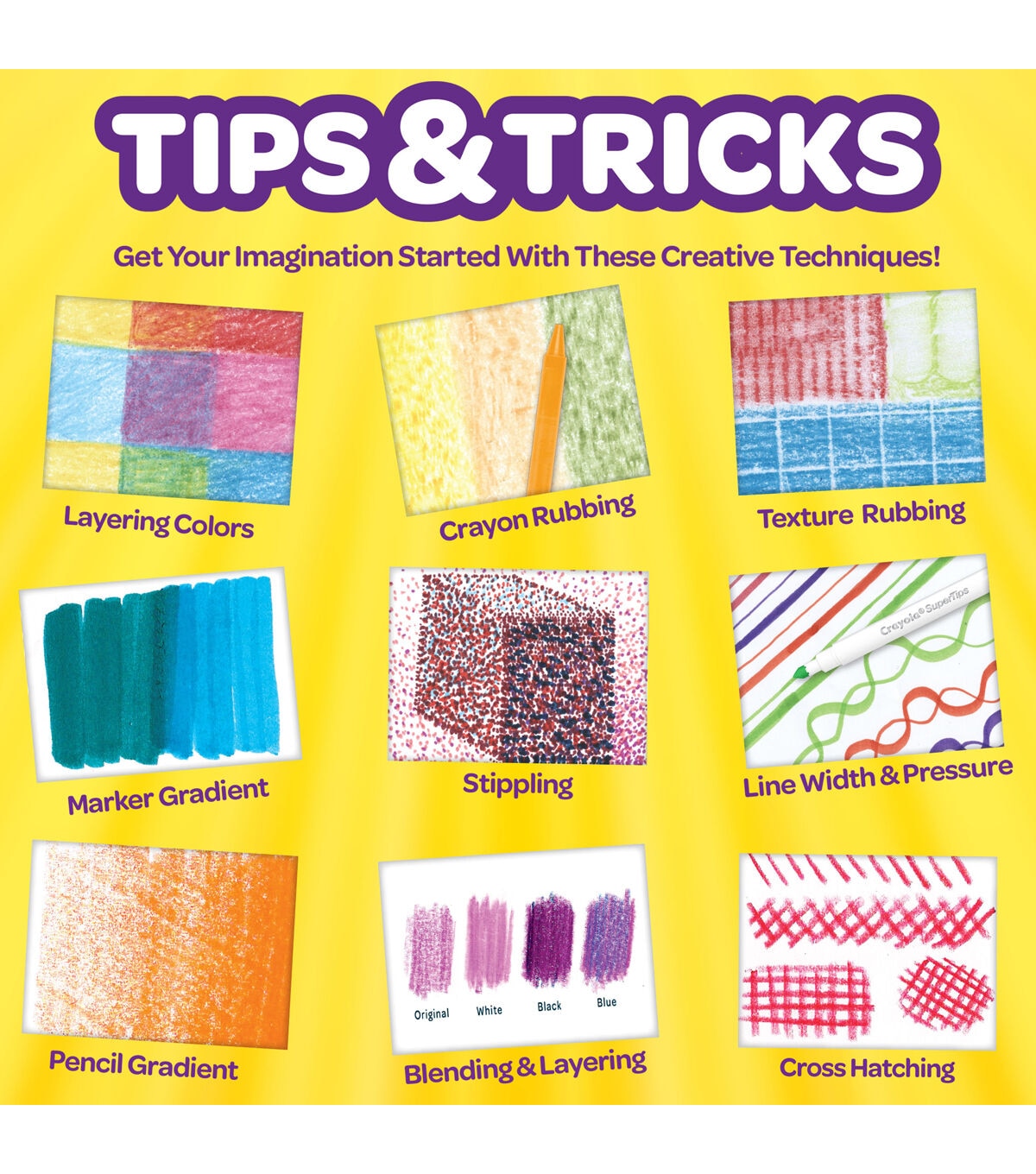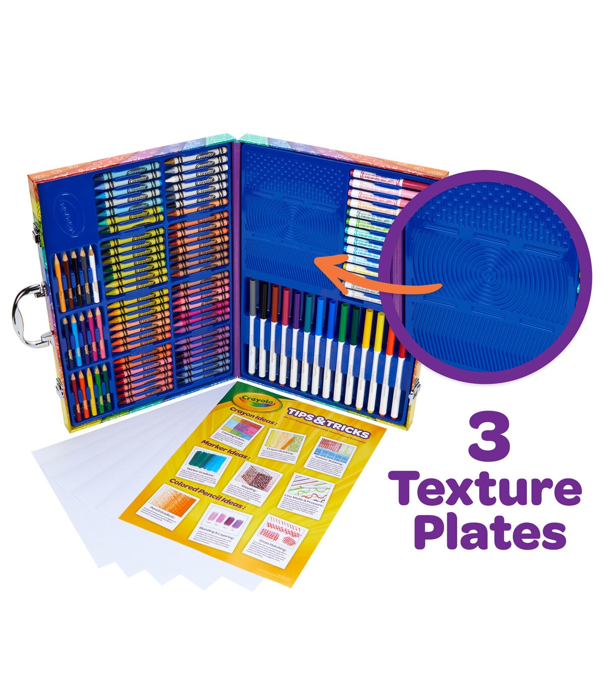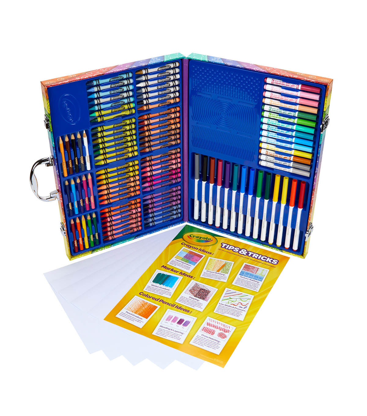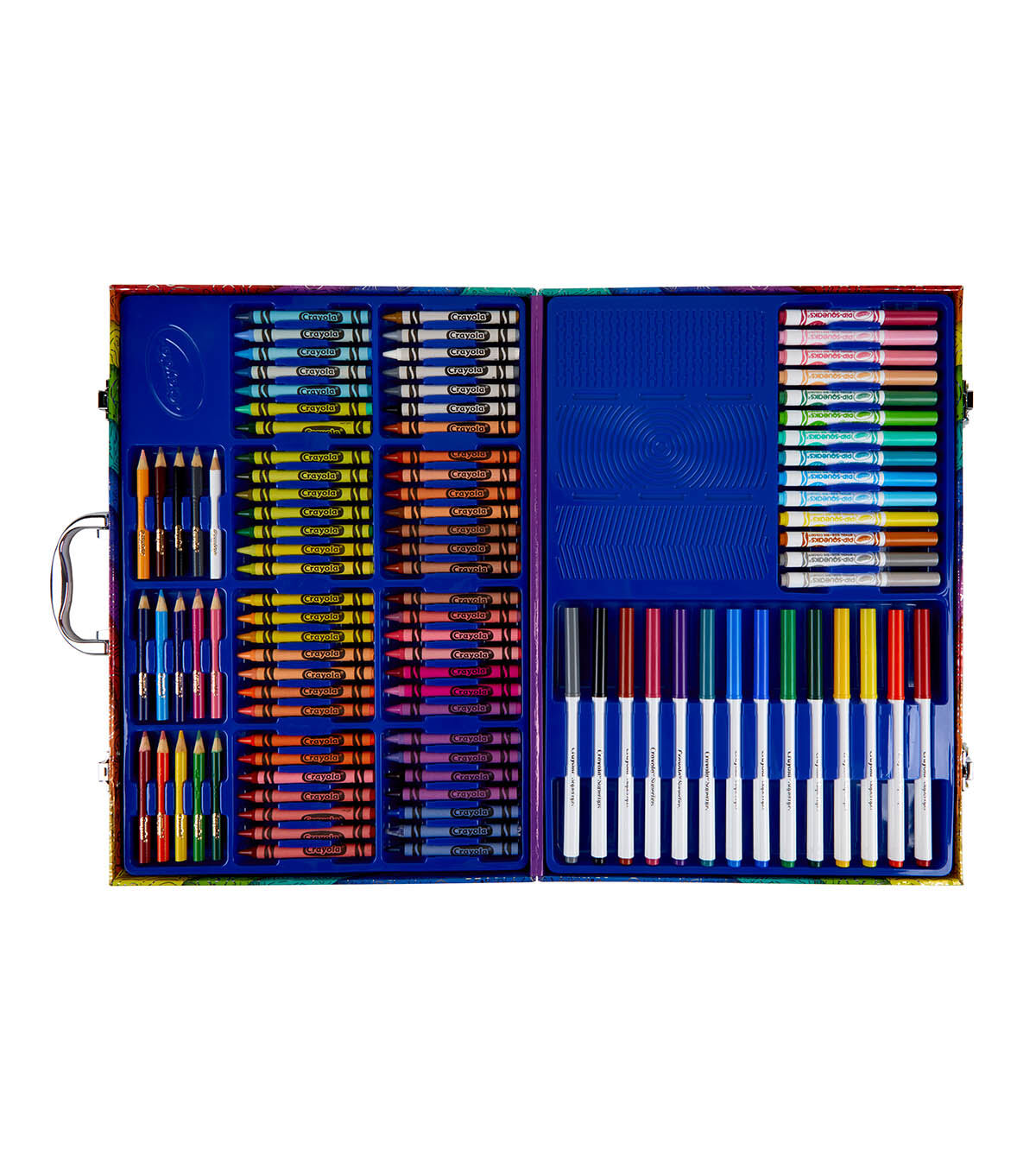 - Features 115 Pieces in a Storage Case, including 14 Super Tips Markers, 15 Short Colored Pencils, 14 Pip Squeaks Skinnies Markers, 56 Crayons, 15 Large Sheets of Paper, 3 Rubbing Plates, and How to Guide.