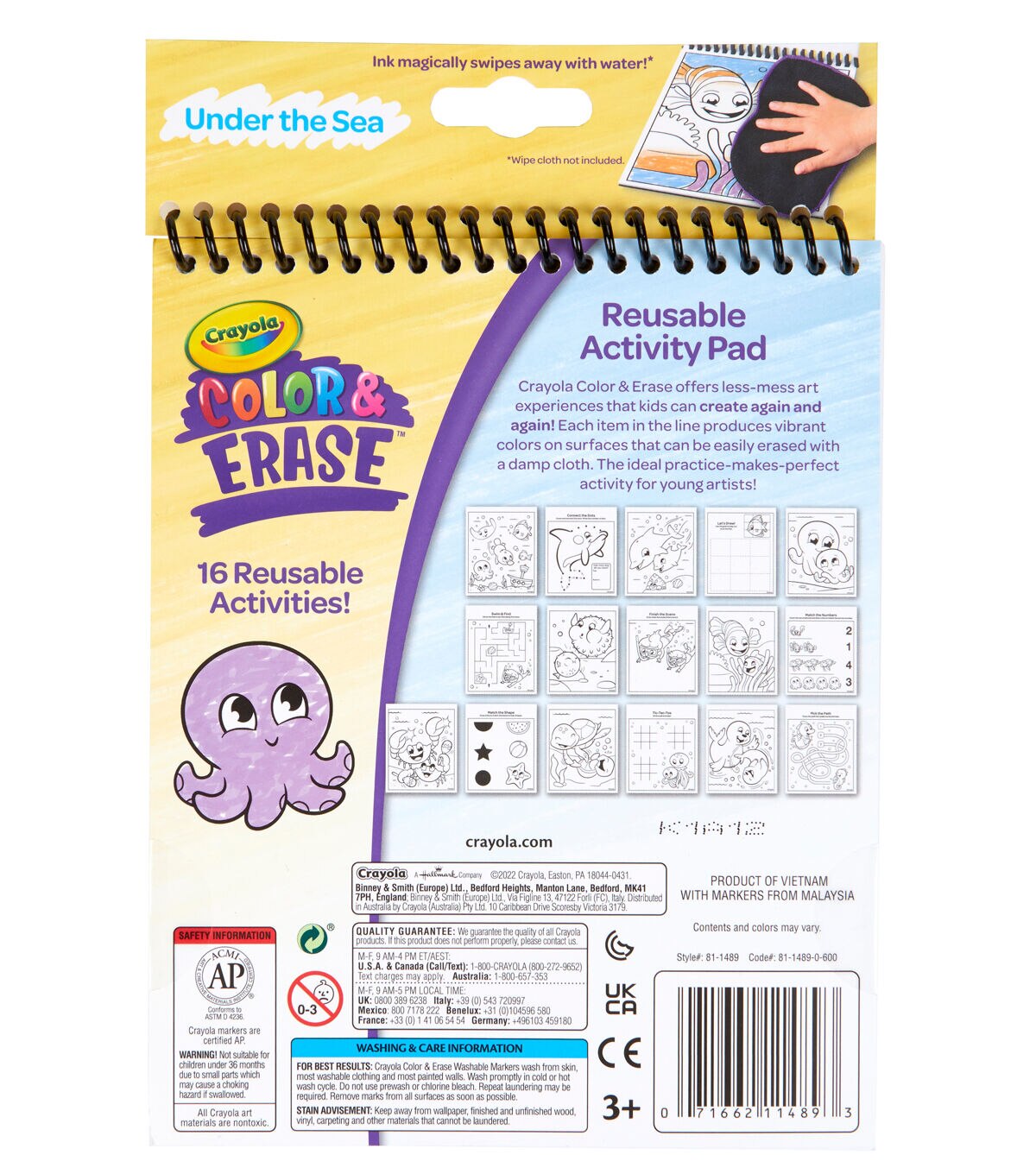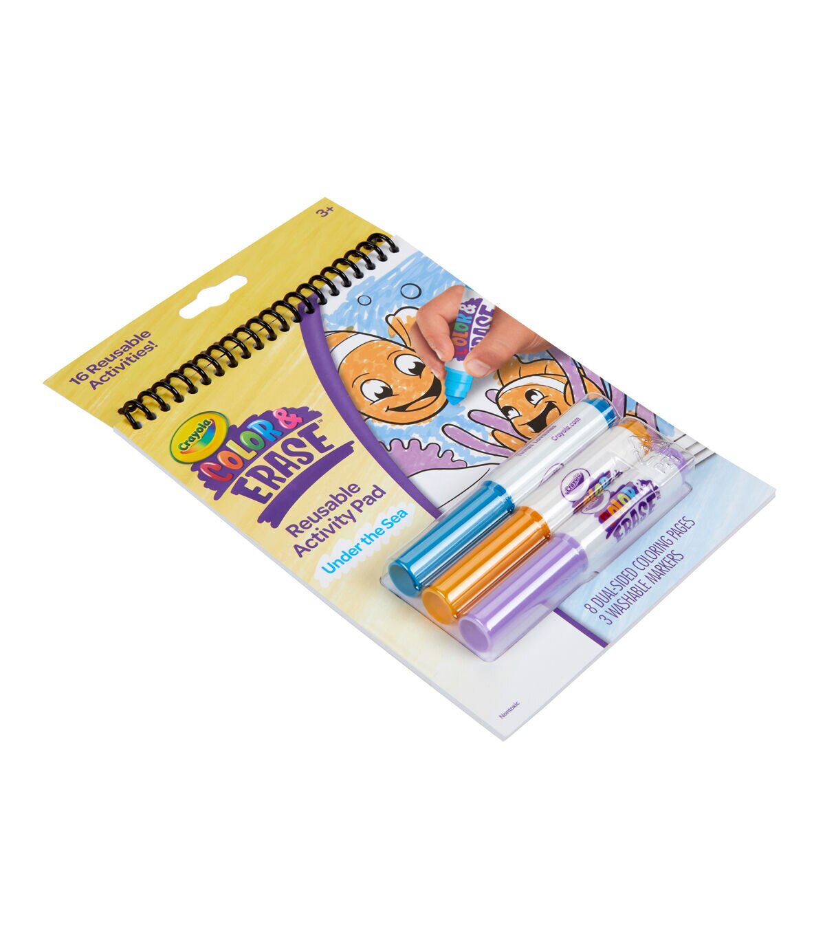 - CRAYOLA COLOR & ERASE REUSABLE ACTIVITY PAD — UNDER THE SEA: Includes 8 Dual-Sided, Reusable, 5” x 7” Activity Pages and 3 Washable Markers.
