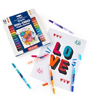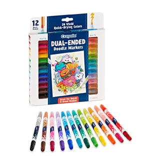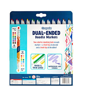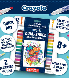 Create with definition, thanks to a tool that offers twice the level of detail and twice the color. Each of the 12 Crayola Dual Ended Markers in this set features two colorful tools in one. Create wispy watercolor like areas of color with the brush marker end and thick or thin lines with the chisel tip end. There are two colors per marker, giving you 24 colors total. These Crayola markers make a great gift for teens with an interest in creative lettering, as well as those who just want to experiment more with their art markers. These markers are ideal for teens and adult coloring enthusiasts, but are safe for ages 8 and up. Additional Doodle Markers and Colored Pencils are available (sold separately), try them all.