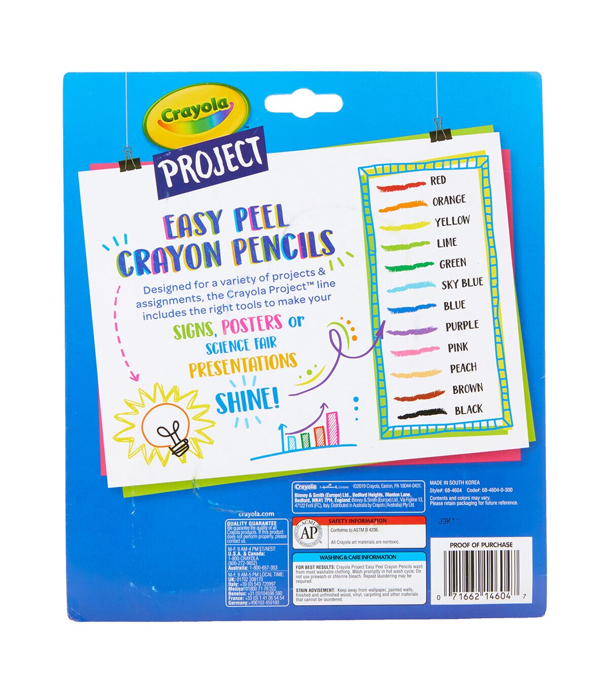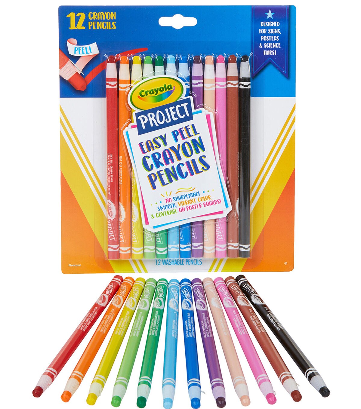 From the Crayola Project line, Easy Peel Crayon Pencils are designed with quick-dry technology and easy peel barrels so that sharpening is never needed! Just peel away layers to expose the color core. Easy Peel Crayon Pencils provide vibrant color coverage and work great on a variety of surfaces. Colors are easily washed from skin and most washable clothing. Includes 12 Washable Crayon Pencils in assorted colors. Ideal for kids, ages 6 and up.