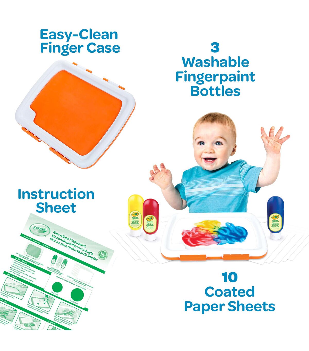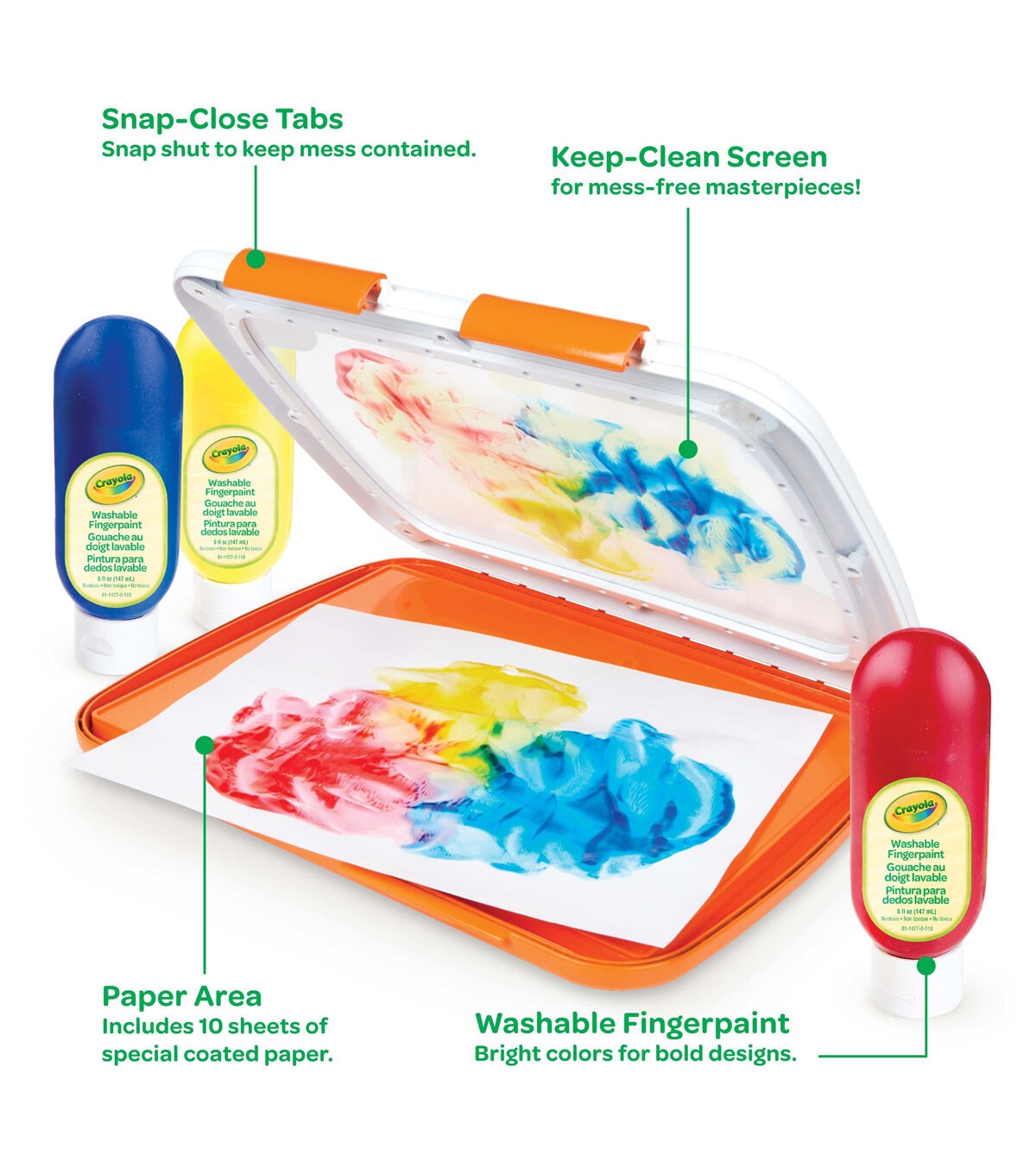 - Features Finger Paint Unit, 3 (5 oz) Squeeze Bottles of Washable Finger Paint, and 10 Sheets Finger Paint Paper.