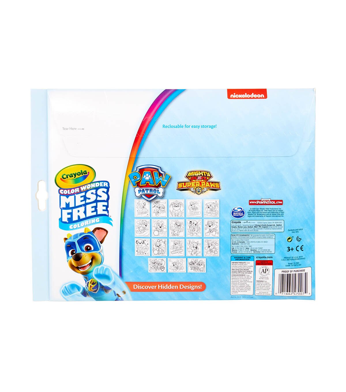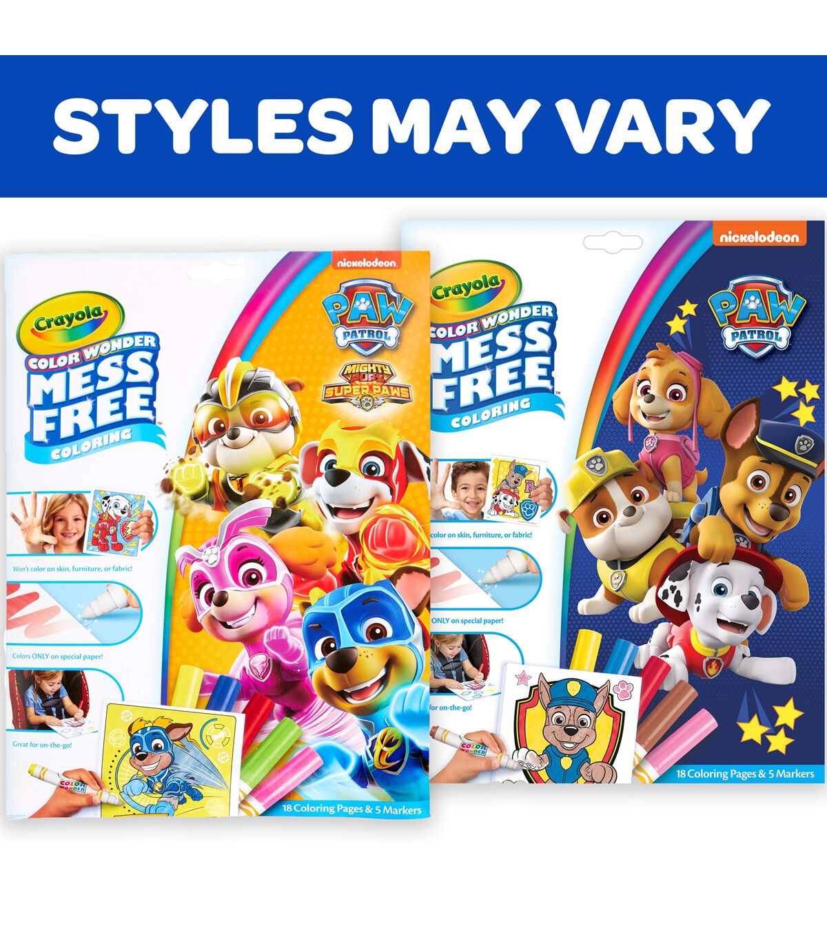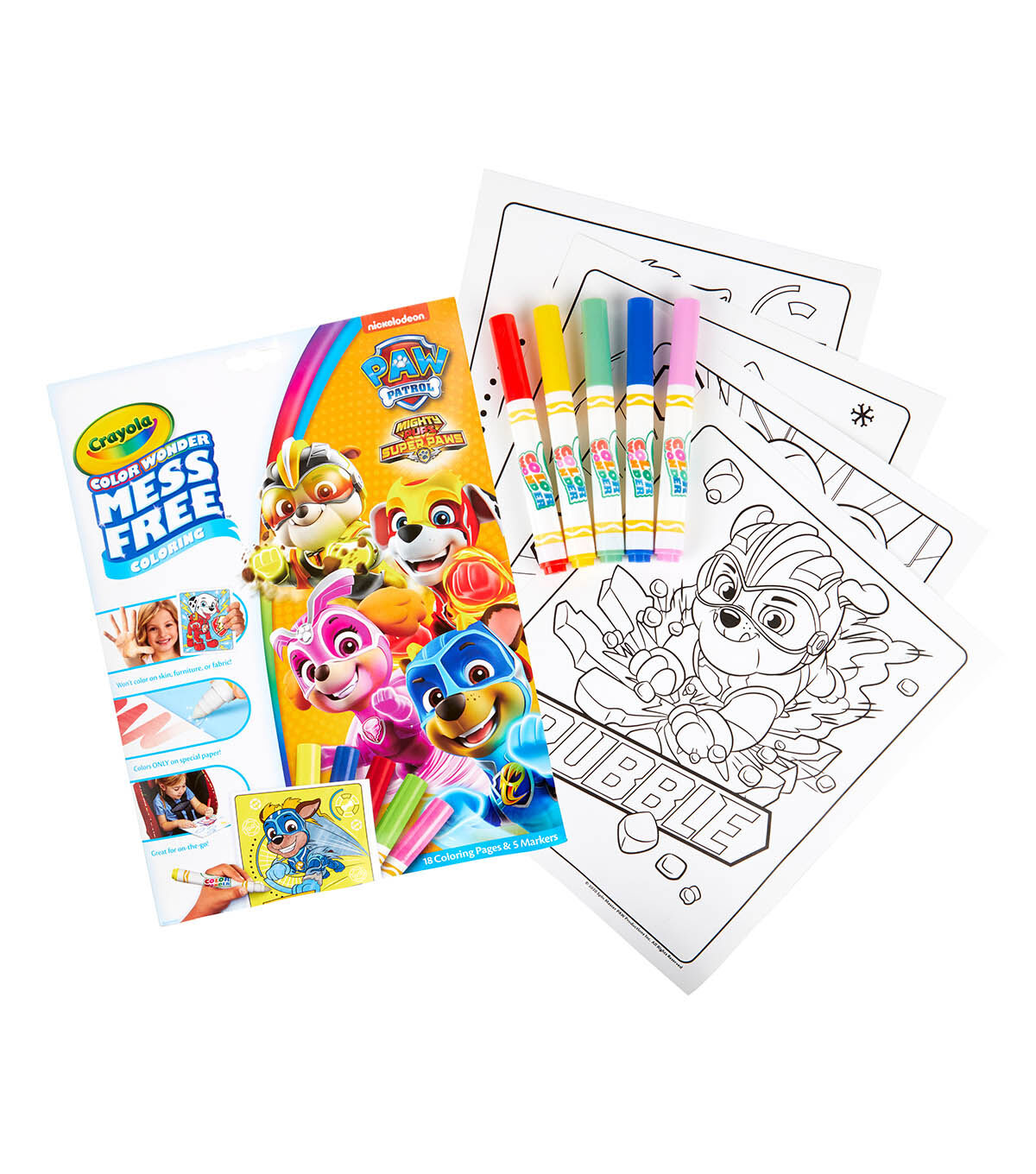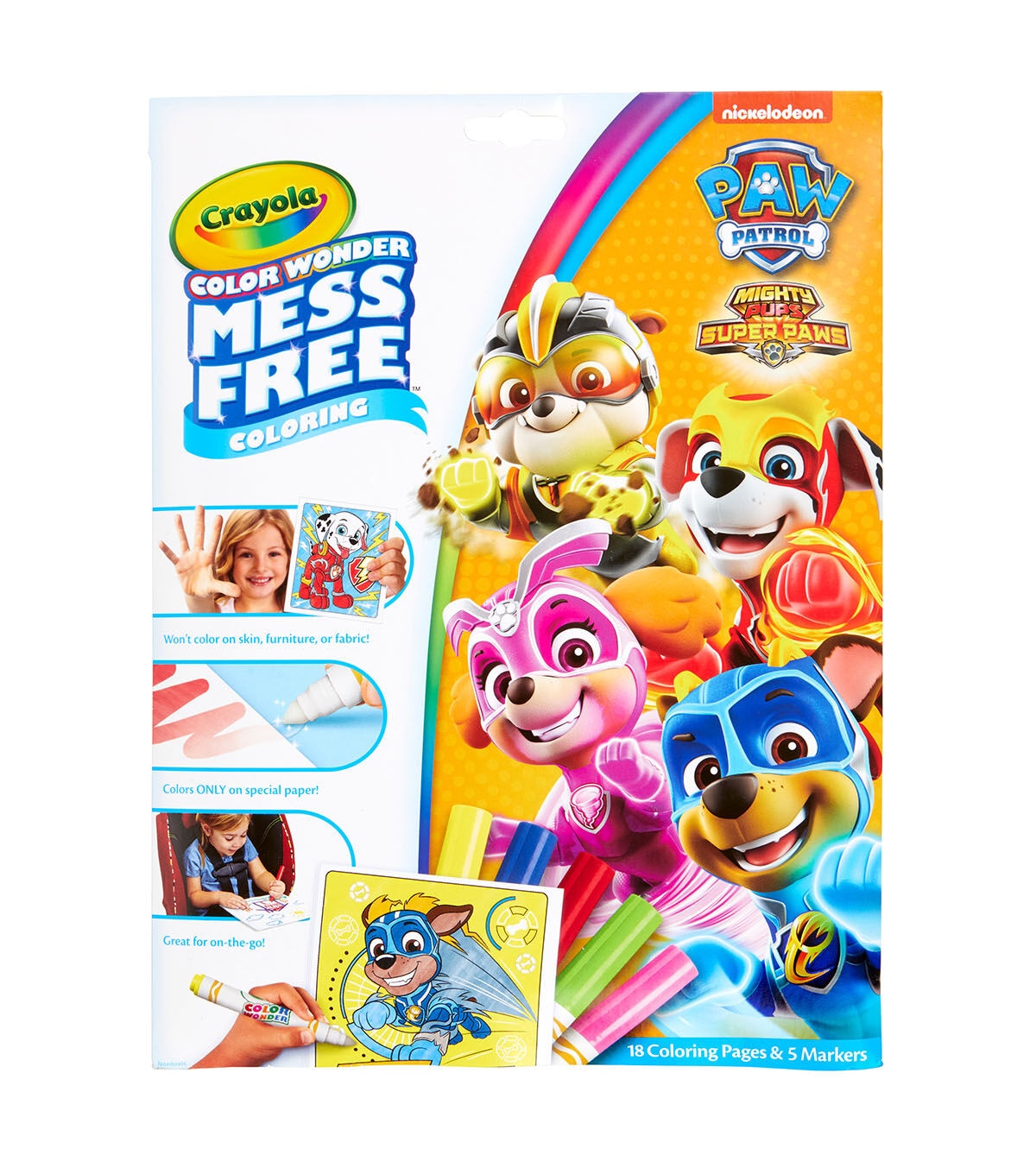 - The magic of color without the mess; 18 mess-free coloring pages of fun Paw Patrol art; Color Wonder marker ink appears only on Color Wonder paper; not on skin, furniture or fabric; The ideal art activity for on-the-go coloring or anywhere mess can be a concern; Includes 18 Paw Patrol coloring pages and 5 broad line Color Wonder markers