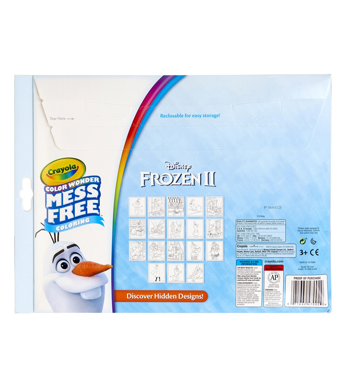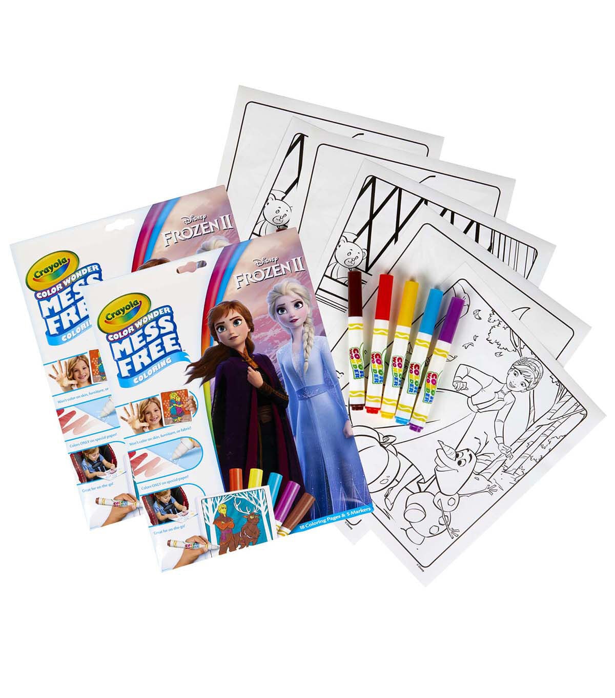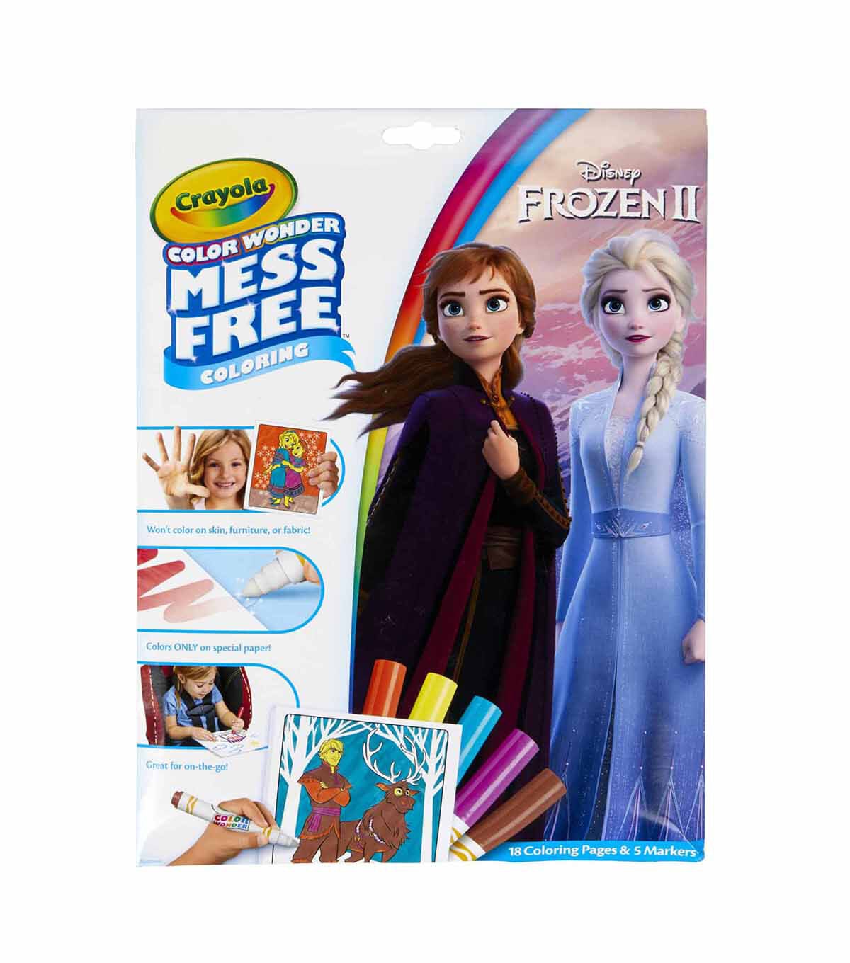 Bring home the joy of Disney's Frozen 2 with a mess free coloring experience! Color Wonder Markers only show up on specially formulated Color Wonder Paper, so no stains on skin, clothing, or furniture. The envelope-style packaging doubles as a unique storage solution, allowing these coloring activities for kids to be taken on the go or used at home. Makes a great gift for girls and boys. Ages 3 and up. Each Color Wonder Coloring Set contains 5 Mess-Free Markers and 18 Coloring Pages with their favorite characters from Frozen 2. Sold as a pack of 2 complete sets.