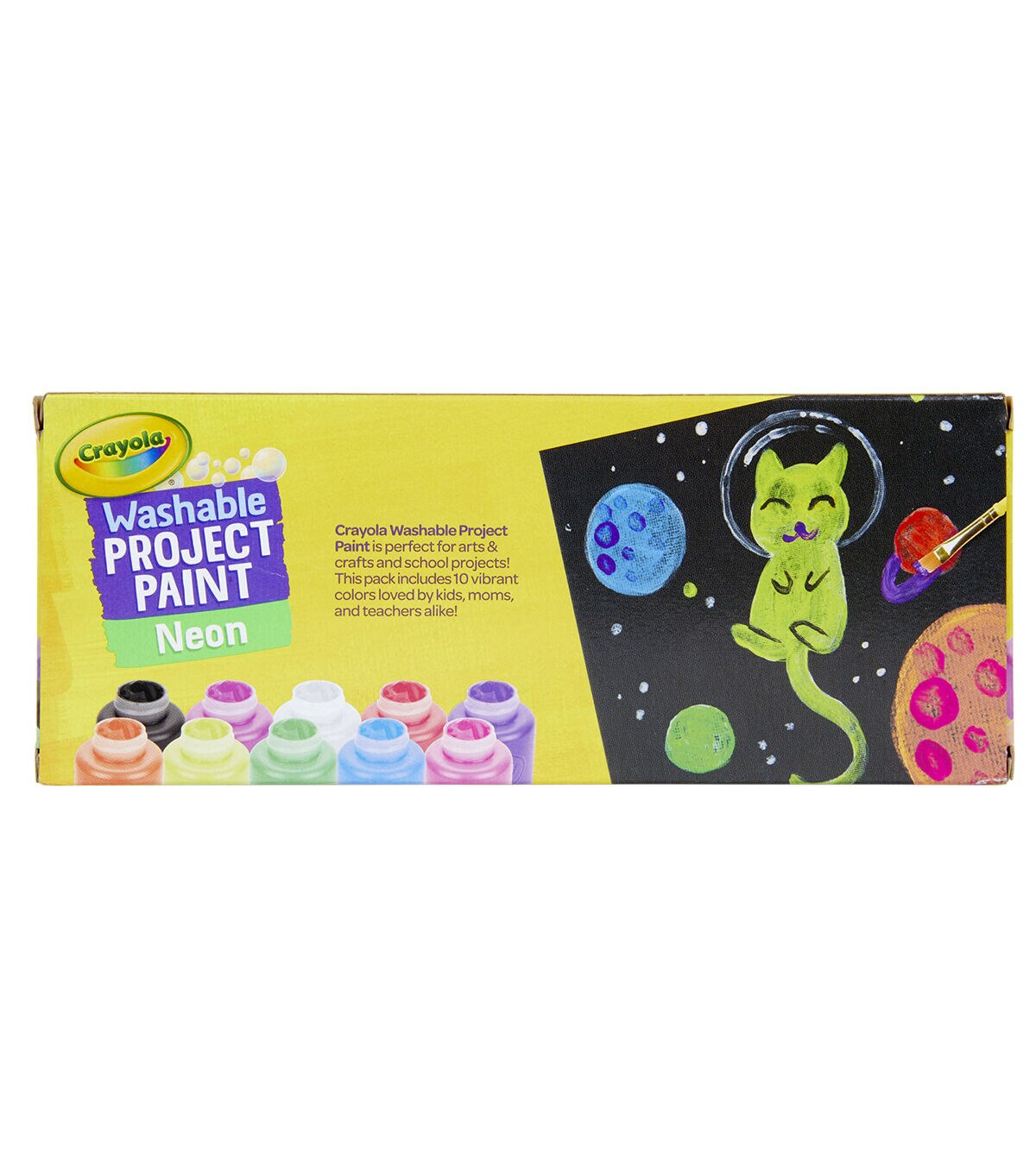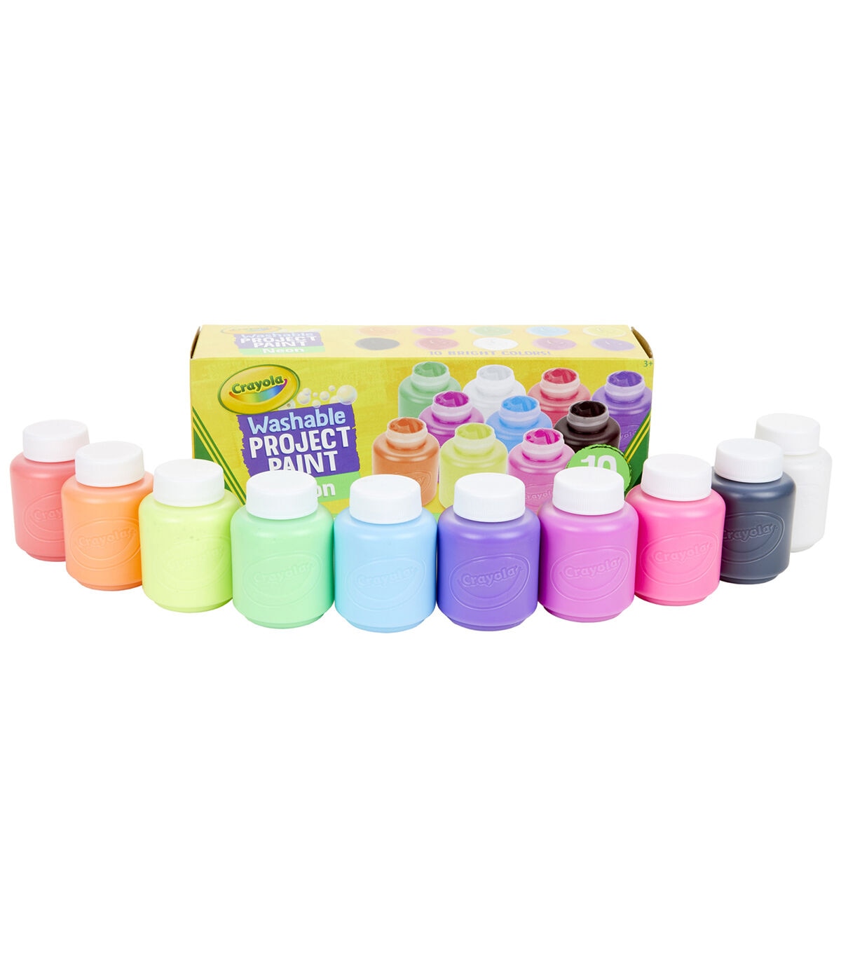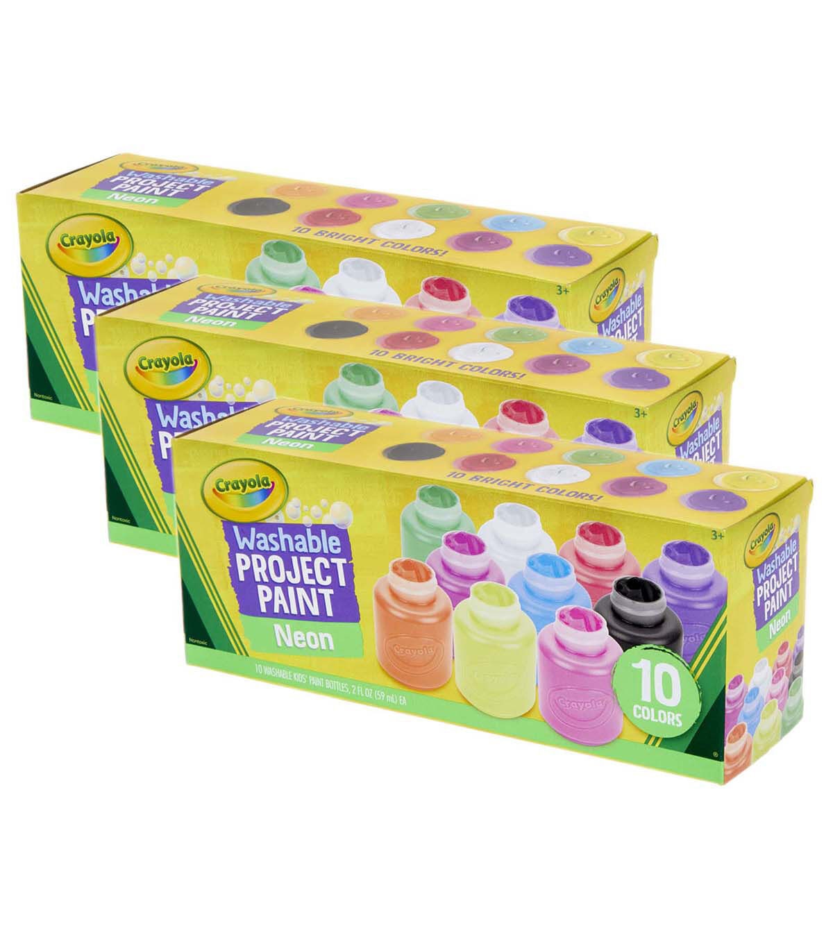 Add a bolt of neon color to creative masterpieces. Crayola Washable Neon Paints are nontoxic and great for arts and crafts, plus school projects. Decorate book covers, signs, or posters, and use various brushes, stamps, or sponges to create fun patterns and designs. Each pack includes 10 (2 oz.) Paint Bottles in Radical Red, Blue Attitude, Unmellow Yellow, Purple Pizzazz, Shocking Pink, Atomic Tangerine, Mad Magenta, Screamin' Green, Black Night, and Winter White. Sold as 3 packs for a total of 30 bottles.