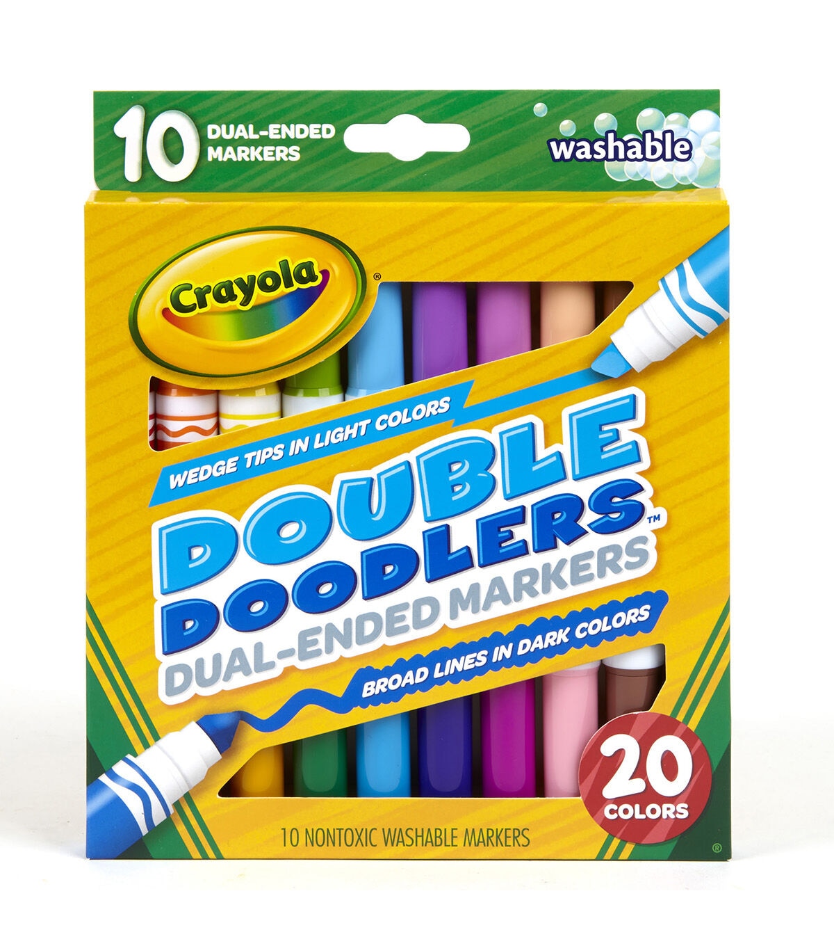 Total of 20 colors, with tips that provide just the right amount of color for large or small spaces! Strong and durable marker tips wear well for coloring and projects. Trusted washability, easily washing from skin and clothing. Each pack includes 10 Dual-ended markers. Sold as 3 packs for a total of 30 markers.