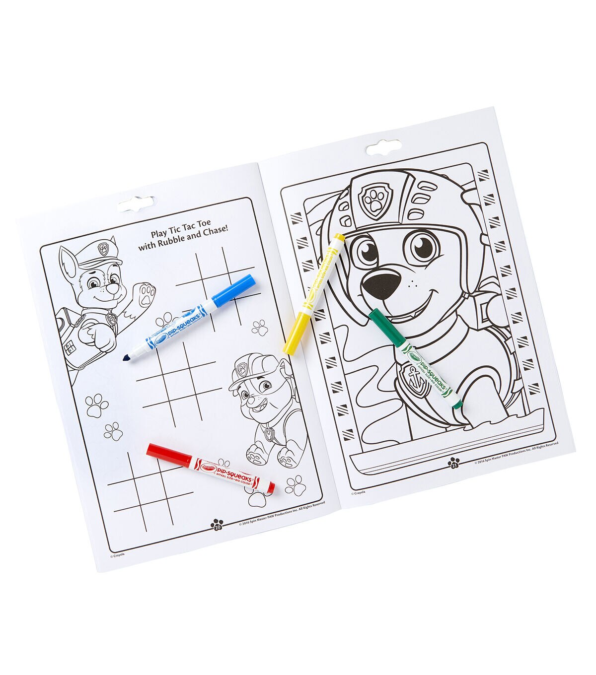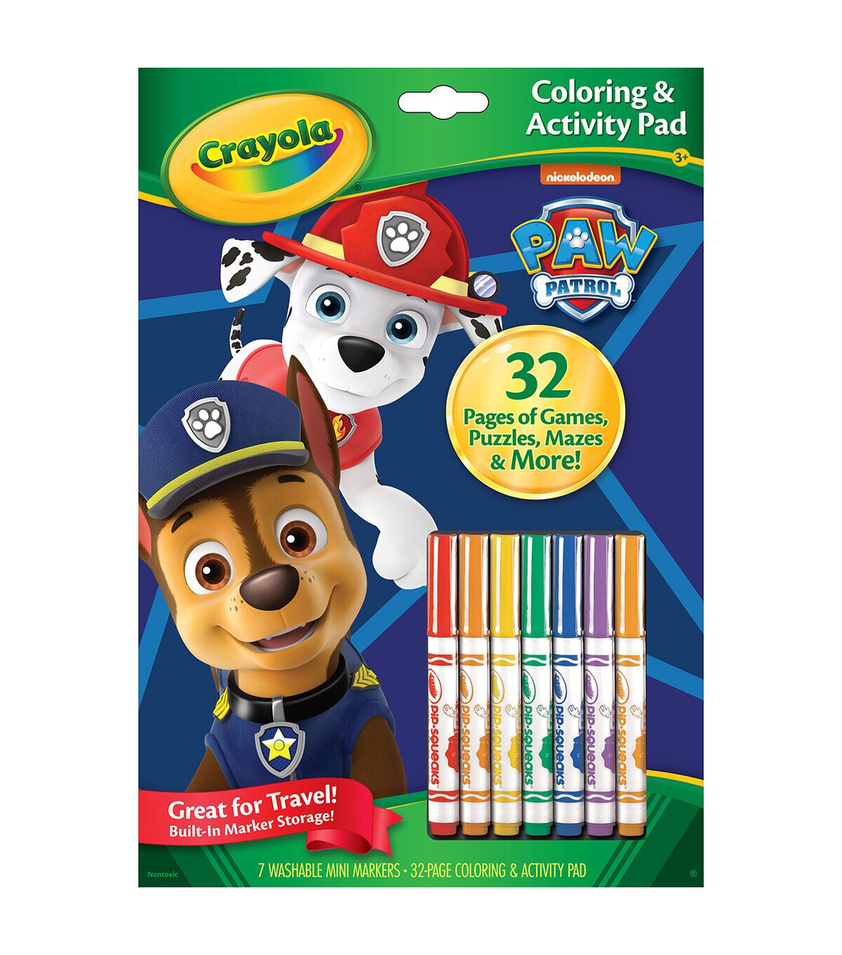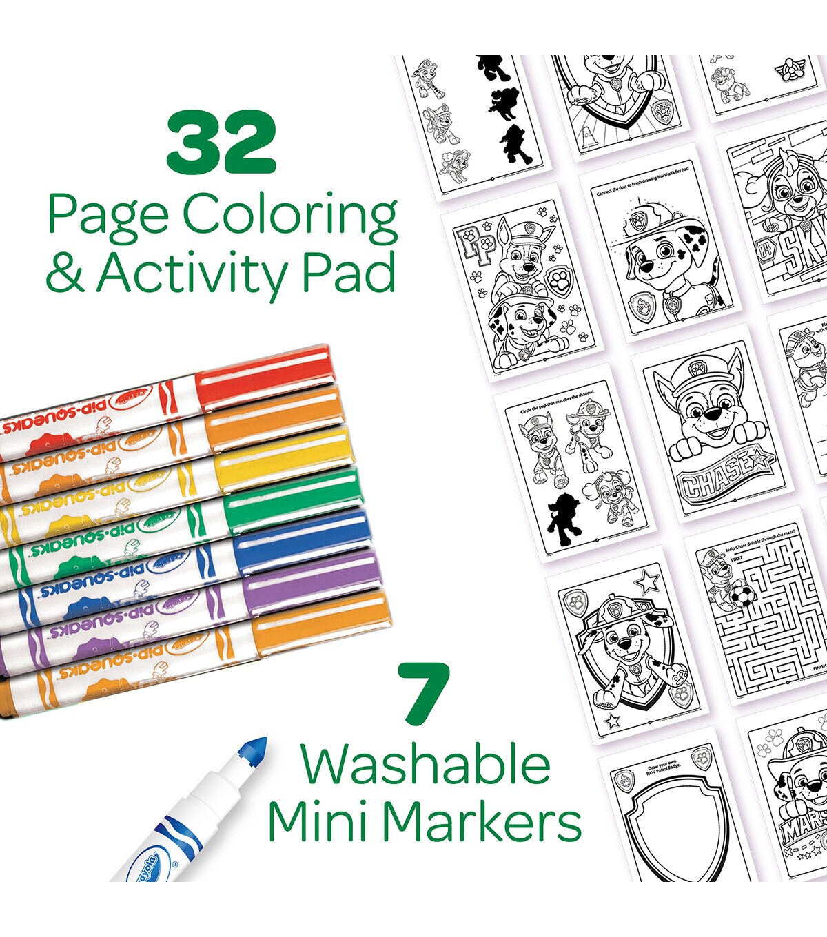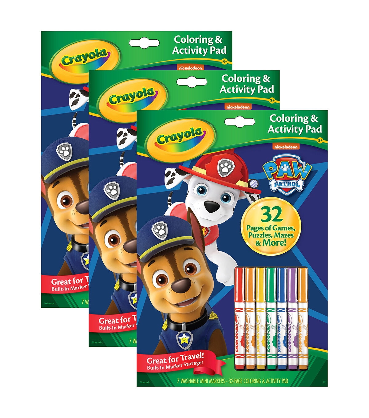 Kids color and learn with their favorite Paw Patrol characters! Each pad includes 32 pages of coloring and fun activities such as mazes, hidden pictures, matching games and more! Each pad also includes 7 Pip-squeak Washable Markers and reusable marker storage tray. Sold as a pack of 3 identical activity pads, each with 7 markers.