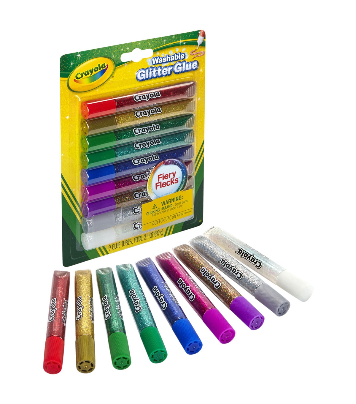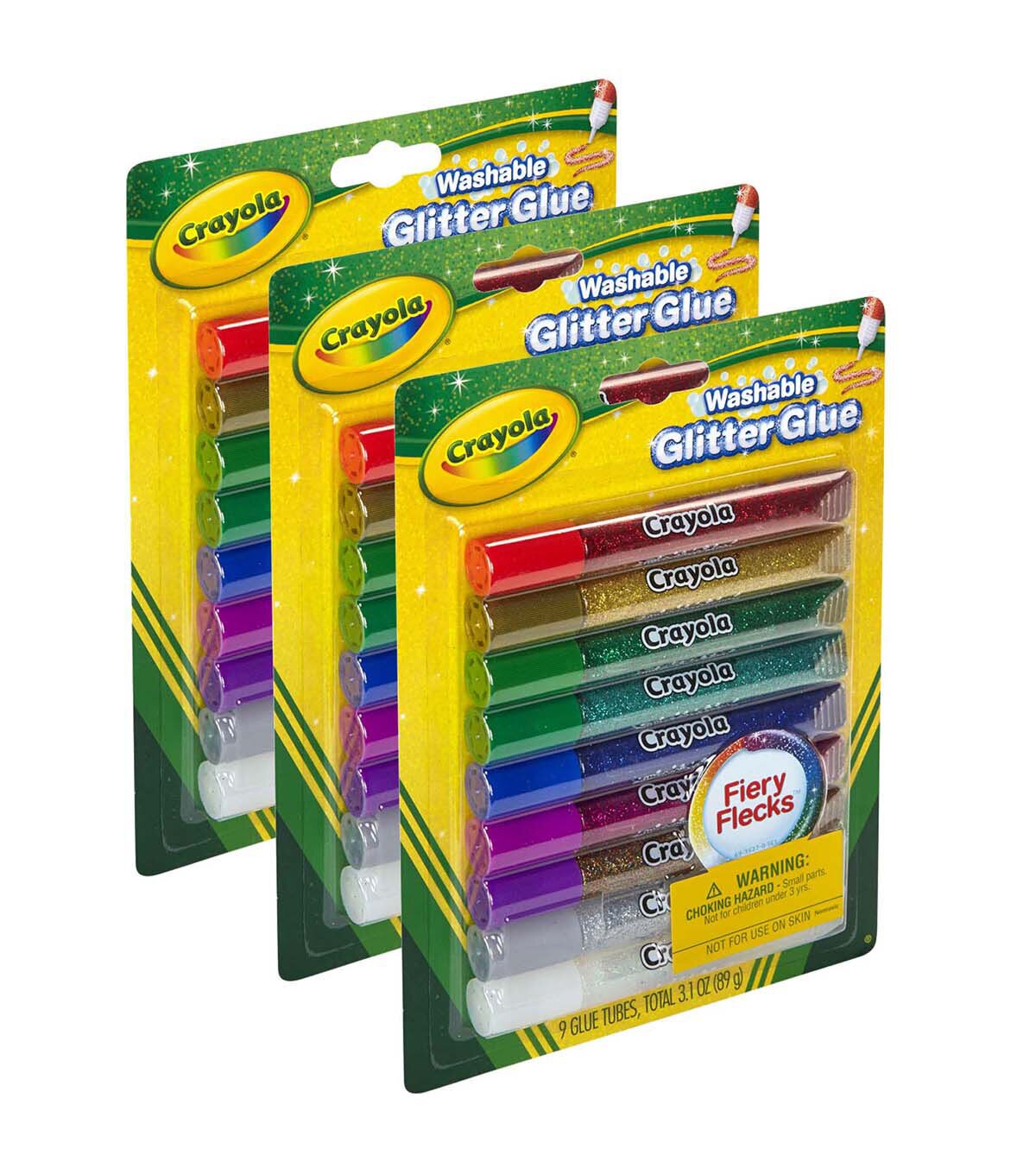 Dazzling, decorative glue in a variety of sparkling colors! Perfect for crafts, scrapbooking, school projects and much more. Add sparkle to any project, at home or in the classroom. Crayola Glitter Glue squeezes out easily and dries in 30 minutes, so kids can make their artwork shimmer anytime. Each pack includes 9 washable assorted colors. Sold as 3 packs for a total of 27 tubes of glitter glue.