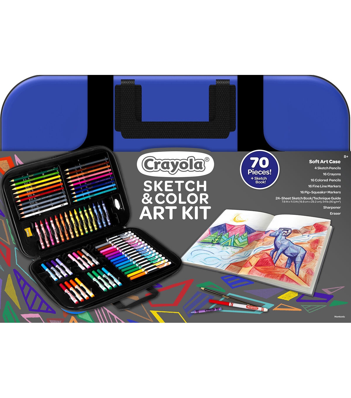 - Features over 85 Pieces in Soft Case, including 16 Crayons, 16 Colored Pencils, 4 Sketch Pencils, 16 Fine Line Markers, 16 Pip Squeaks Skinnies Markers, 1 Sharpener, 1 Easer, 12 Page Sketchbook, and How to Guide.