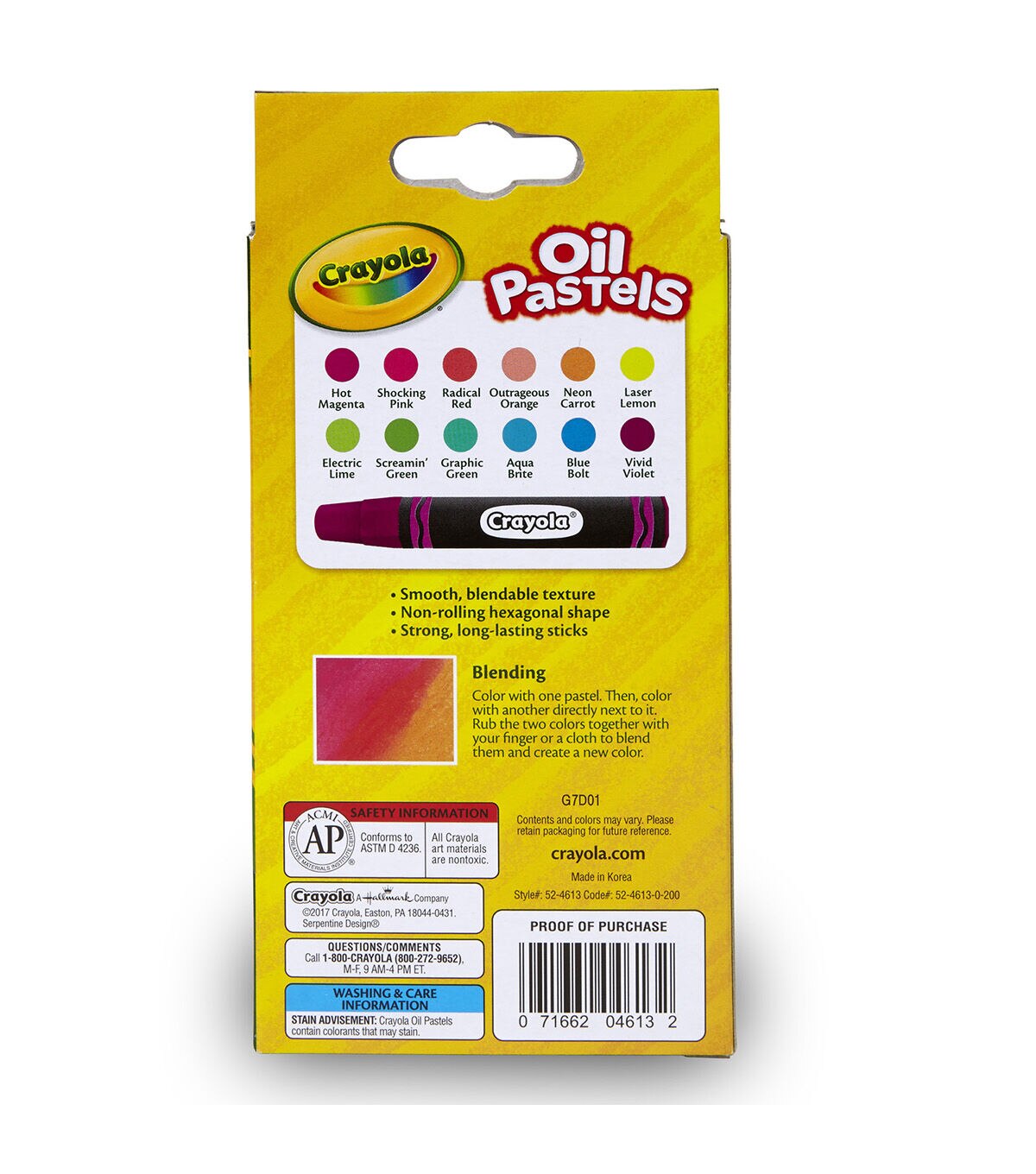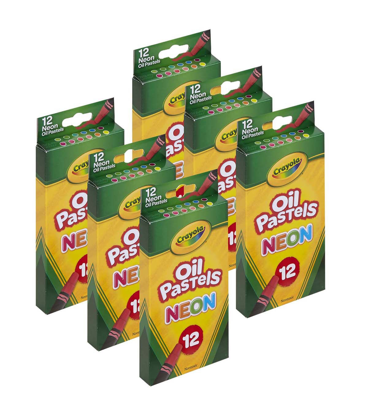 Lay down bright neon colors that are easy to mix with Crayola Neon Oil Pastels. These jumbo-sized sticks are designed for kids with a hexagon shape that prevents them from rolling off desks. The tapered points are ideal for detailed drawing. Each pack includes 12 sticks in hot magenta, shocking pink, radical red, outrageous orange, neon carrot, laser lemon, electric lime, screamin' green, graphic green, aqua brite, blue bolt, vivid violet. For 4 years and up. Sold as 6 packs for a total of 72 oil pastels.