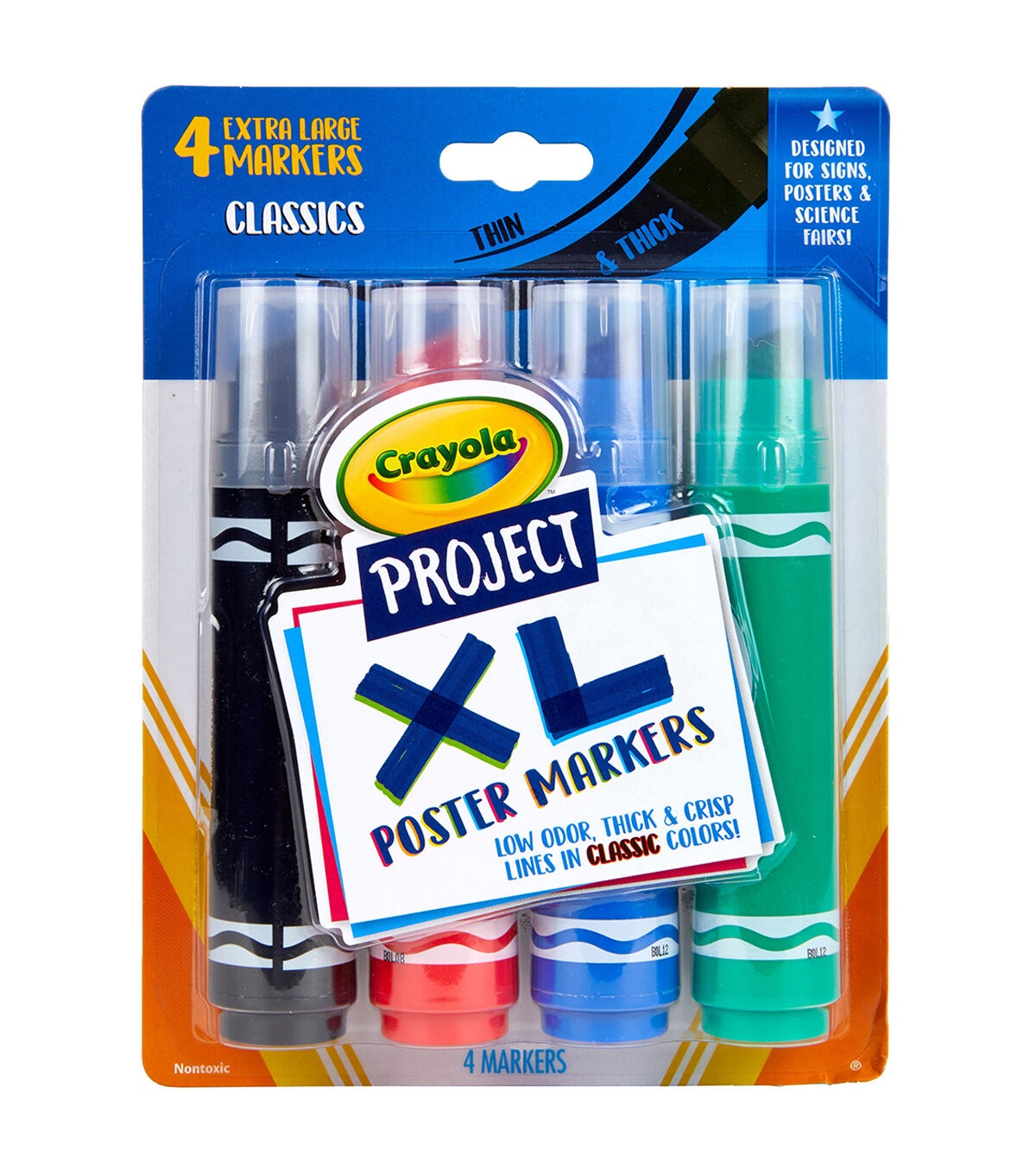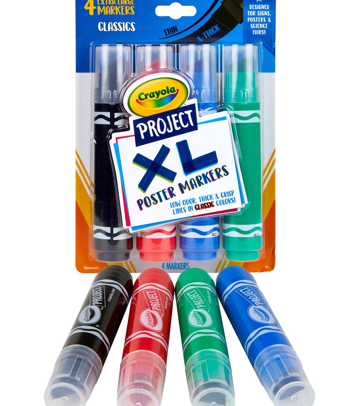 From the Crayola Project line, these supersized markers are perfect for a variety of full-coverage art projects and crafts. Create super thick lines with these bold, extra-wide chisel tips. School projects, presentations, posters, signs and decorations stand out with crisp, wide lines in classic colors. Set includes 4 XL Poster Markers in classic colors: Black, Green, Blue, and Red. Ideal for adults and kids, ages 6 and up.