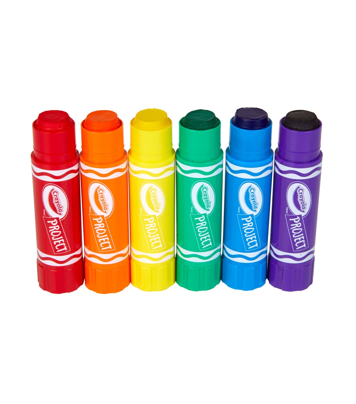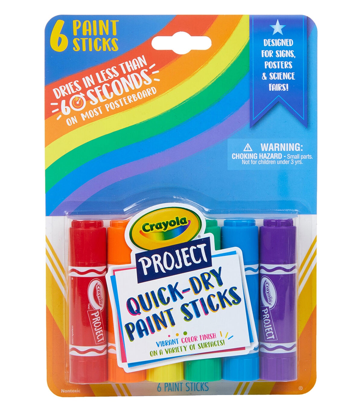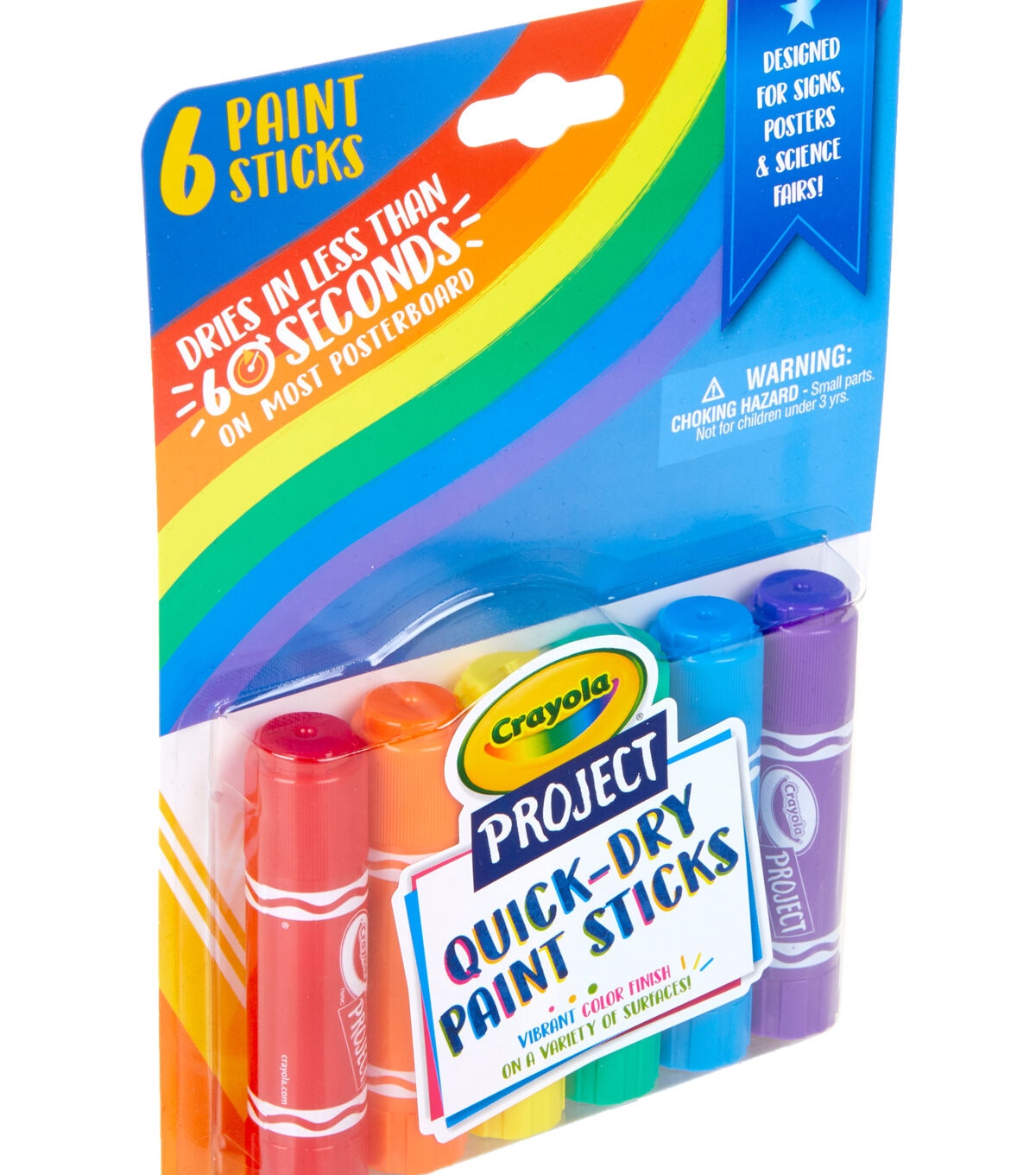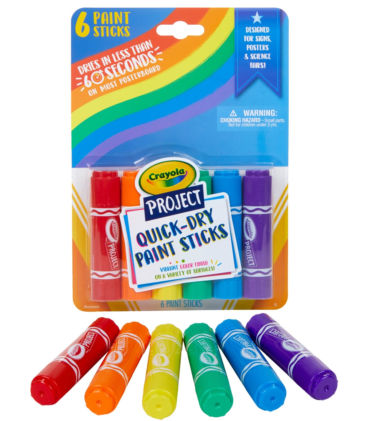 From the Crayola Project line, Quick Dry Paint Sticks are a less mess alternative that goes on smooth, and dries in no time! They require no added water. Quick Dry Paint Sticks offer full coverage and are designed to work on a variety of surfaces with no water, setup, or clean up. This less mess paint set includes 6 Quick Dry Paint Sticks in assorted colors, and makes a great gift for kids, ages 6 and up.