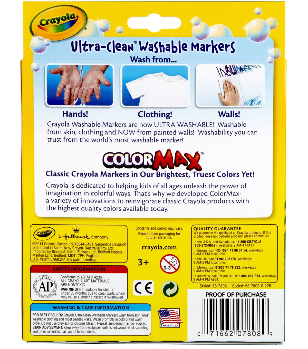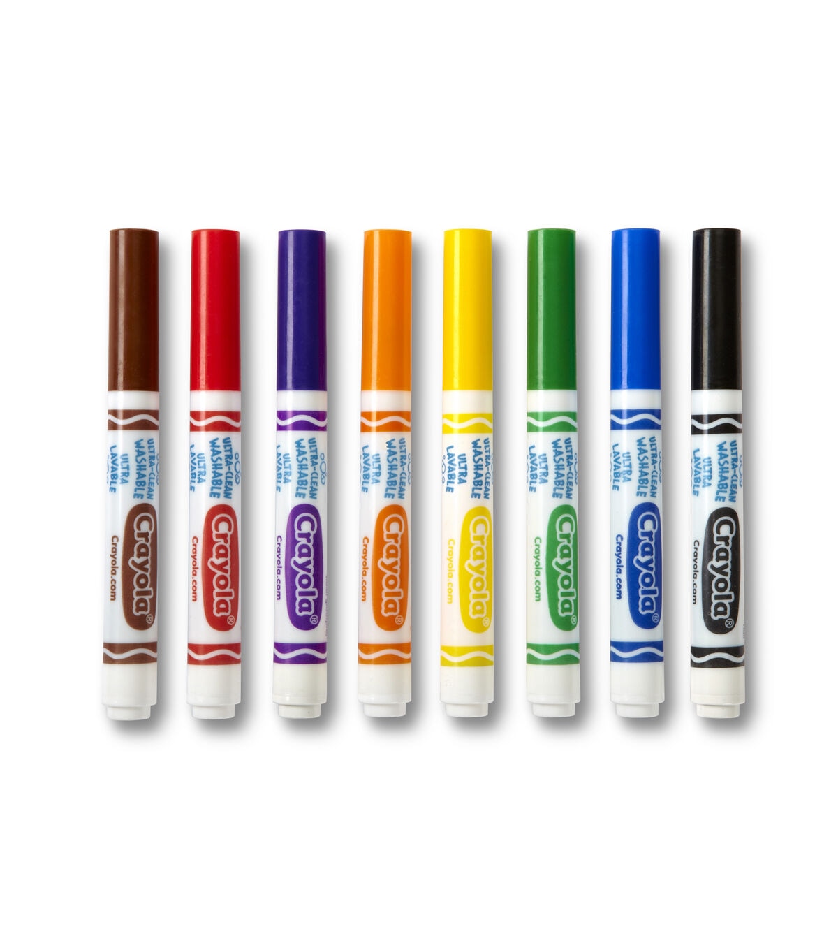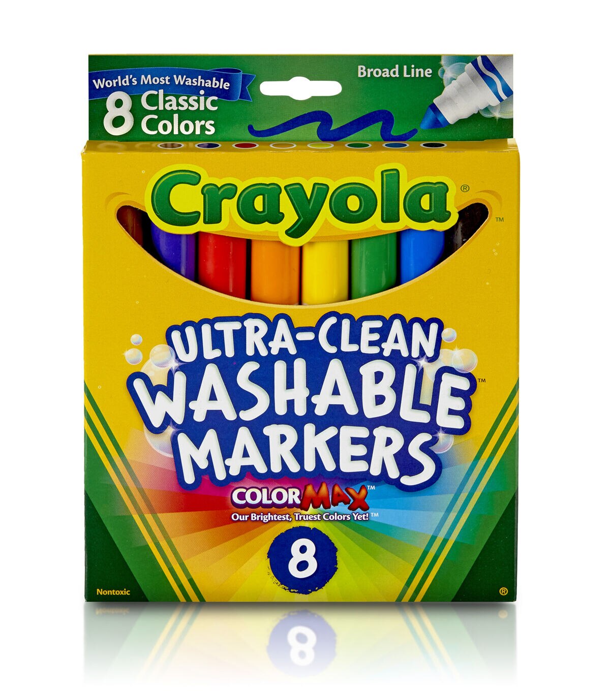 Washable markers are specially formulated to have the bright, vivid colors and overall great quality you expect from Crayola products. They easily wash from skin and most children's clothing.