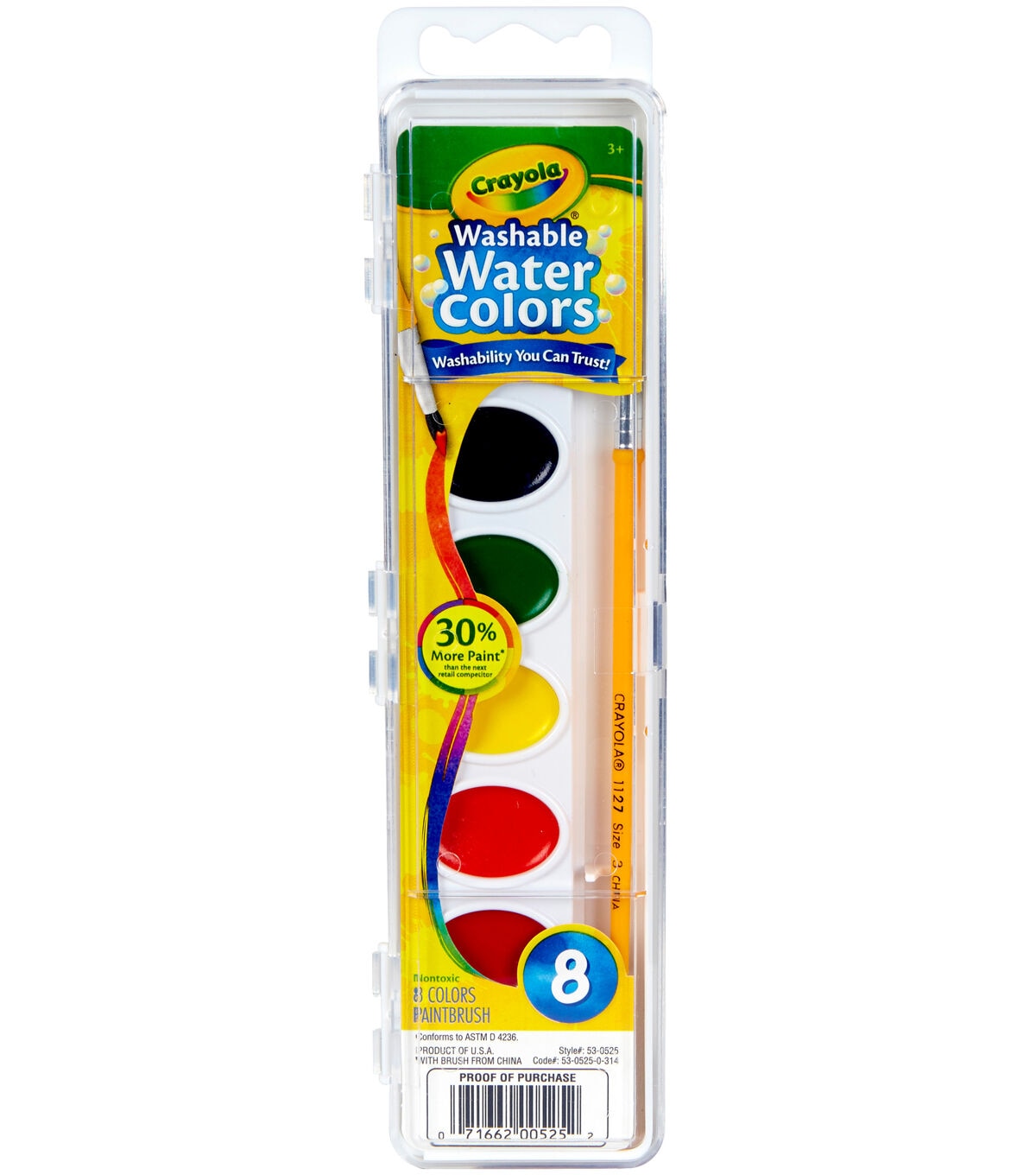 CRAYOLA-Eight washable watercolors on a white tray. Includes 1 natural-hair paint brush. Non-toxic. Conforms to ASTM D4236.