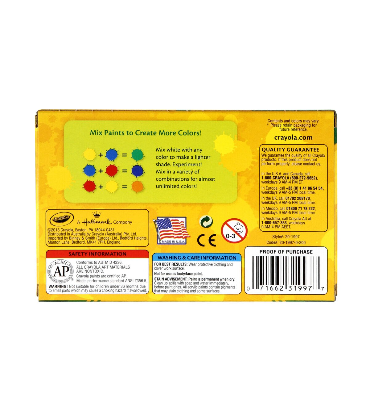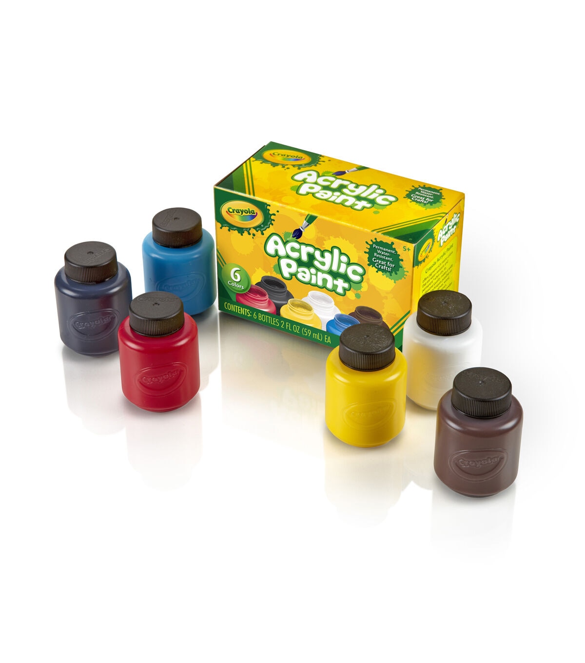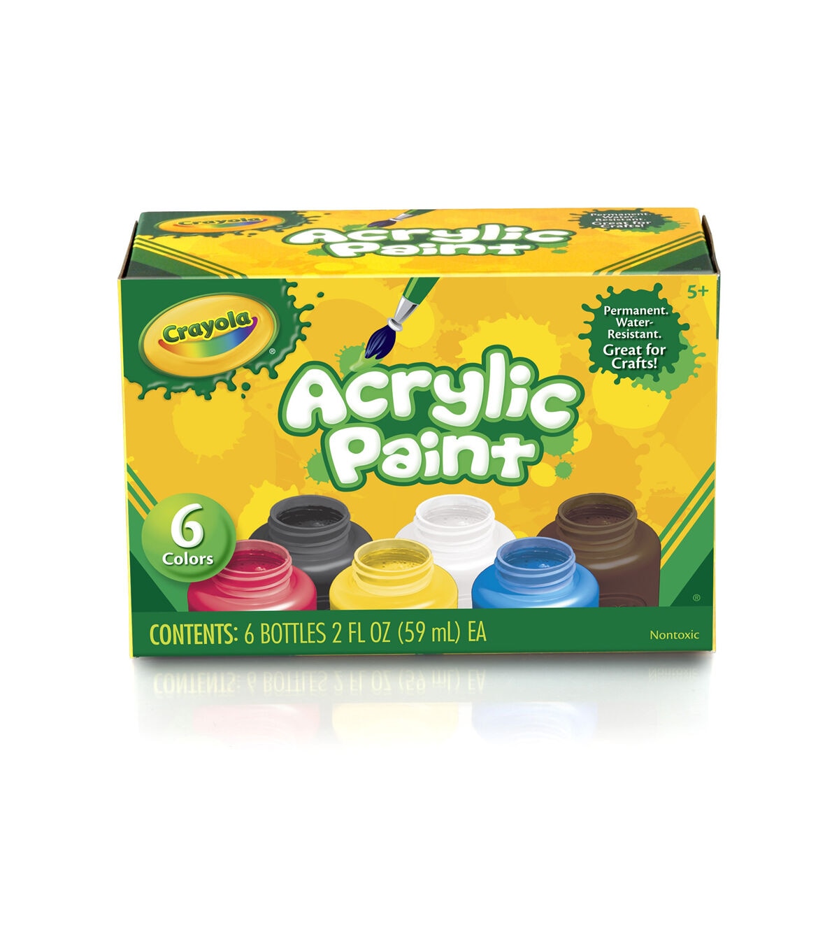 Paint fabulous patterns for your next crafting project with the crayola Acrylic Paint Set 2 oz. Pack of 6. The superior quality paints allows you to experiment with different techniques on metal, fabrics, canvas, wood or ceramics. These pigment-rich colors feature a matte finish and are permanent when they dry. This pack contains six 2-ounce bottles of water-resistant and non-toxic acrylic paints in various attractive colors. Recommended for ages 5 and above. Conforms to ASTM D4236.