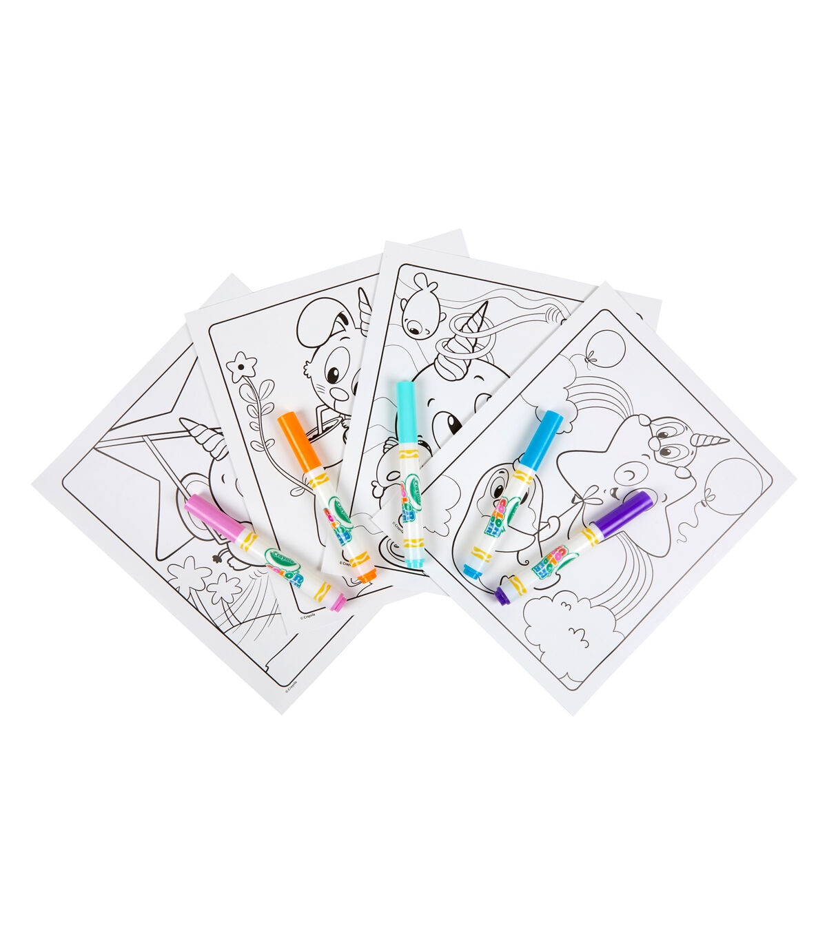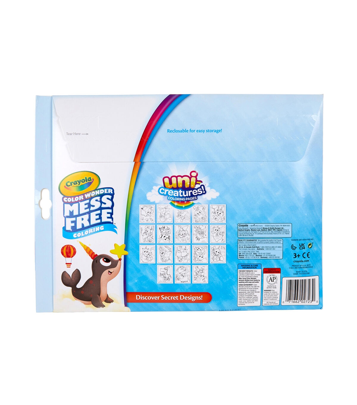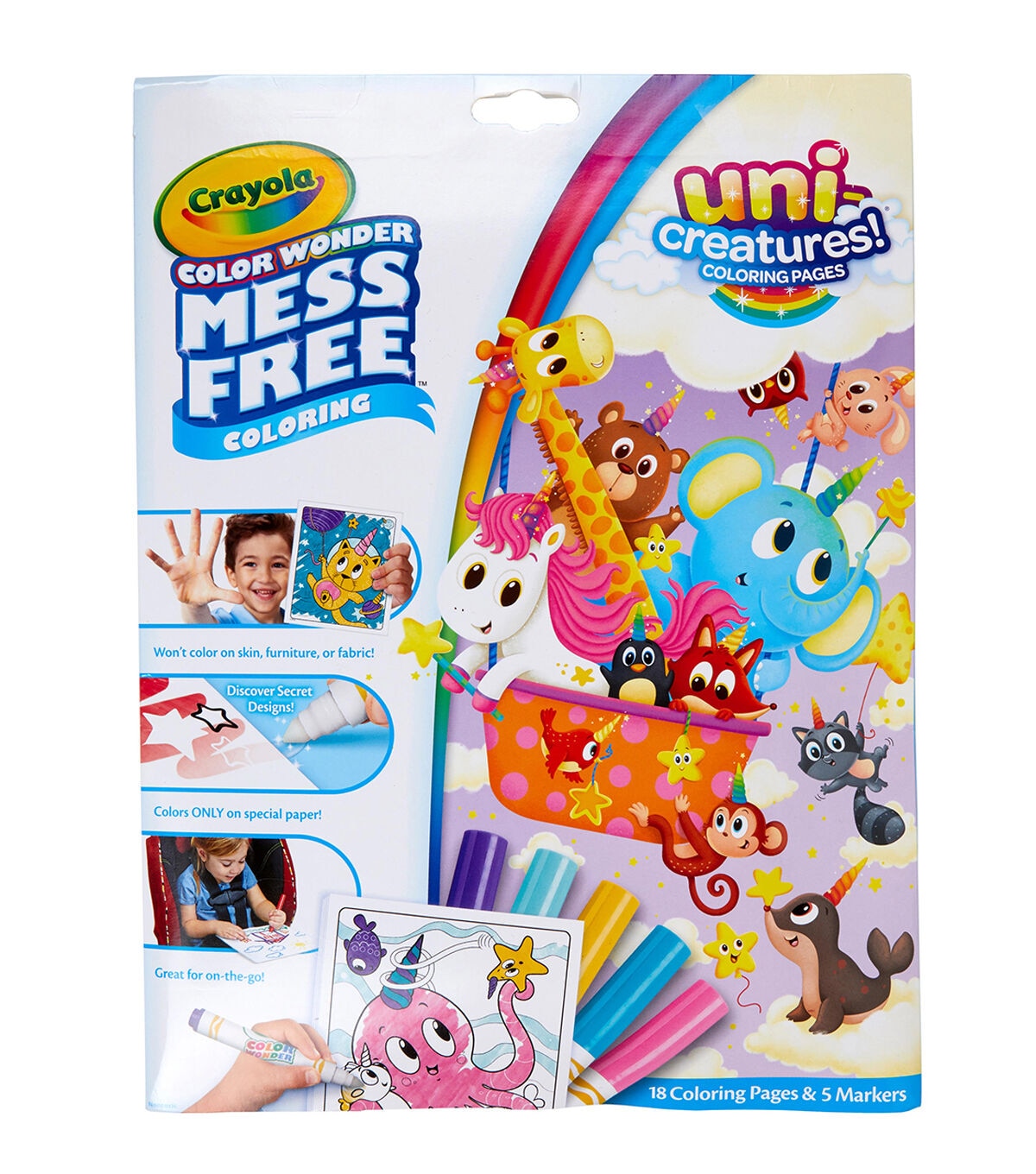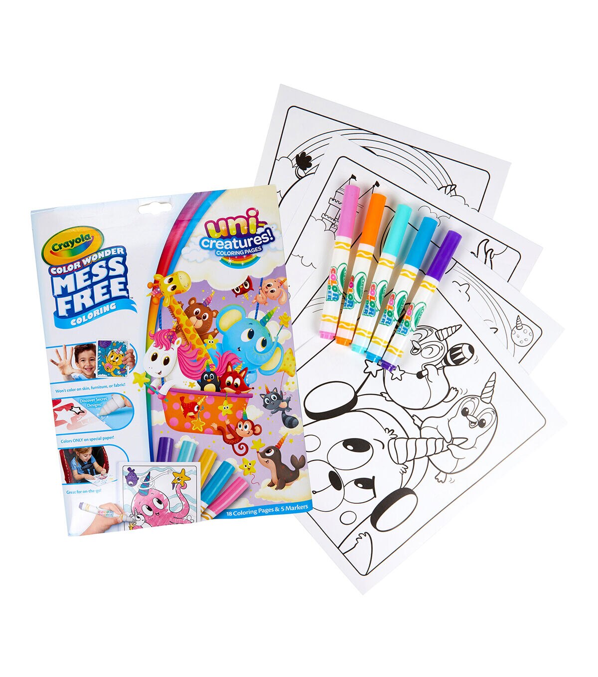Kids can color their favorite characters from Crayola Uni-Creatures coloring books in a mess-free way with Crayola Color Wonder! Color Wonder colors appear only on special Color Wonder paper, not on skin, clothing, or carpets. This set contain 18 fun-filled coloring pages depicting scenes that make unicorns out of everything imaginable! Each page works with all Color Wonder markers, paints and stamps. The convenient “foldalope” packaging works as reusable storage for your coloring pages and markers. Includes 18 Uni-Creatures pages and 5 Color Wonder Markers. Makes a great gift for girls and boys ages 3 and up!