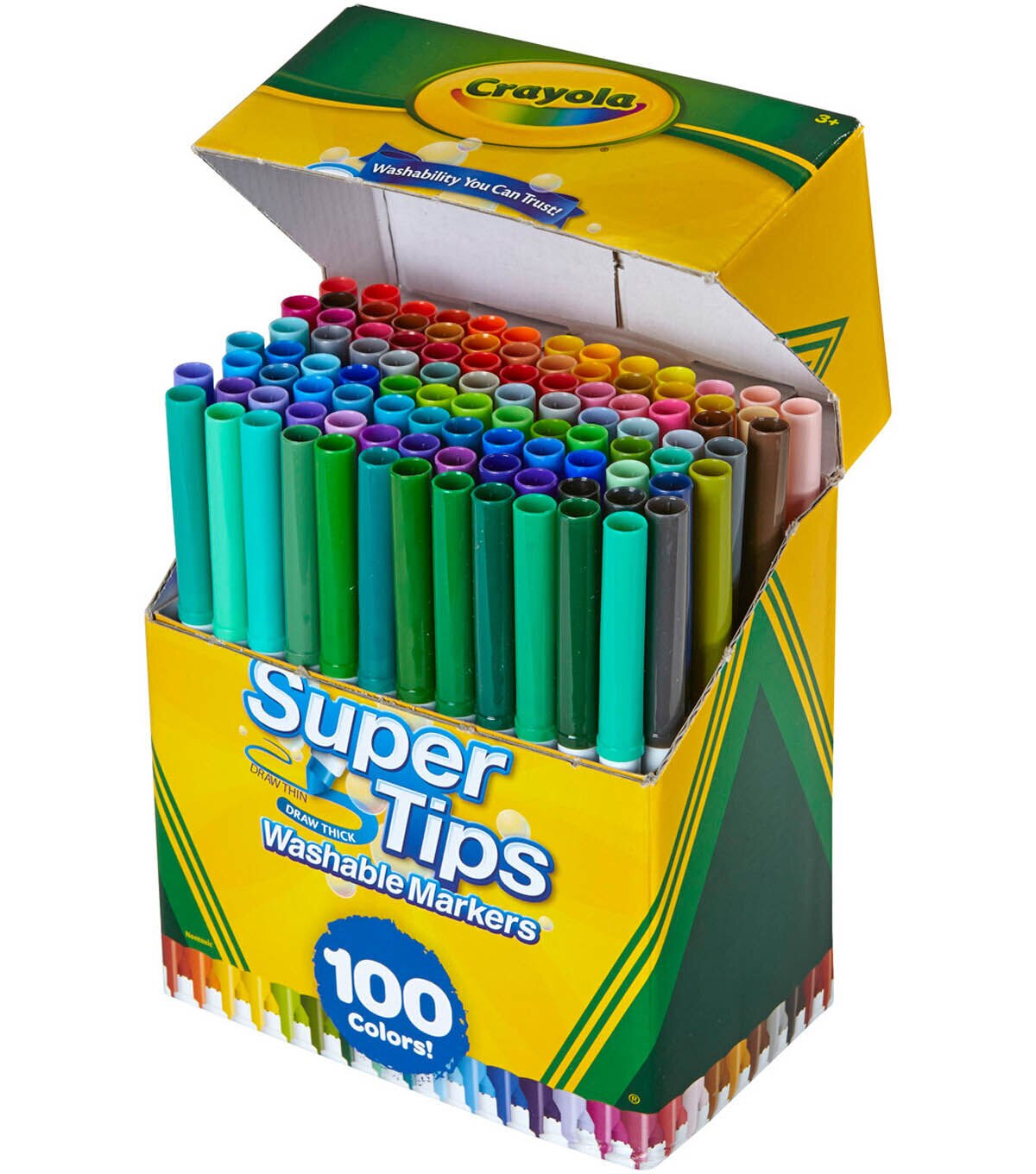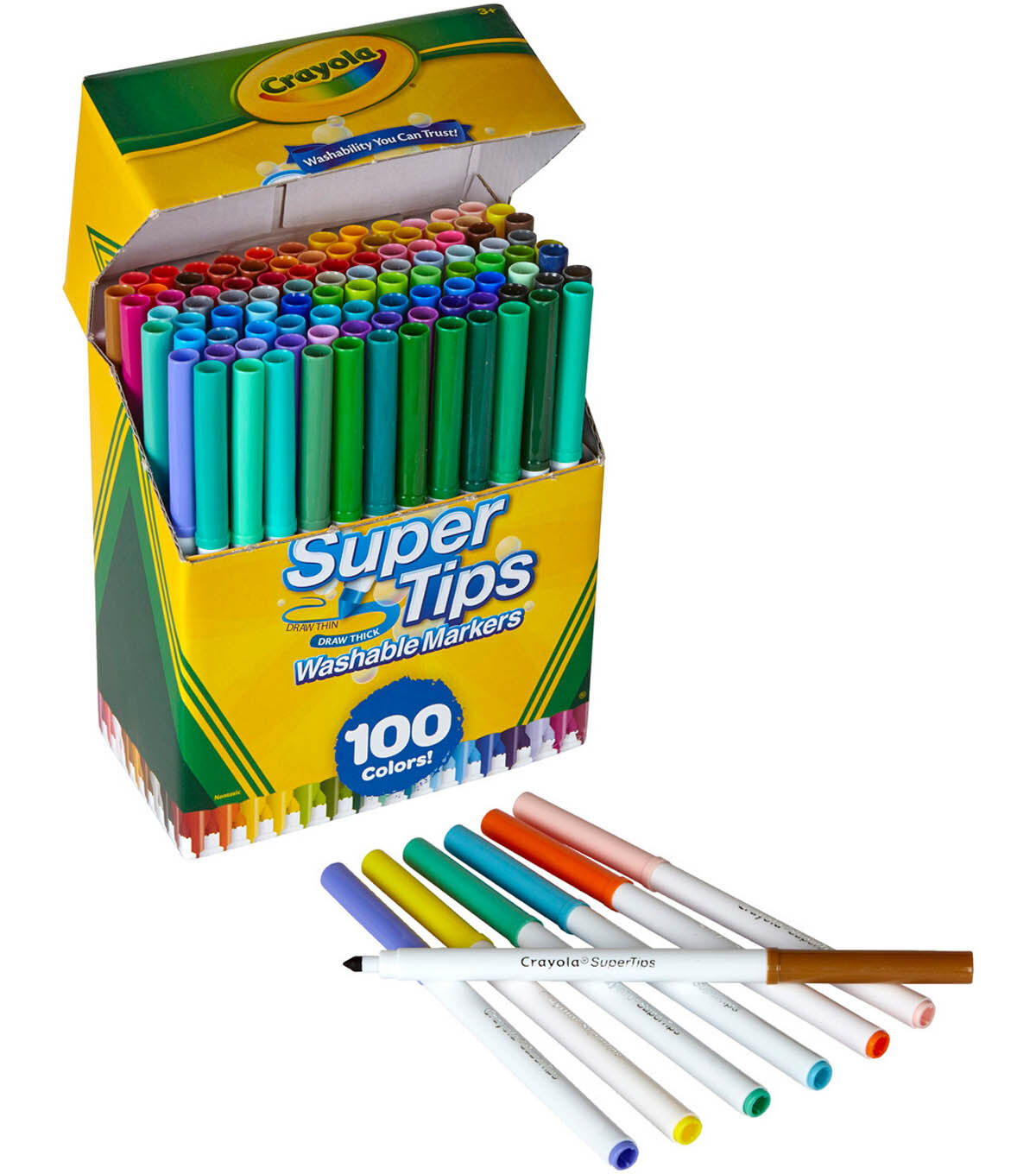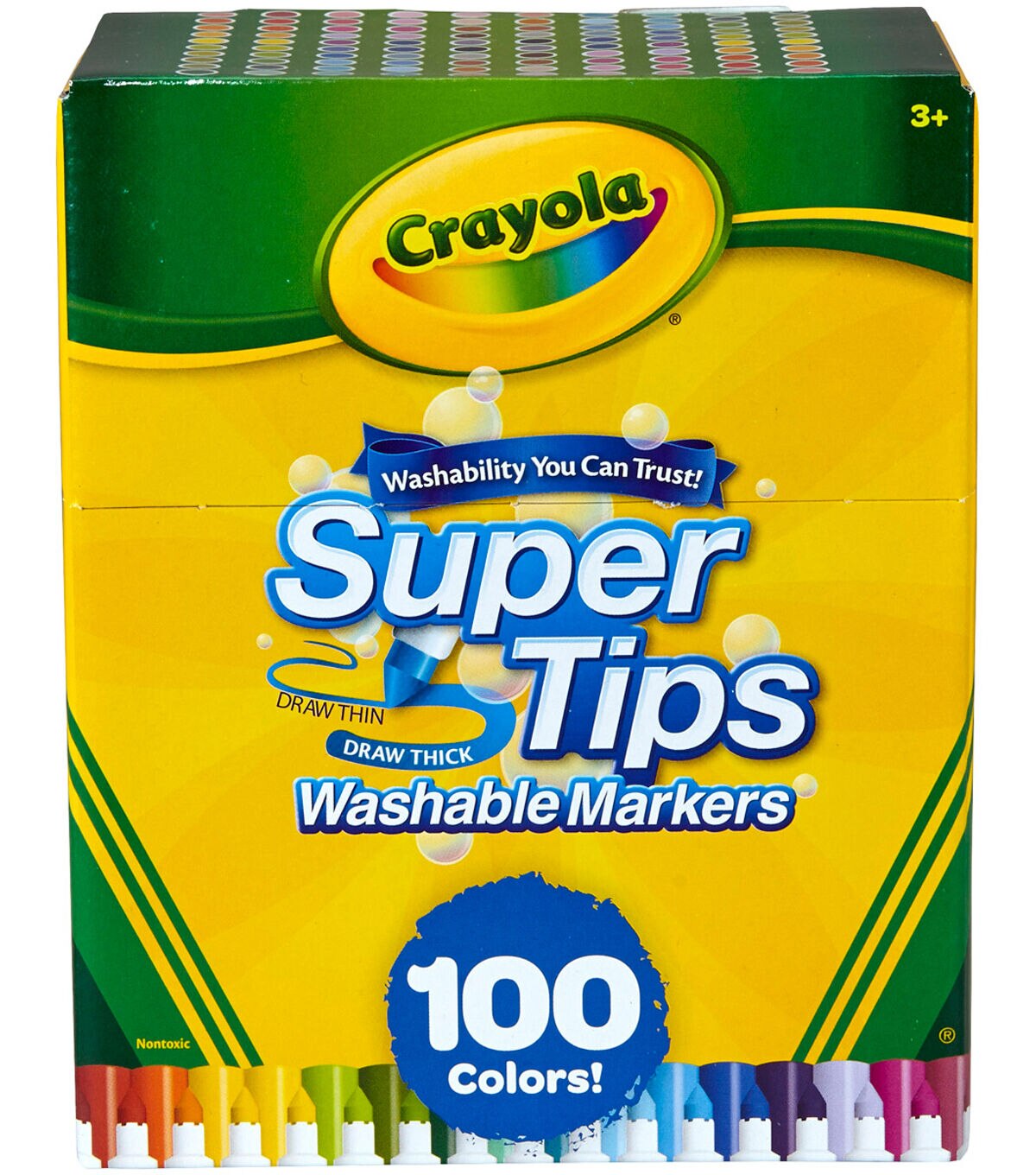 Crayola-Super Tips Washable Markers: 100 Pack. The durable conical tip allows for thin lines from the point and thicker lines when held at an angle. They lay down lots of brilliant color yet don't bleed through most paper. Specially formulated to easily wash from skin and most childrens clothing. This package contains 100 6.5 inch washable markers of assorted colors. WARNING: Choking Hazard. Not suitable for children under 36 months. Conforms to ASTM D4236. Imported.