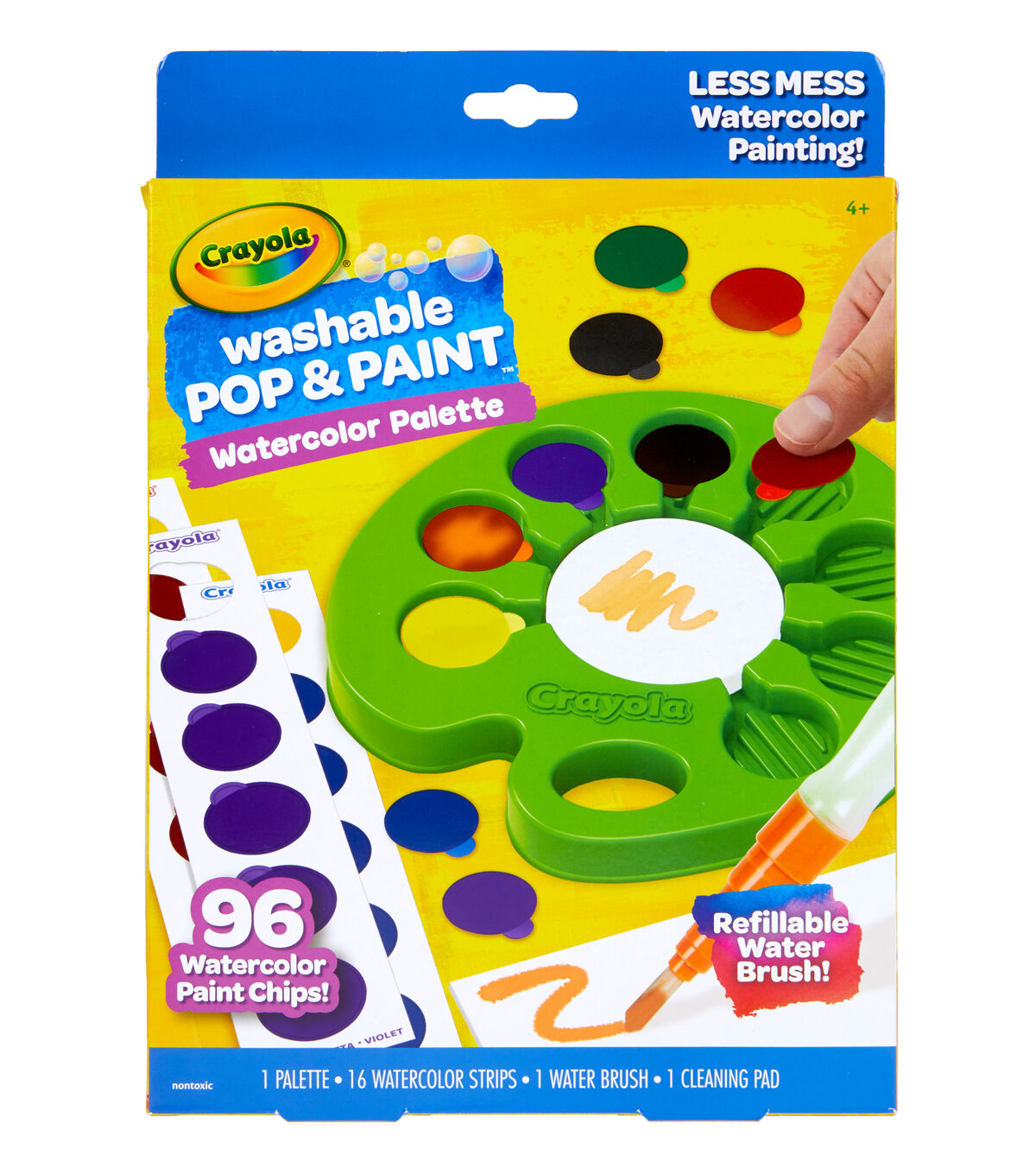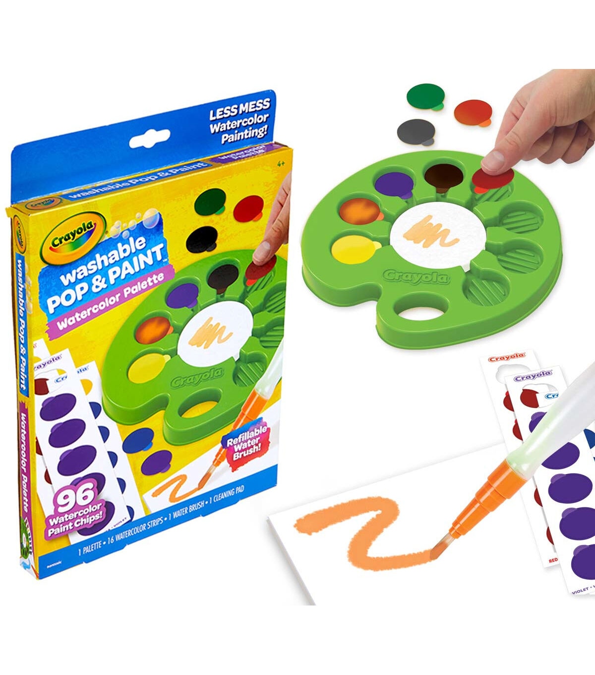 The Crayola Pop & Paint Watercolor Palette makes painting less messy and clean up a breeze! Each of the included 8 colors are printed on 96 disposable Watercolor Chips. Just pop out the chips, place them in the palette and use the Refillable Water Brush to activate the paint on each chip and you’re ready to create! Simply discard used chips and pop in new ones as needed. No spilling paint or cups of water and colors are washable from skin and fabric. Create wherever you go! The reusable palette comes with a handy sponge to help clean your brush between colors and trap excess water. Features 96 Disposable Paint Chips, a Refillable Water Brush, Cleaning Sponge, and Reusable Paint Palette. Makes a great gift for boys and girls, ages 4 and up.