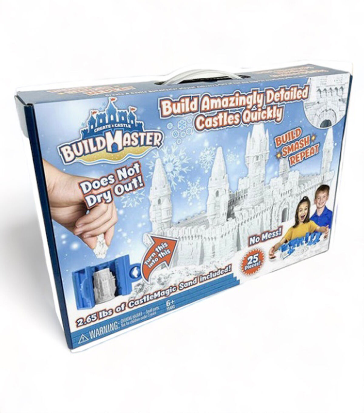 Create A Castle BuildMaster™ Indoor Activity Kit! NEW indoor activity set with a proprietary sand or snow compound to build amazingly detailed castles quickly! No mess, does not dry out with included storage bags, holds shape and offers limitless creativity. Based on our award winning 2020 Toy Of The Year outdoor technology, we are excited to bring outdoor play indoor! Become a skilled sculptor in no time with mind blowing details that our molds will reveal. Play for minutes or hours from the comfort of your home! When you are finished, included pouches prevent compound from drying out! Build a single tower or an entire fortress, it's entirely up to you! Watch video tutorials for tips how to mold and sculpt using our proprietary sand and snow for the perfect castle. Build, Smash and Repeat over and over! For ages 6 and up.
