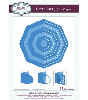 Jamie Rodgers In and Out Collection Octagons Craft Die is part of an elegant collection of versatile, high quality steel dies that allow you to create shapes, frames, apertures, partly cut or cut & fold elements, perfect for adding dimension and interest to your creative makes! 11 die set. Largest die 11.7 x 11.7 cm. Imported.