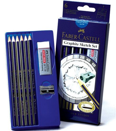 FABER-CASTELL-Graphite Sketch Set. These graphite pencils are perfect for drawing, sketching, and hatching and feature high- quality, specially SV bonded leads to help prevent breakage. This package contains six pre-sharpened graphite pencils (2H, HB, B, 2B, 4B, 6B), one metal sharpener, and one dust-free art eraser. Conforms to ASTM D4236. Imported.