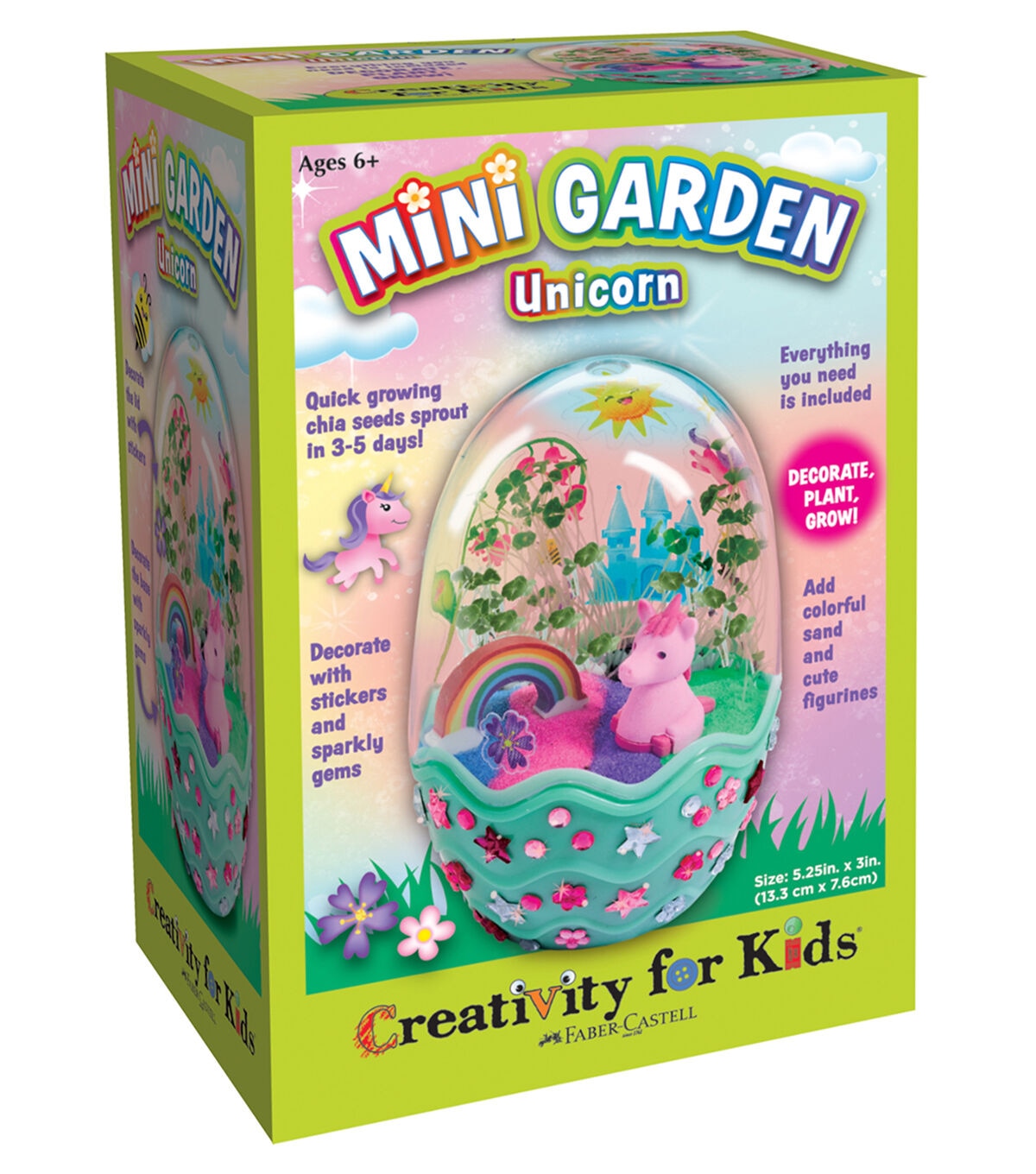Decorate, plant and grow your own mini garden in an egg-shaped mini environment. Complete with everything you need to grow your own mini garden, each kit includes potting mix, quick growing chia seeds, themed stickers, dimensional accents, fun mini figures and decorative sand. Mini Gardens available in 3 themes – Unicorn, Mermaid or Dinosaur – collect all three! Chia seeds start sprouting in 3-5 days. Finished gardens measure 5 ¼” h x 3” w.