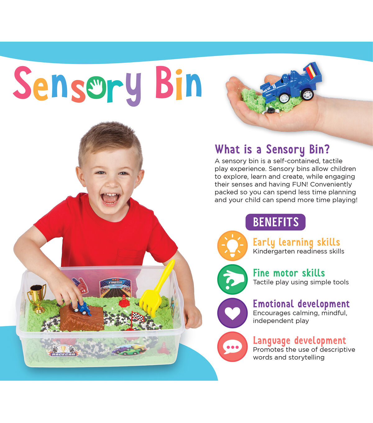 - SENSORY BIN - Sensory bins allow toddlers to discover, imagine and learn while engaging their senses. Place the self-contained sensory bin on a tablecloth or towel to scoop, sort and build for easy clean up and endless hours of hands-on pretend play!