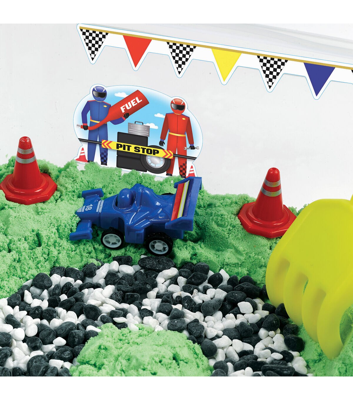 - PRETEND PLAY CAR TRACK - Start your engines to zip, zoom and race around a DIY car track in a play bin filled with sensory sand, gravel, 2 race cars and more! This self-contained car playset is a hands-on pretend play experience for toddlers ages 3+