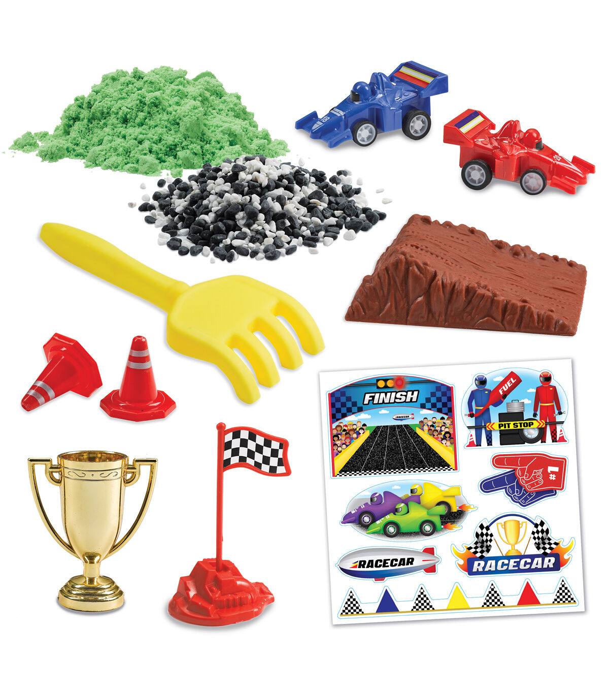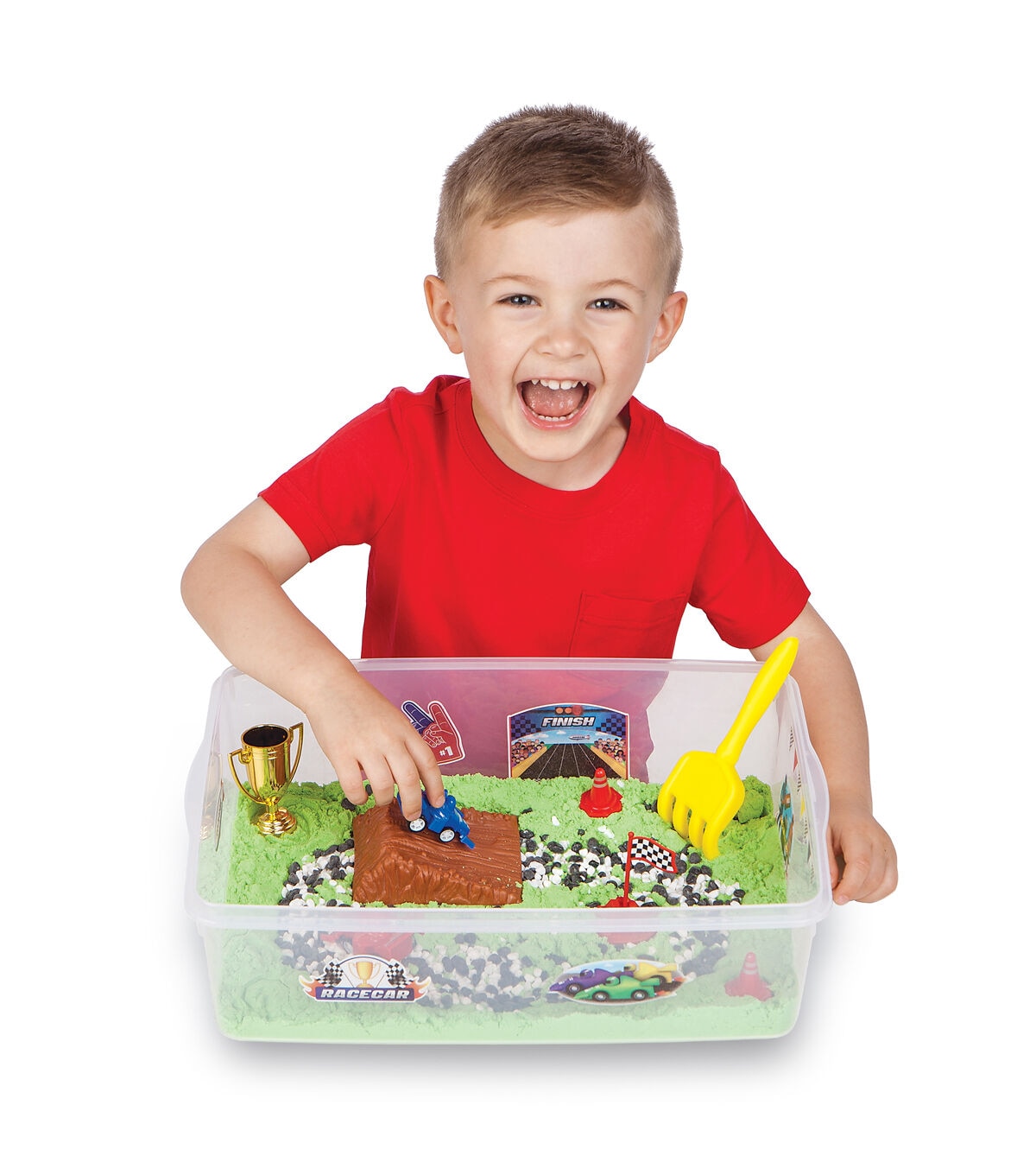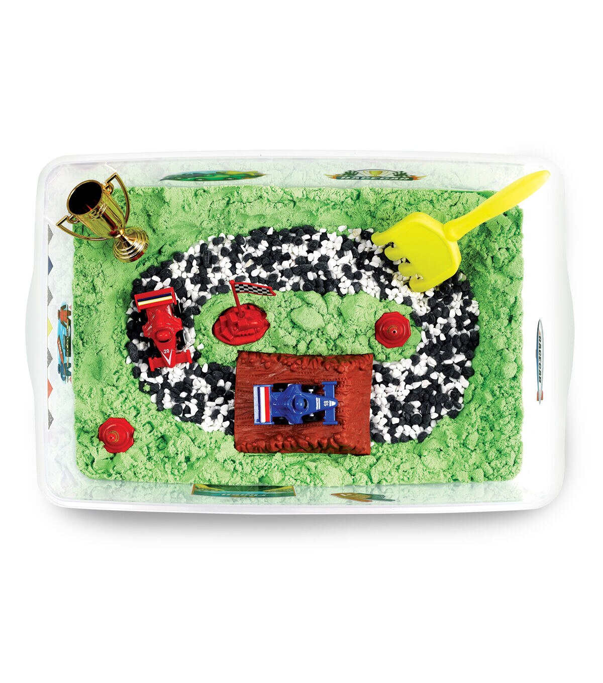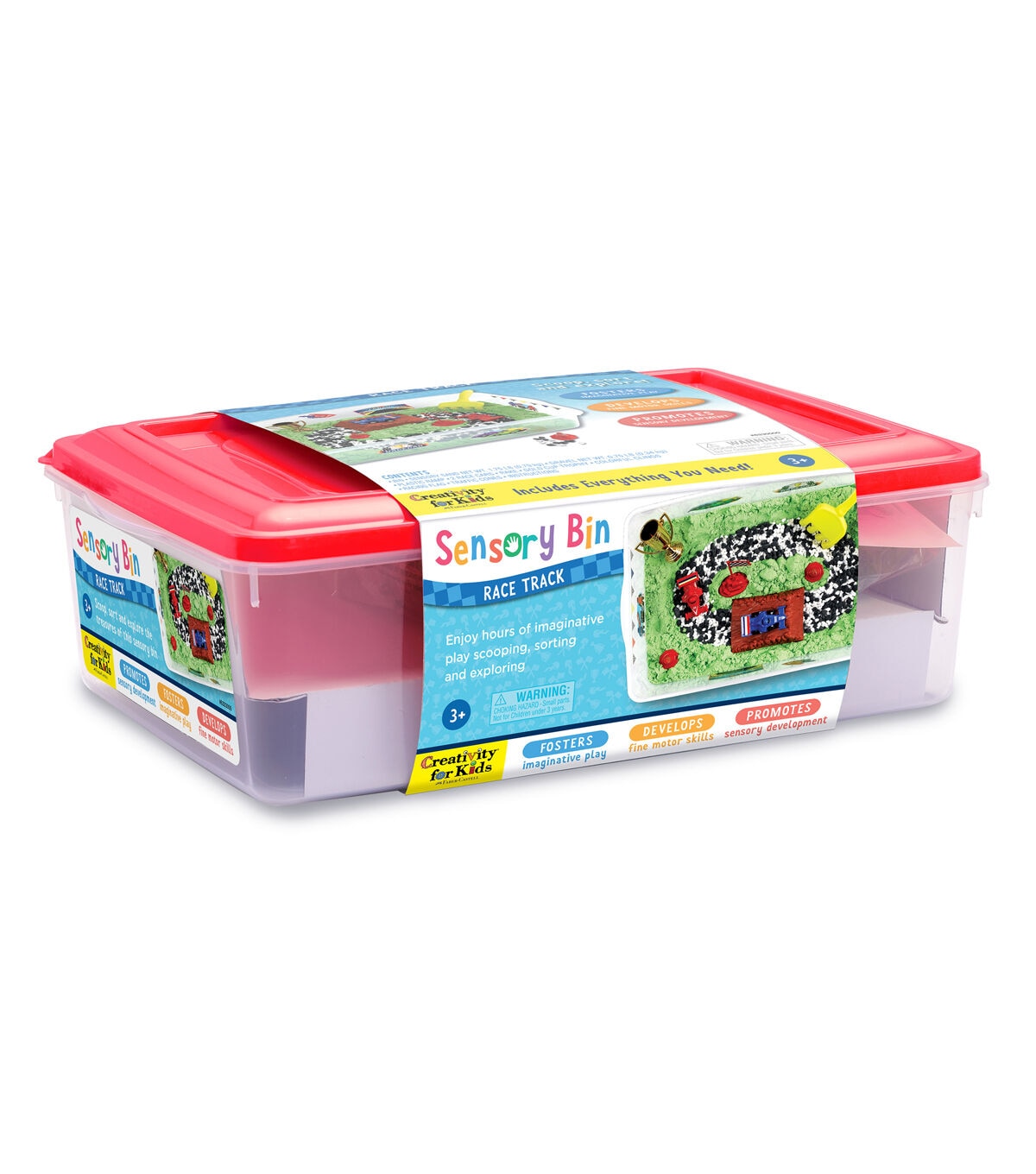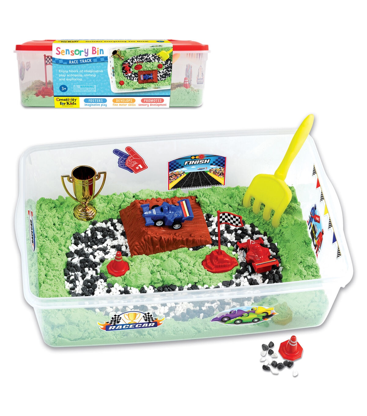 Start your engines to zip, zoom and race around a self-contained race track with the Creativity for Kids Sensory Bin Race Track! Engage the senses with a self-contained race track toy. This complete pretend play experience builds kindergarten readiness skills and promotes fine motor skill development all while having fun! Just add imagination for engaging, creative and hands-on play. Sensory bins offer endless hours of imaginative play as kids “build their way” to create a DIY toy car track. Everything you need is included for a unique sensory experience! This complete kids sensory toy includes green sensory sand, gravel, plastic ramp, 2 race cars (red and blue), rake, gold cup trophy, colorful clings, racing flag and traffic cones all conveniently packed in a bin with lid for easy storage (Bin measures approx. 14.5" W x 10.25" L x 4.75" H). For easy cleanup, place your sensory bin on a tablecloth, towel or play mat and scoop, sort, dig and build for endless hours of hands-on imaginative play! All sensory bin fillers are carefully selected, and safety tested to provide the best at home play activity for preschoolers. Have fun while building creative confidence! Since 1976, Creativity for Kids has proudly made fun and creative experiences today to nurture children's confidence for life. The Creativity for Kids Sensory Bin Racetrack is recommended for toddlers, ages 3+