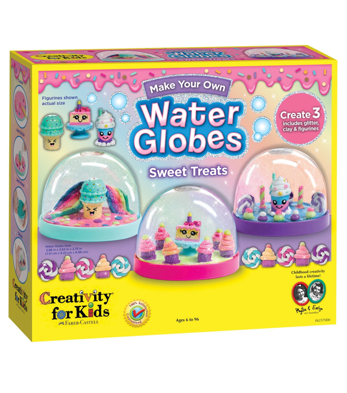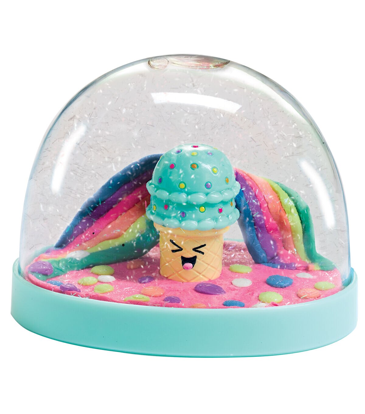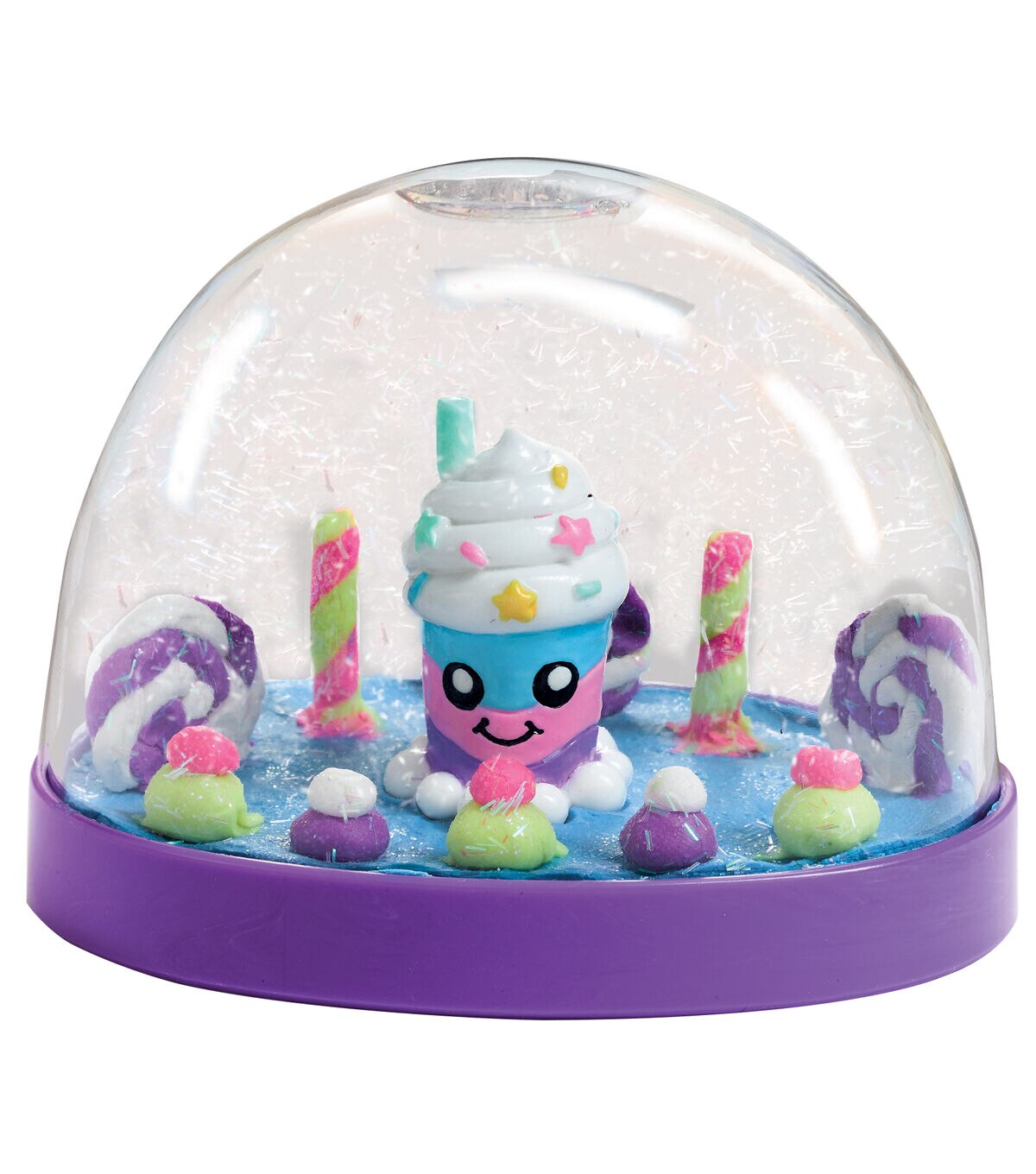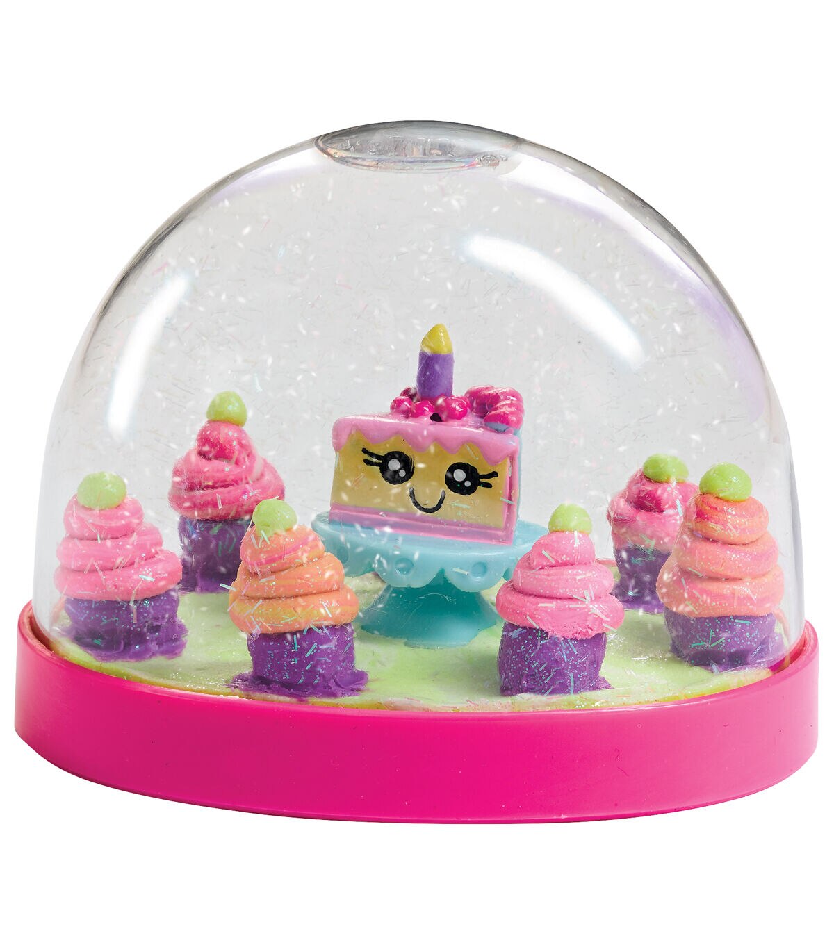 Create 3 sweets themed water worlds using the included sculpting tools and bright modeling clay in neon pink, neon yellow, neon violet, bright blue and white. You can even mix colors together to create new ones. Accessorize your water globes with 3 sweet figurines – a birthday cake, milkshake and an ice cream cone. Sprinkle glitter to create the perfect dessert topping. Also includes a handy funnel for filling, 3 display trays and waterproof glue to seal your globes. Working with clay is a great way to develop fine motor skills and promote creativity. Child-safe plastic globes measure 2 7/8” W x 3 5/8” H x 2 3/4" L.
