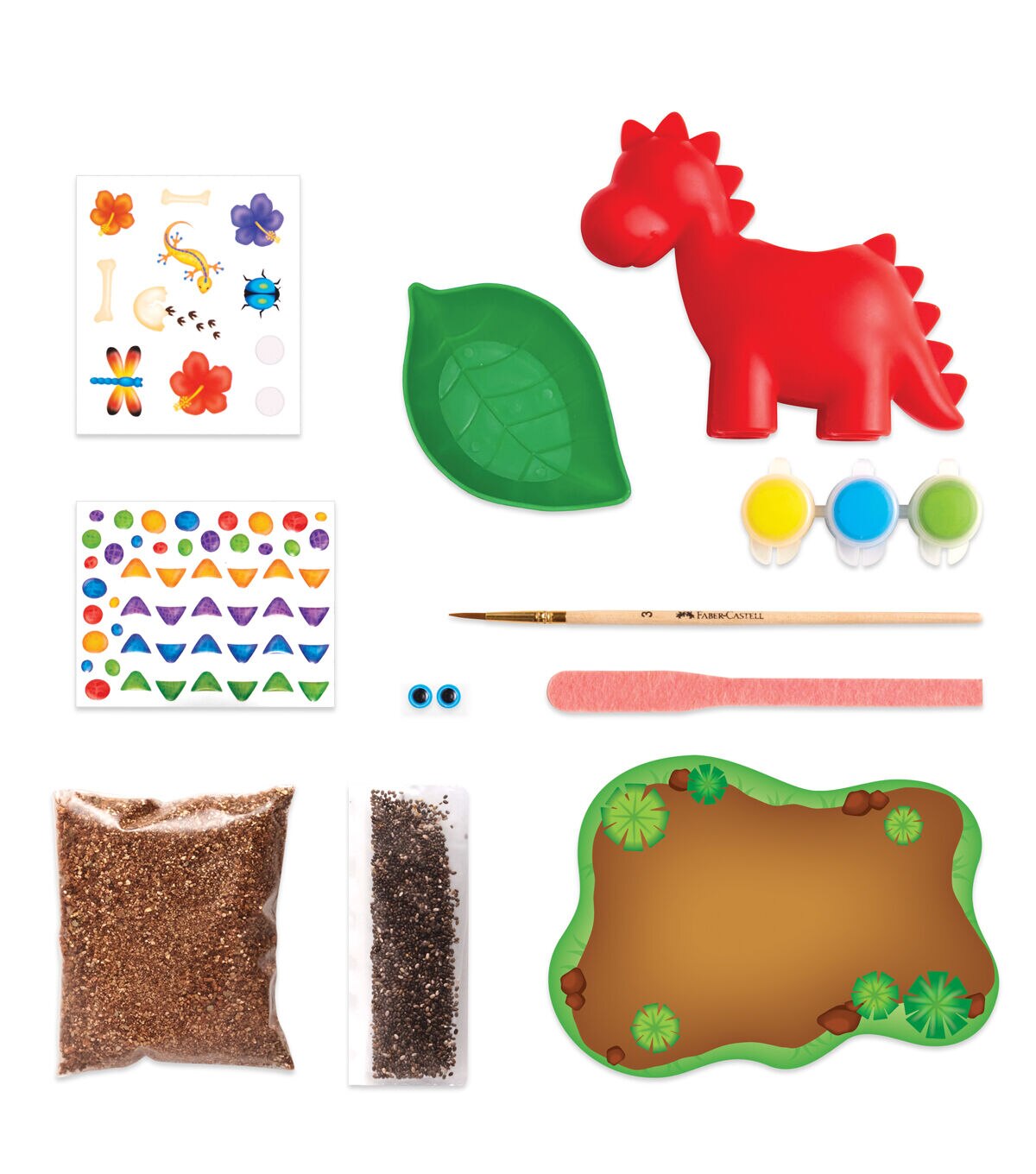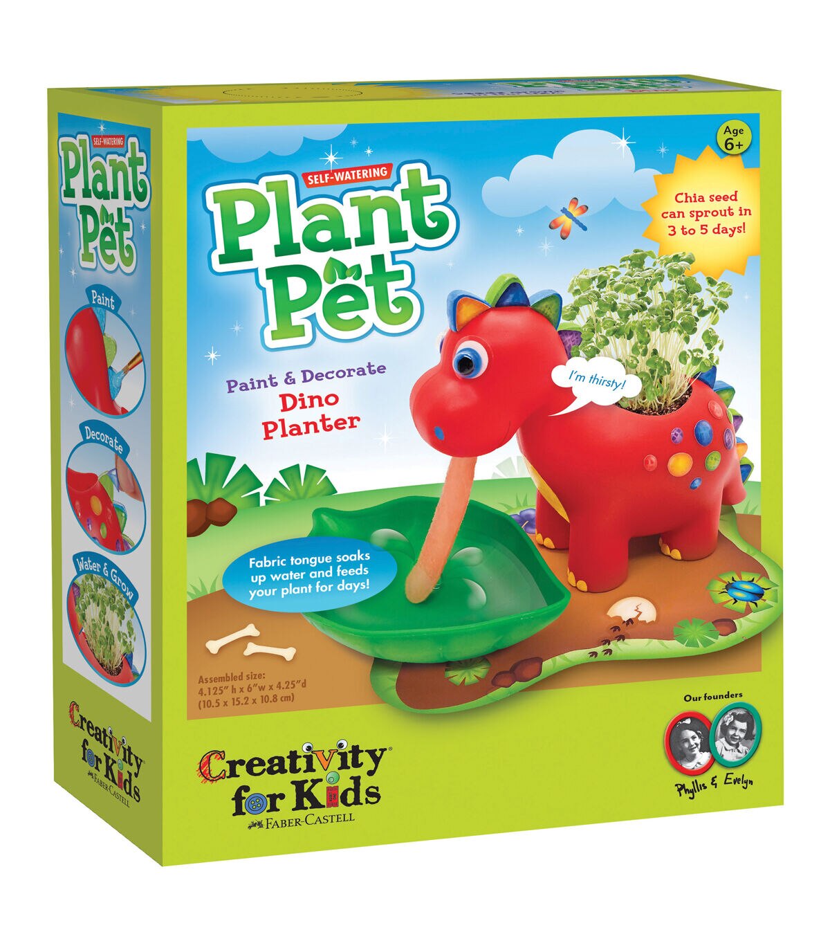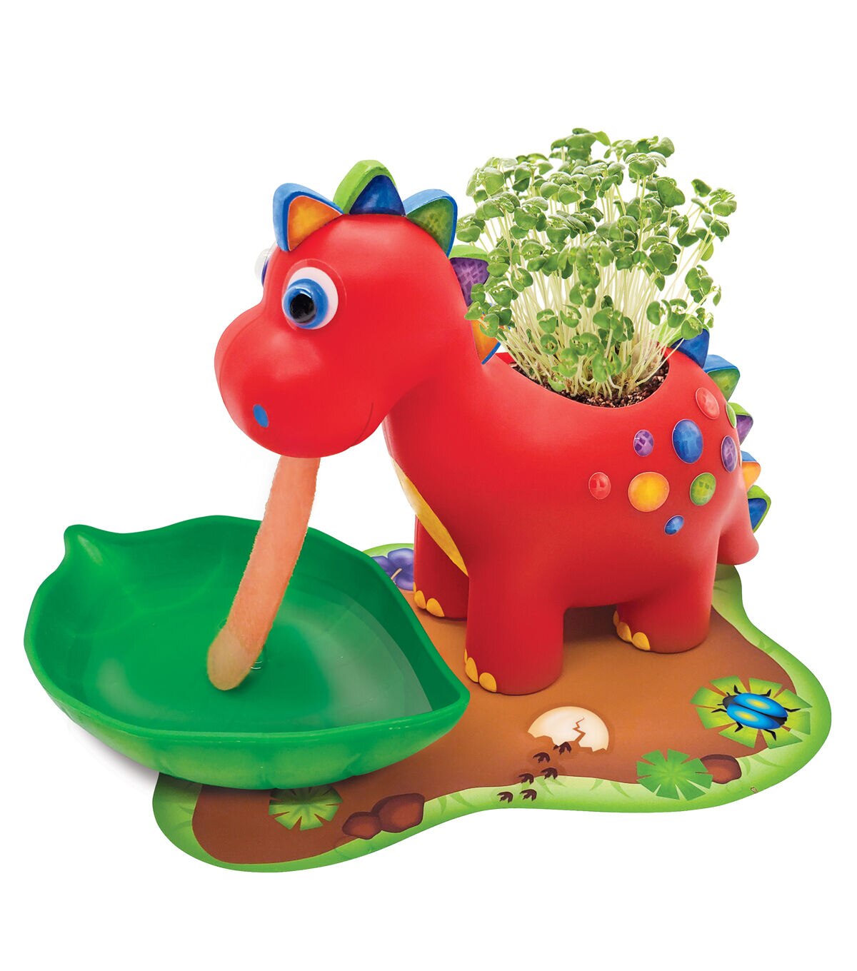 Craft, plant, water and grow! Get kids excited about gardening with this cute dinosaur chia garden. This adorable dino planter comes ready to paint and decorate to transform into your very own plant pet. The fast-growing chia seeds are grown in the USA and should sprout in 3 to 5 days! The plant pet is self-watering and easy to grow. Simply add water to the leaf-shaped drinking bowl and the dinosaur’s fabric tongue will feed your plant for days. Caring for a garden has never been easier! Save the box and recycle creatively! The back of the box contains a perforated play mat to cut out and decorate to create a prehistoric habitat for your plant pet to live in. Keep your garden going to enjoy throughout the year! There are enough seeds included for 2 plant life cycles. When all the seeds have been used, additional chia seeds can be found at your local garden center. Encourage kids to put down their devices and reconnect with nature with the Self-Watering Plant Pet Dinosaur Garden kit. Everything you need to spark curiosity, inspire imagination and grow your own garden, is included in this unique gift for boys and girls to enjoy!