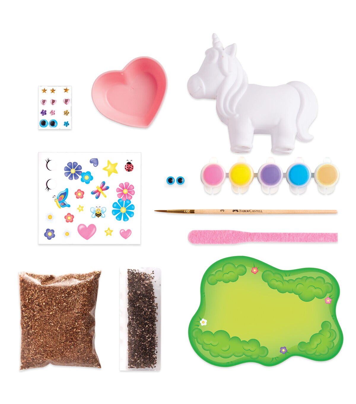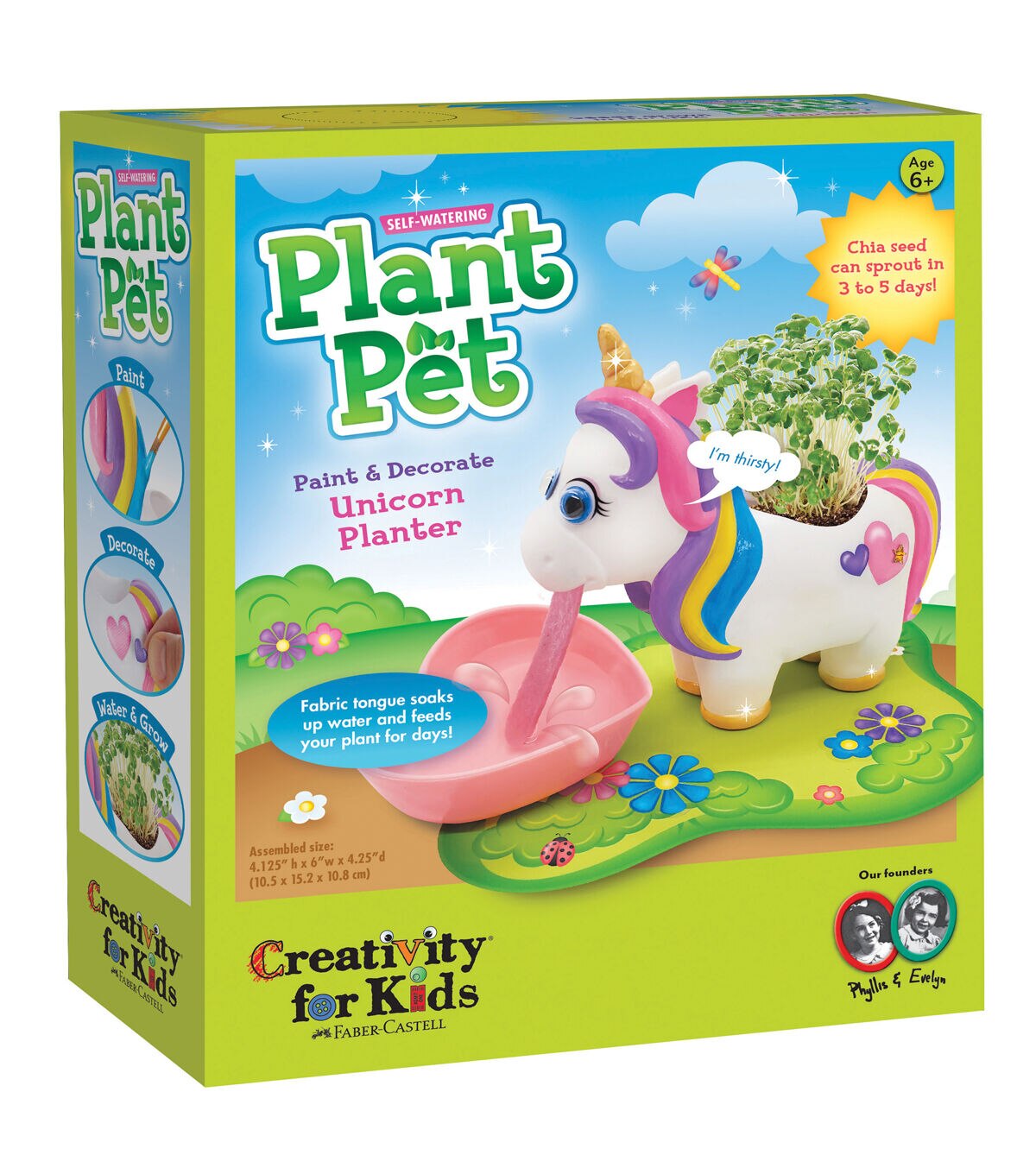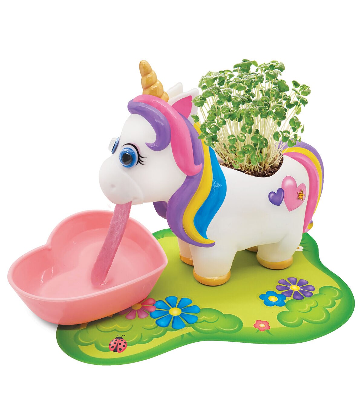 Craft, plant, water and grow! Get kids excited about gardening with this cute unicorn chia garden. This playful unicorn planter comes ready to paint with bright colors and decorate with fun embellishments, to transform into your very own plant pet. The fast-growing chia seeds are grown in the USA and should sprout in 3 to 5 days! The plant pet is self-watering and easy to grow. Simply add water to the heart-shaped drinking bowl and the unicorn’s fabric tongue will feed your plant for days. Caring for a garden has never been easier! Save the box and recycle creatively! The back of the box contains a perforated play mat to cut out and decorate to create a magical green field for your plant pet to live in. Keep your garden going to enjoy throughout the year! There are enough seeds included for 2 plant life cycles. When all the seeds have been used, additional chia seeds can be found at your local garden center. Encourage kids to put down their devices and reconnect with nature with the Self-Watering Plant Pet Unicorn Garden kit. Everything you need to spark curiosity, inspire imagination and grow your own garden, is included in this unique gift for everyone to enjoy!
