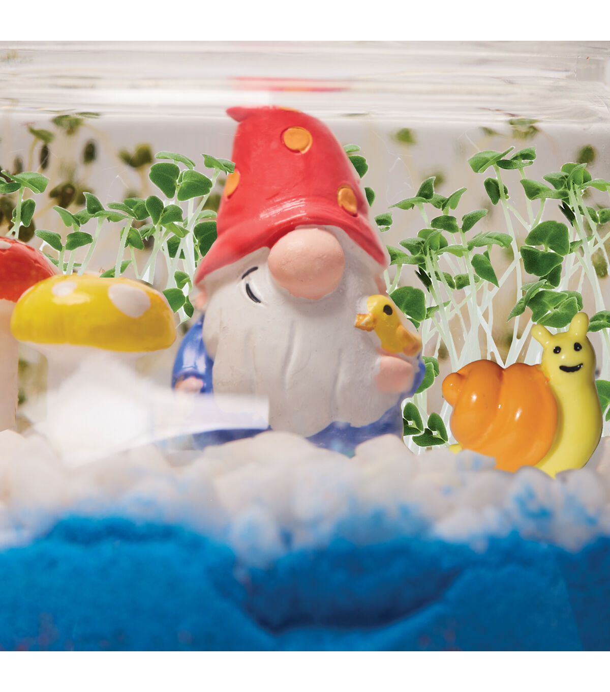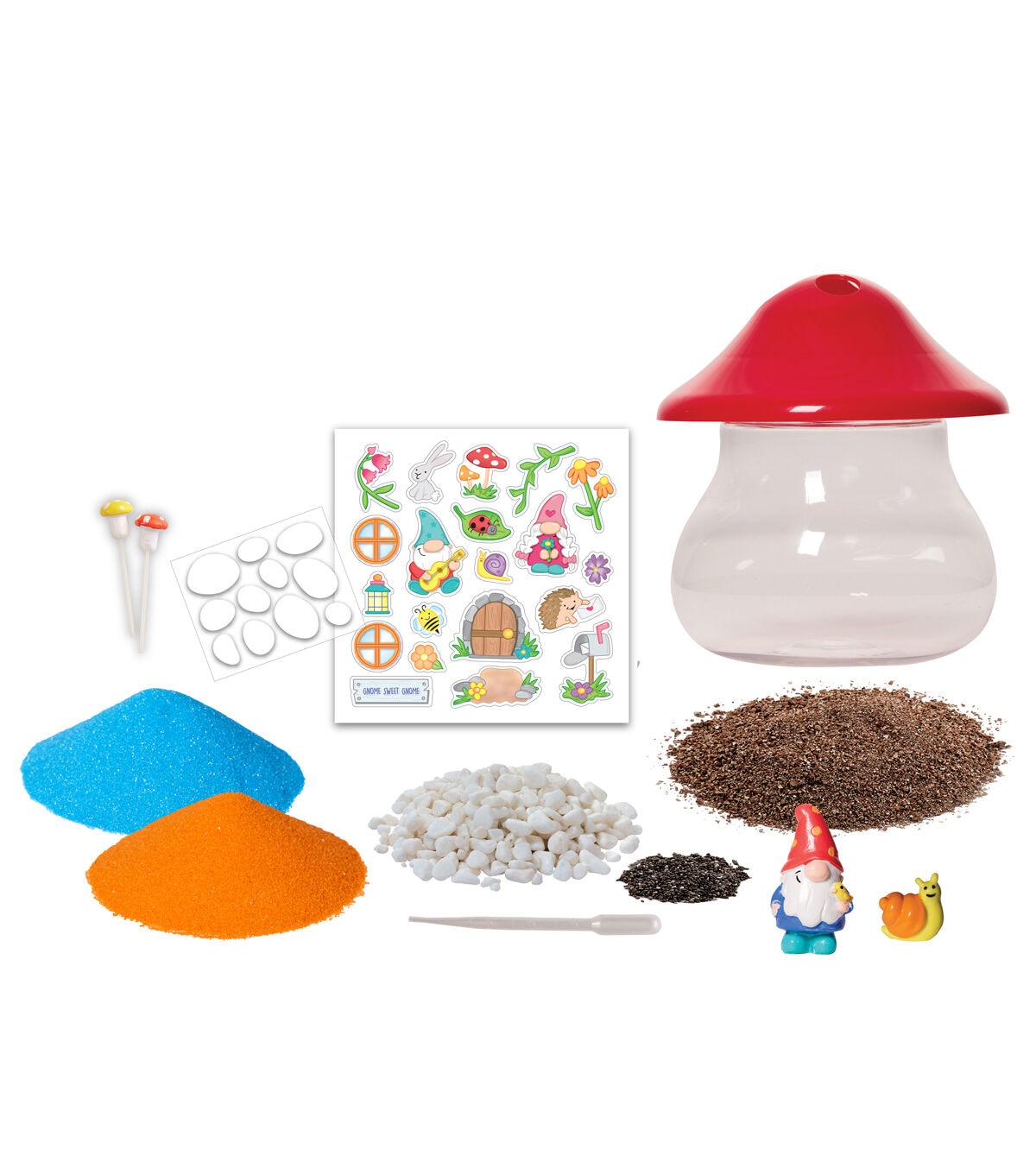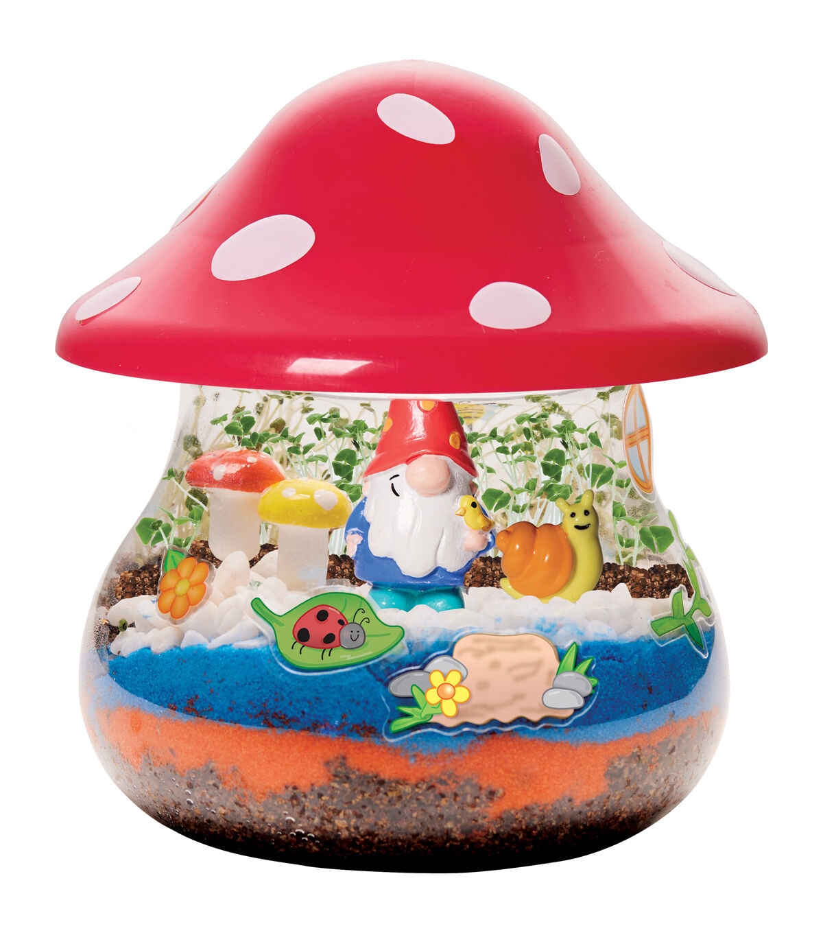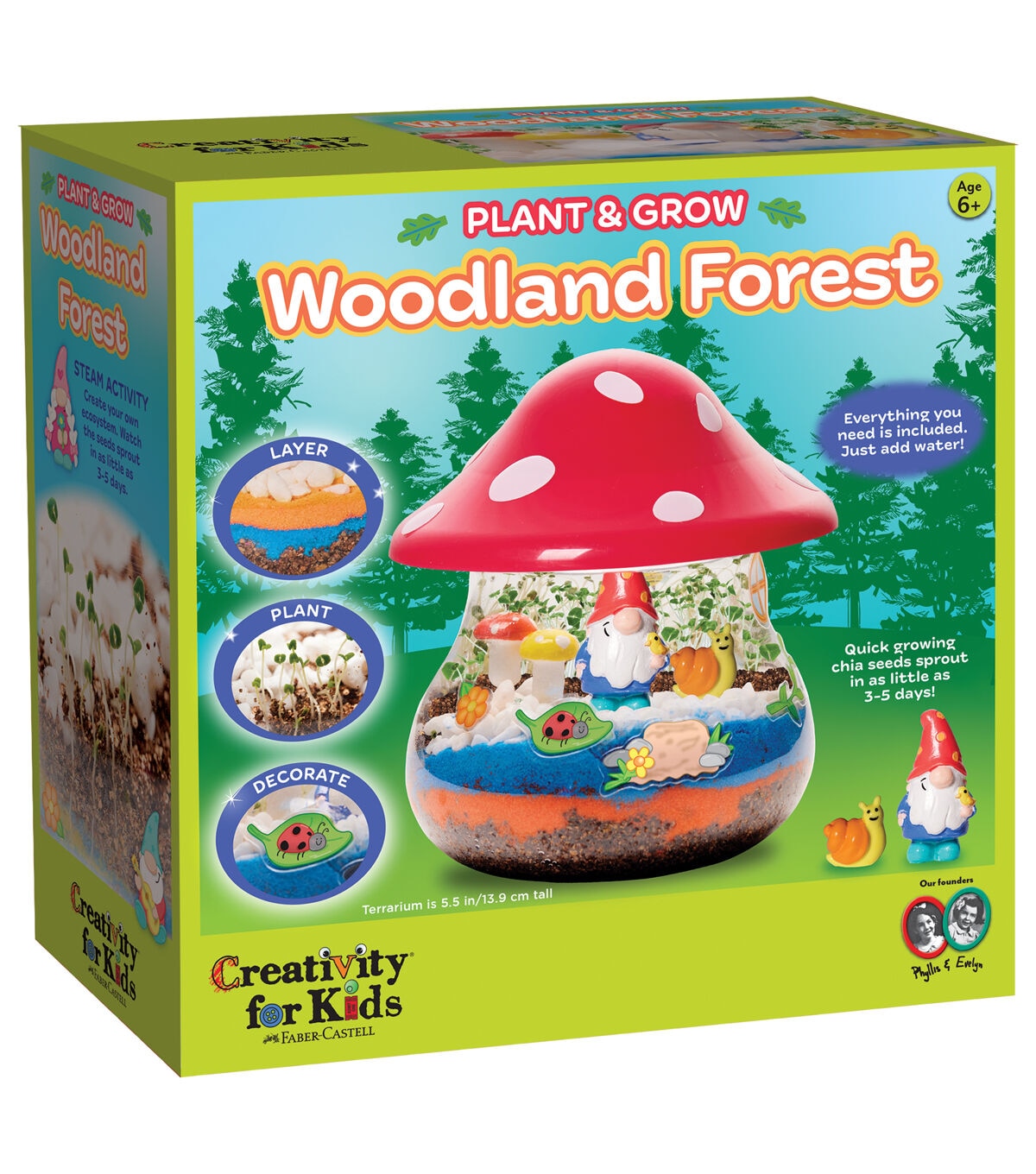 Foster the love of nature with this whimsical mushroom-shaped terrarium. Plant & Grow Woodland Forest comes ready to decorate, plant and grow. Everything you need is included. Just add water! Layer potting mix and colorful sand inside the mushroom container, plant easy-to-grow chia seeds, add water and decorate the outside with colorful stickers. You can even turn it into a sweet little gnome home! Arrange the friendly gnome, happy snail and mini mushrooms inside of the terrarium. Find the perfect sunny spot to place your woodland forest terrarium and watch as it grows. Kids will love creating their own ecosystem with this STEAM activity and watching their garden come to life in as little as 3 to 5 days! The fast-growing chia seeds and potting mix are non-toxic and from the USA. There are enough seeds included for 2 plant life cycles. When all the seeds have been used, additional chia seeds, soil and sand can be found at your local craft and garden supply stores. This hands-on activity encourages independent play and creative confidence while developing nurturing skills, responsibility and patience. Finished terrarium measures 5½” high x 5” wide.