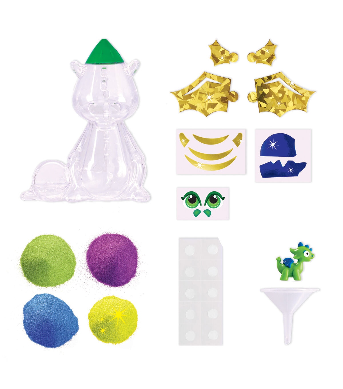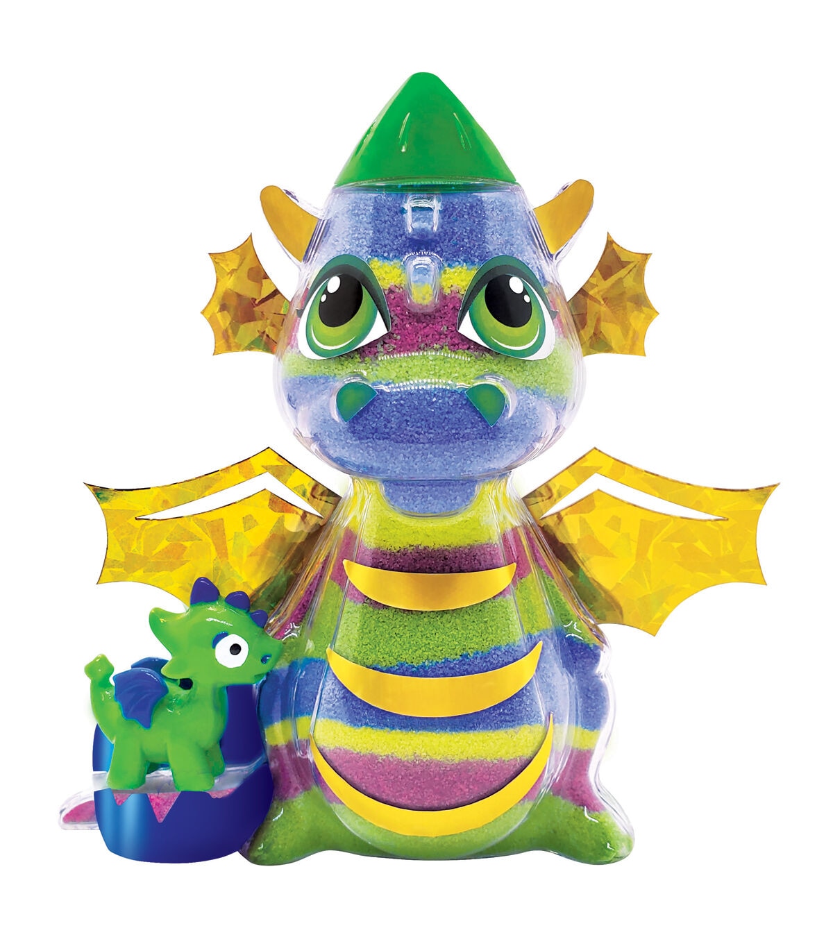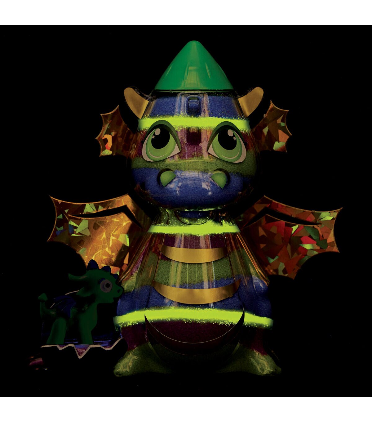 Layer, decorate and play with Sand Art! Fill your Dragon with neon and glow sand. Add fun foil accents and glow stickers then add your little Dragon friend for extra fun! Includes a unique bottle, 4 colors of sand and an easy-to-use funnel. Collectible figurines for added play value. Box is repurposed as a less-mess, more fun crafting station.
