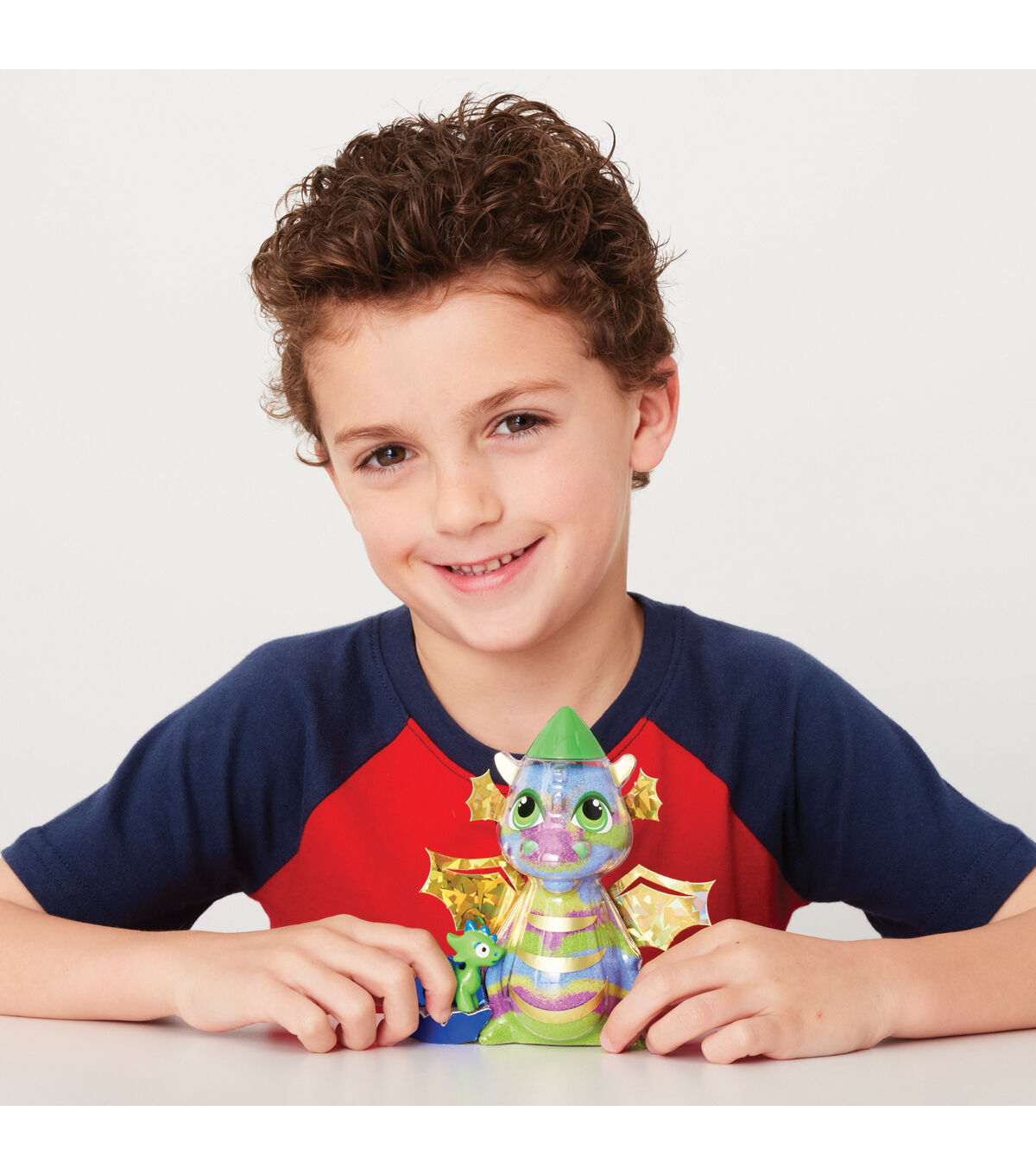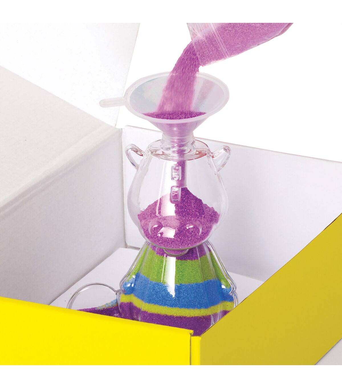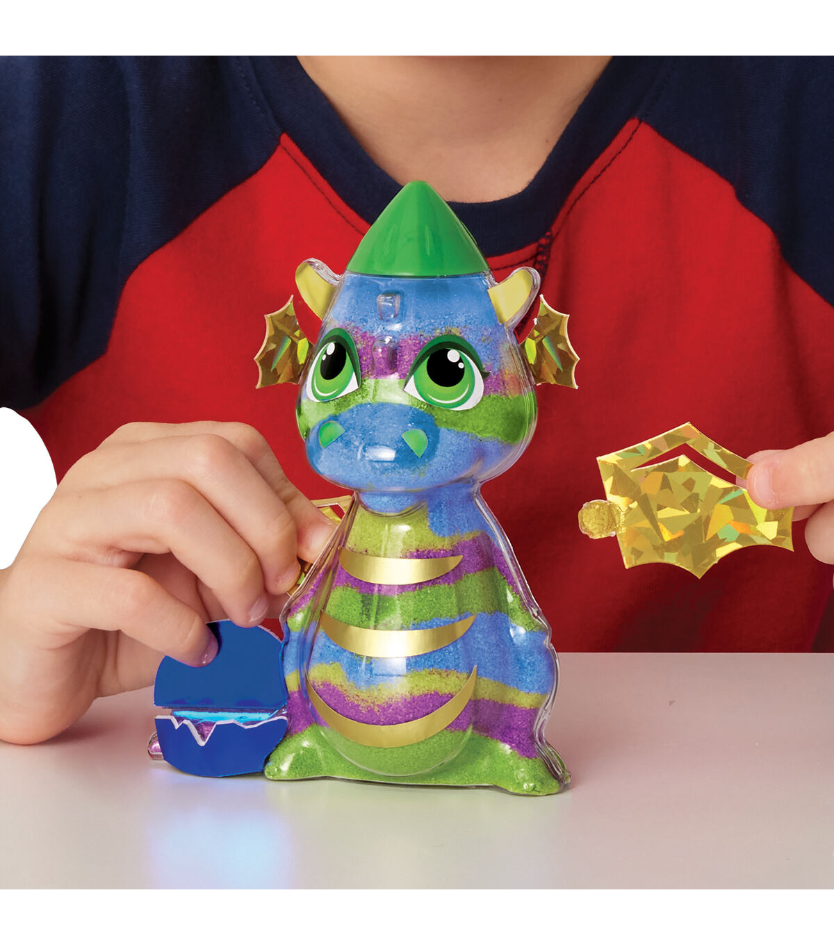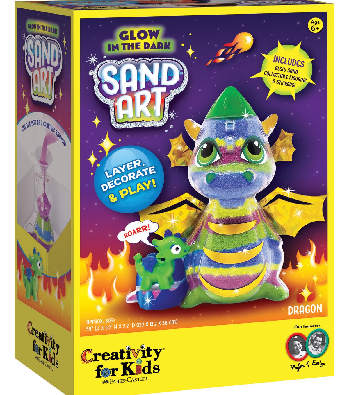 Layer, decorate and play with Sand Art! Fill your Dragon with neon and glow sand. Add fun foil accents and glow stickers then add your little Dragon friend for extra fun! Includes a unique bottle, 4 colors of sand and an easy-to-use funnel. Collectible figurines for added play value. Box is repurposed as a less-mess, more fun crafting station.